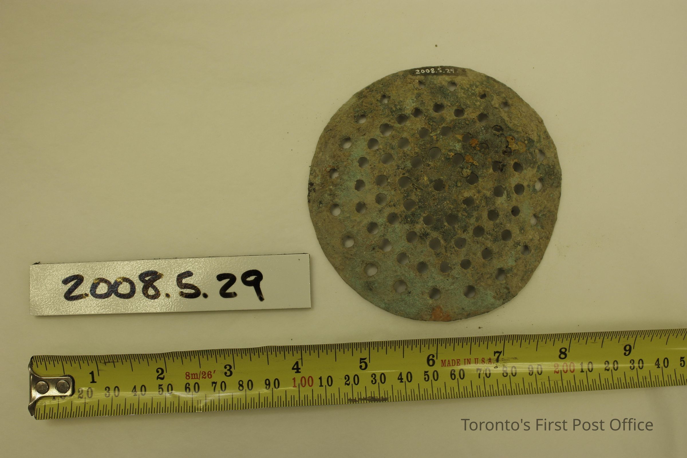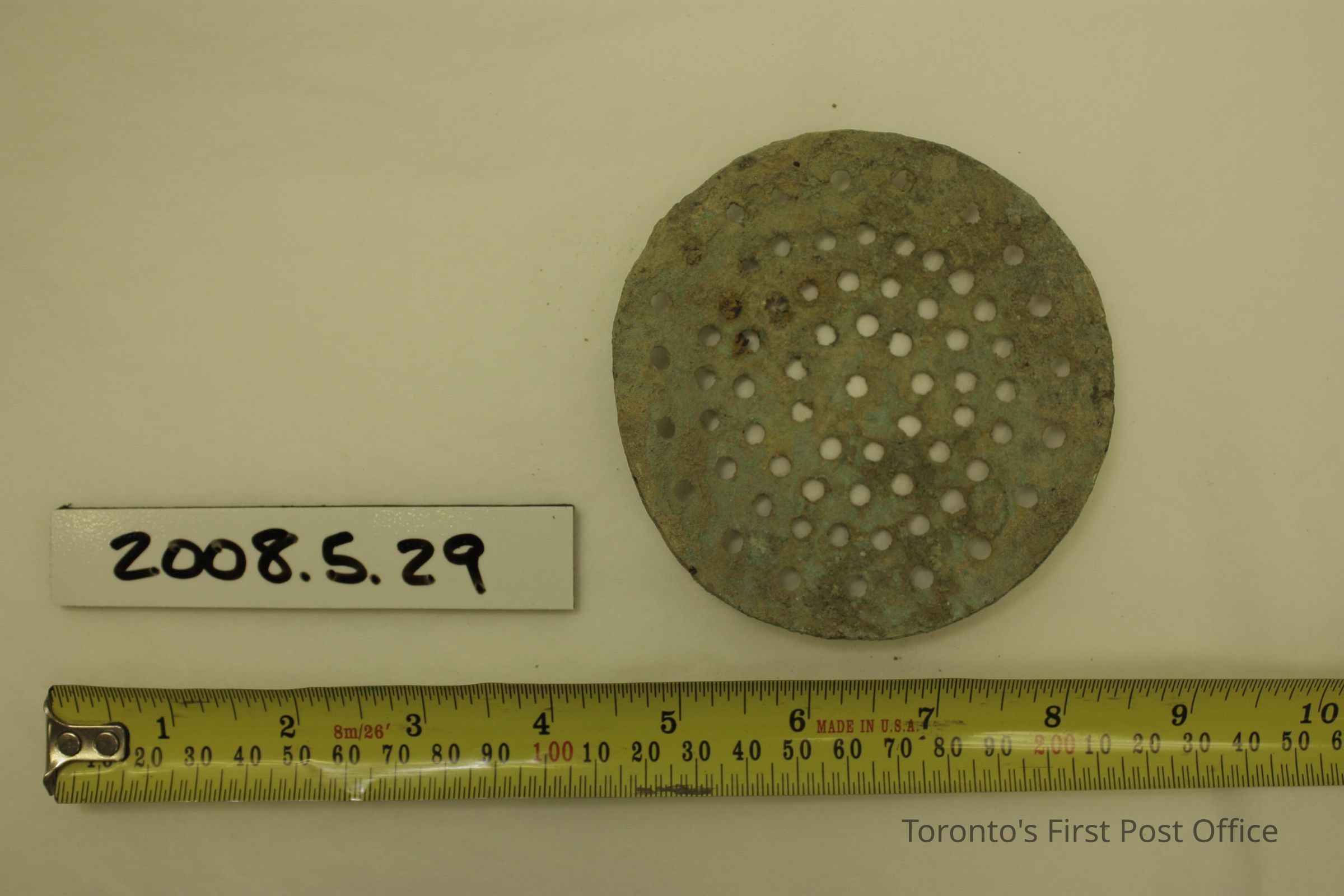 Metal colander-type object, possibly a drain cover; holes throughout; round; slightly convex; covered with residue and debris.Dimensions