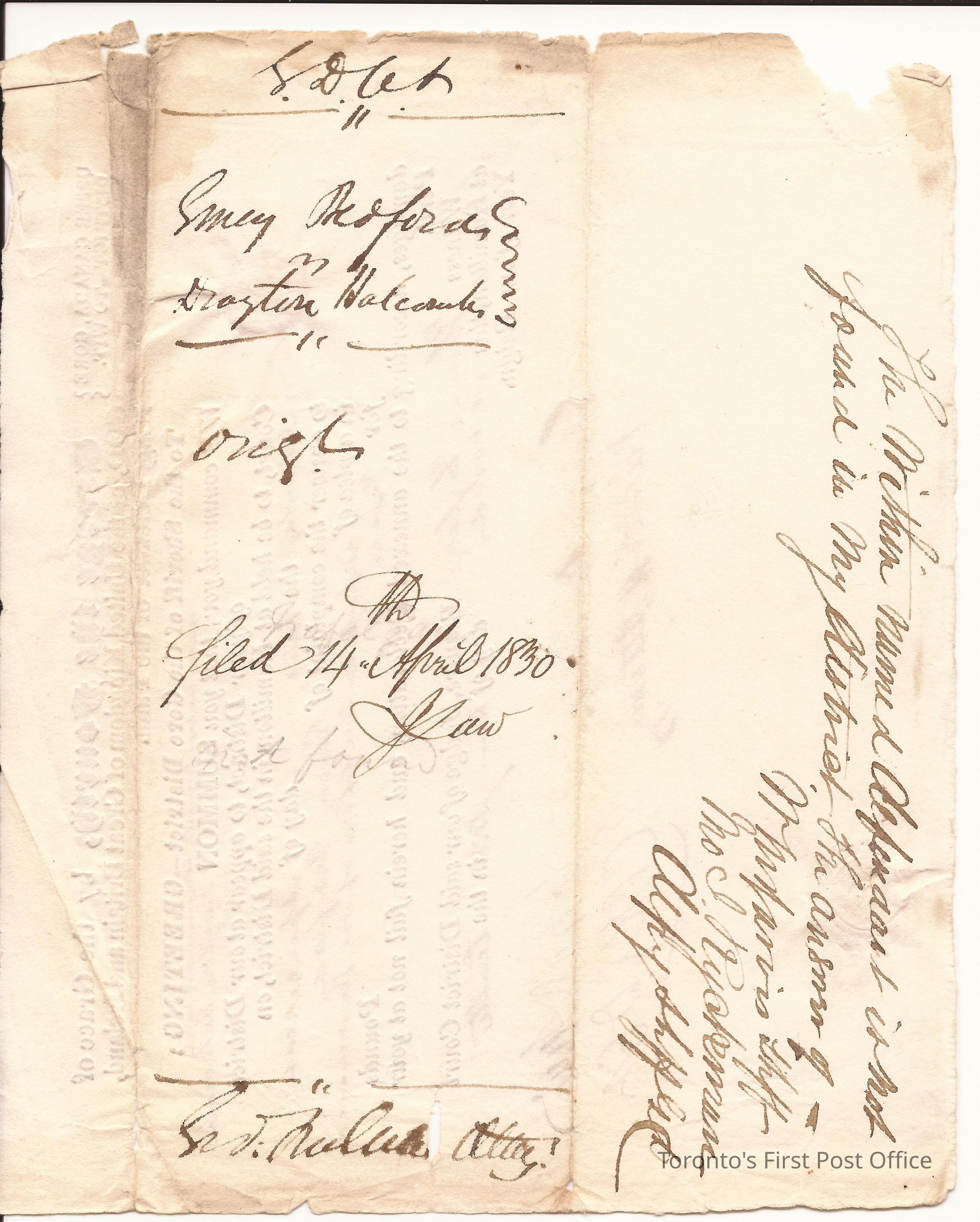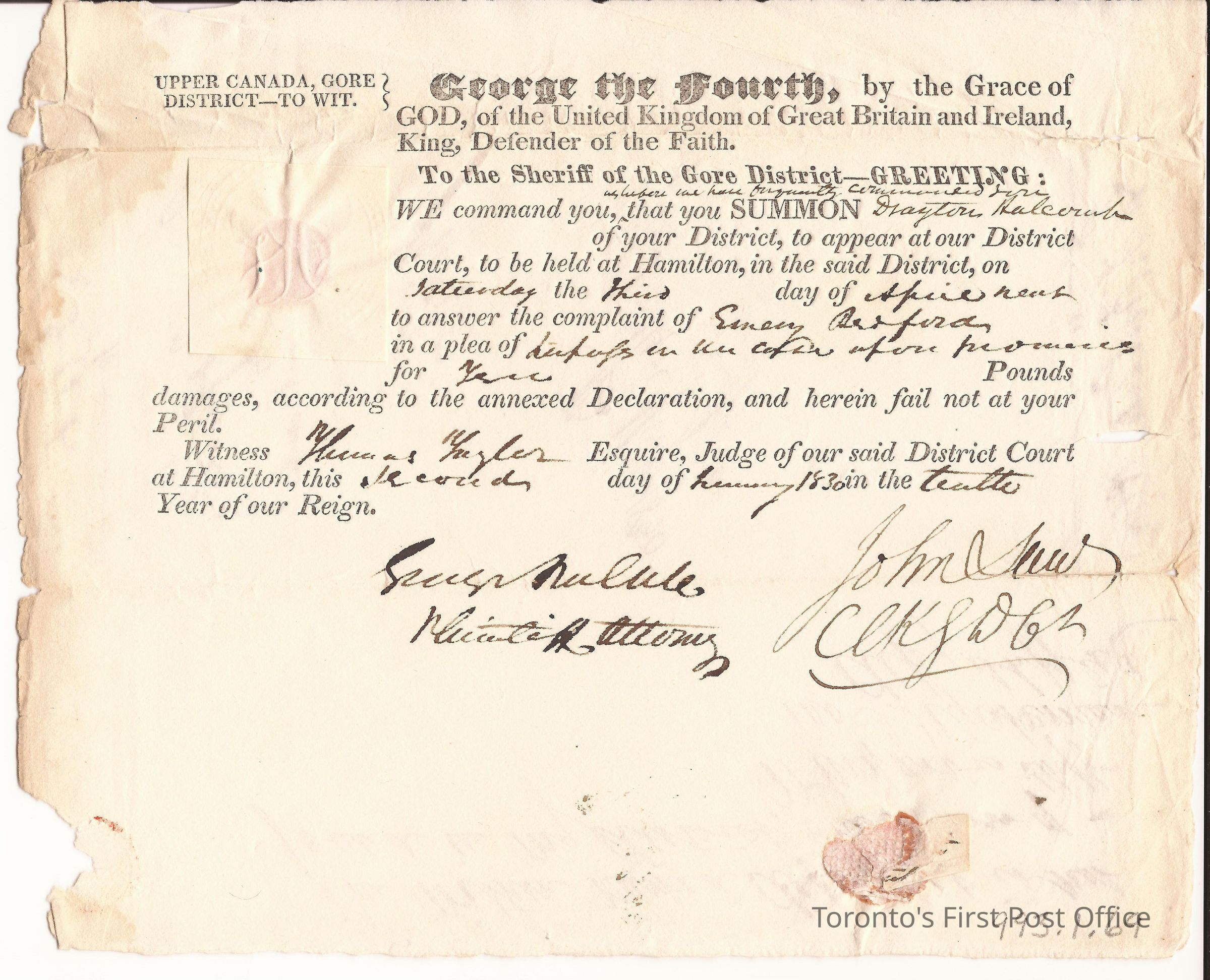 Writ of summons; printed and manuscript; Gore District; commanding the Sheriff to take Drayton Halcourt to appear at the district court in Hamilton in answer to a complaint of Emery Redford; signed by John Saw, Clerk of the Gore District Court; dated 2 January 1830; red wafer seal; 1 pp.Dimensions