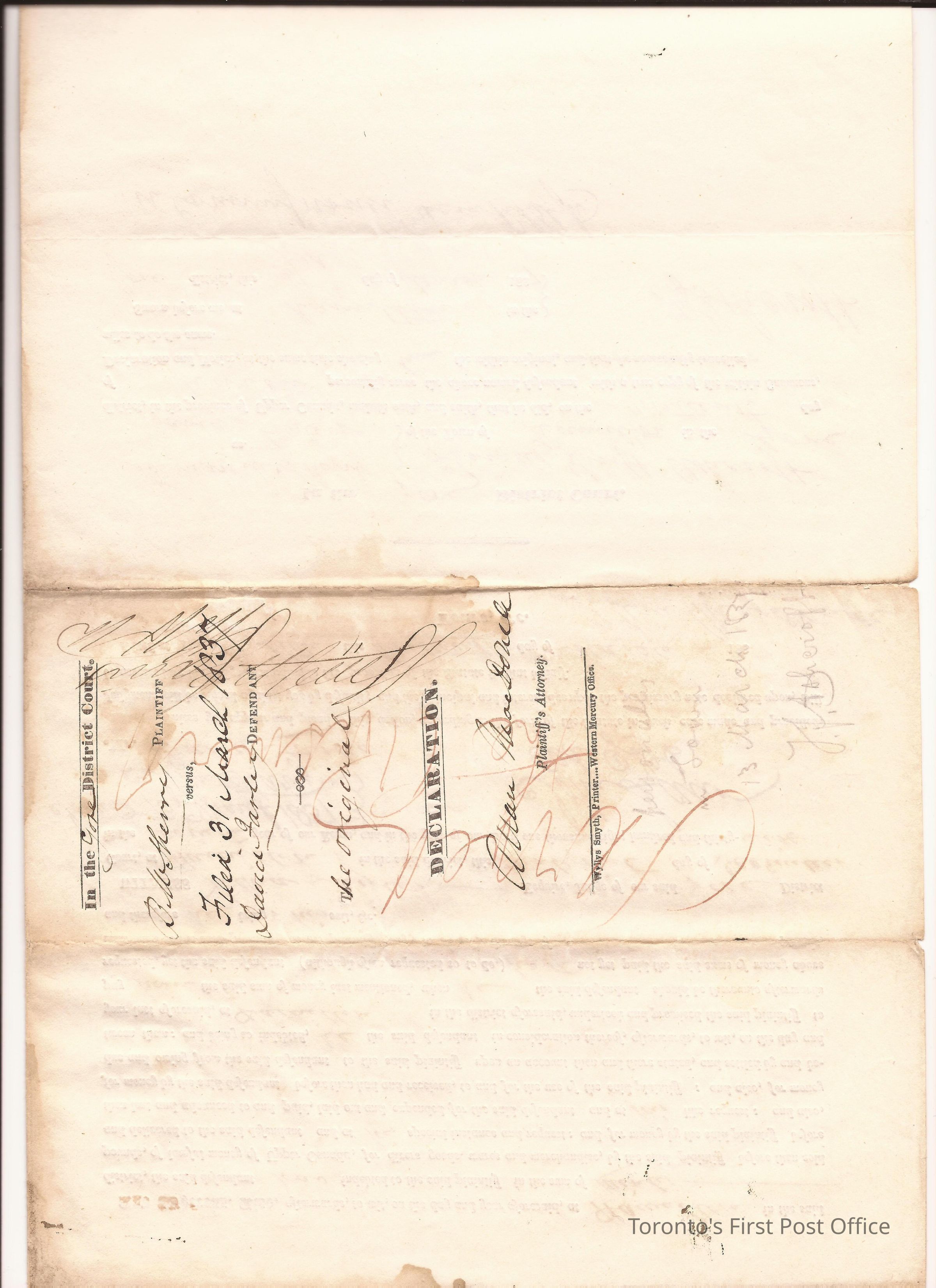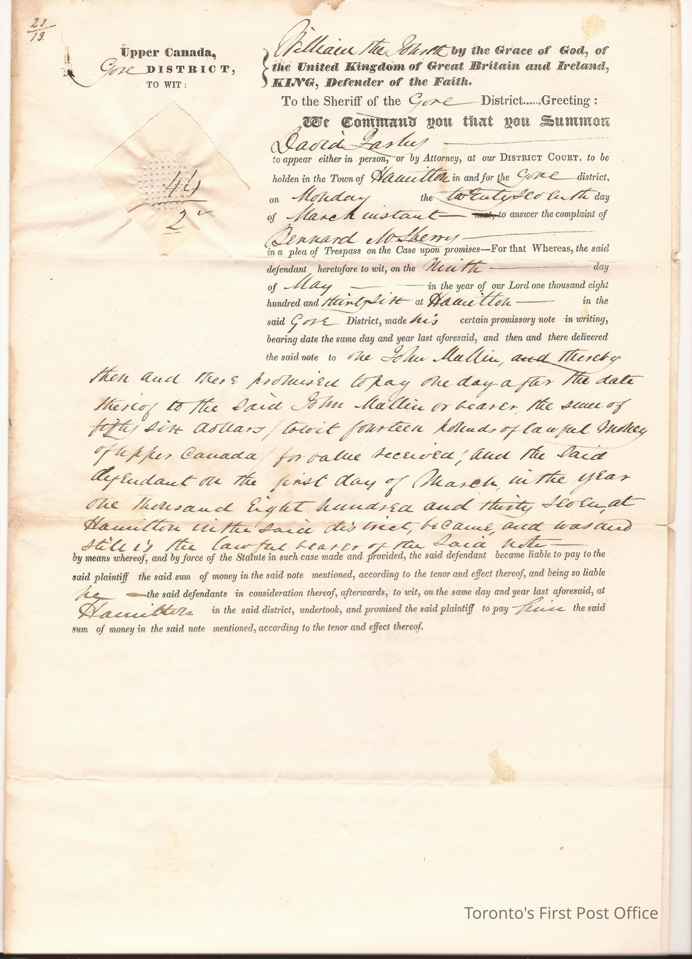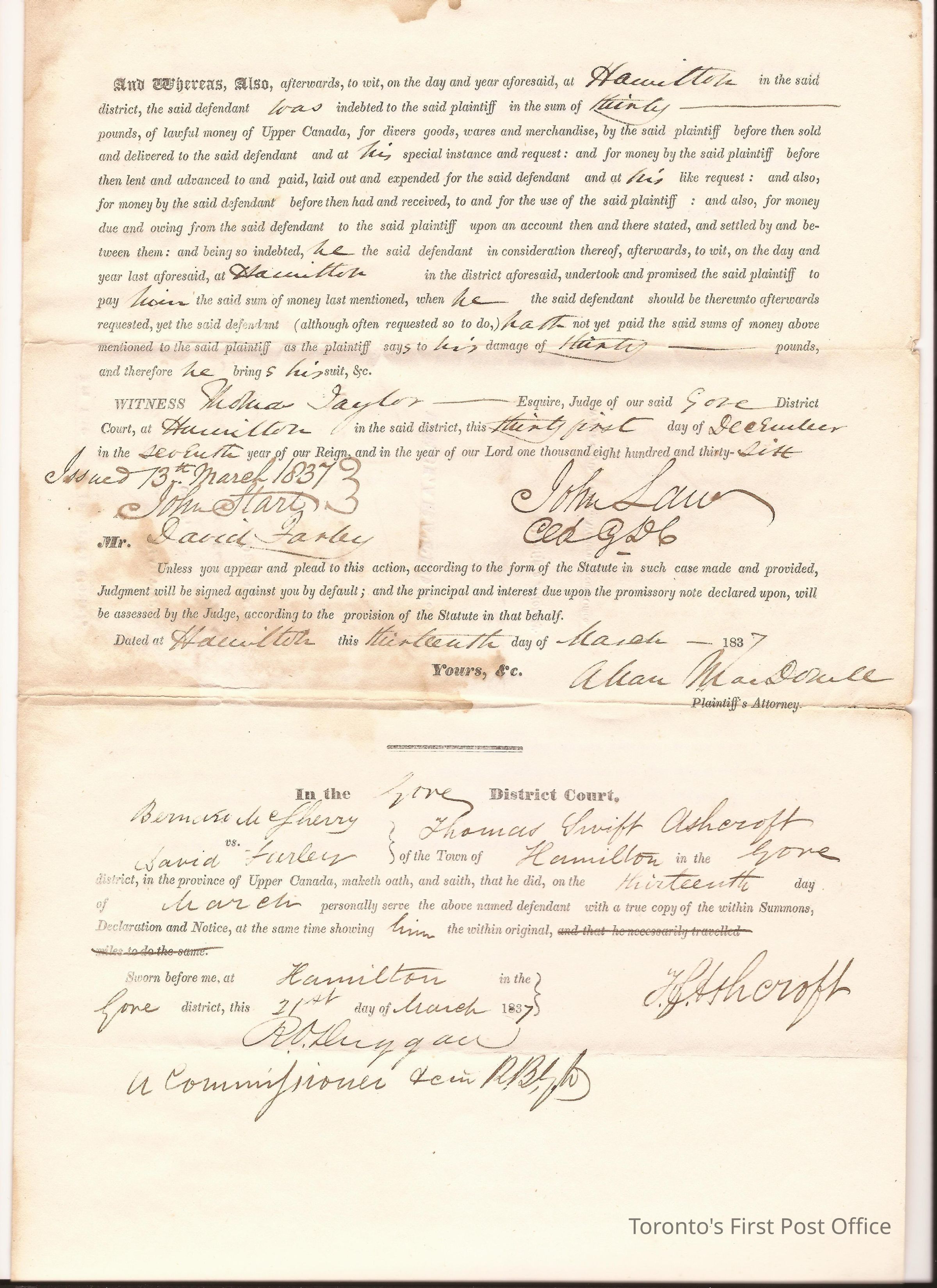 Writ of summons; printed and manuscript; Gore District; commanding the Sheriff to take David Farley to appear at the District Court in Hamilton in answer to a complaint of Bernard W. Sherry; signed by John Saw, Clerk of the District Court, Alan MacDonell, Plaintiff's Attorney, and Thomas Swift Ashcroft of the Sheriff's Department; dated 13 March 1837; wafer seal; 3 pp.Dimensions