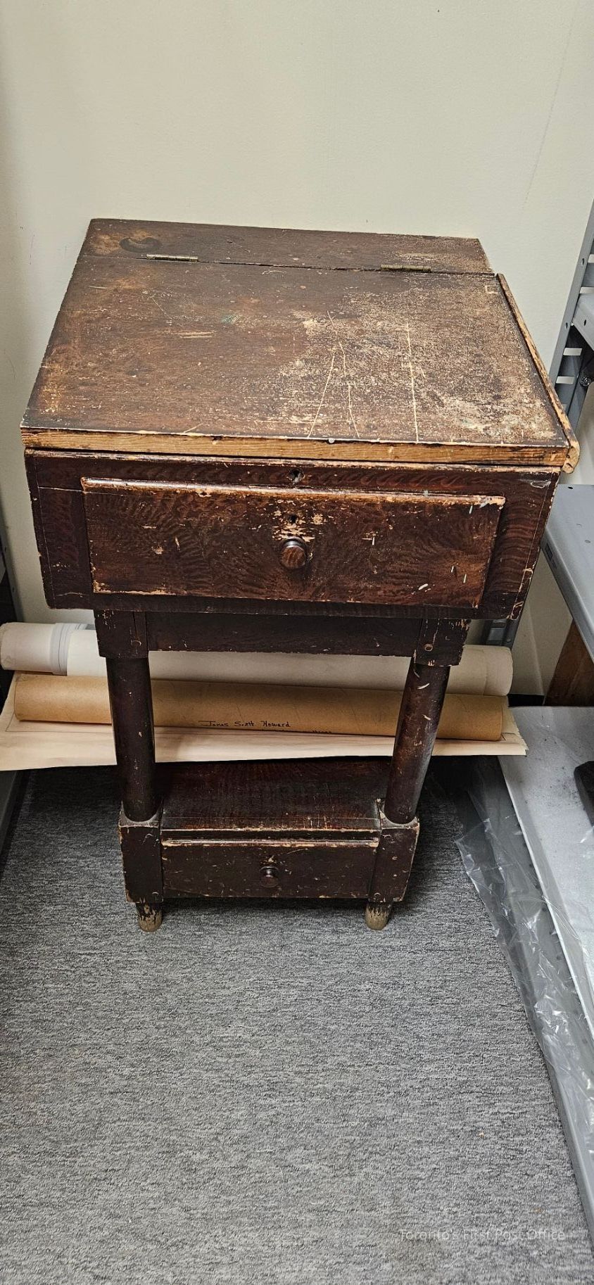 Table with slanted top and hinged lid; drawer below lid; second drawer and shelf near base; interior covered with floral wallpaper; four turned legs.Dimensions