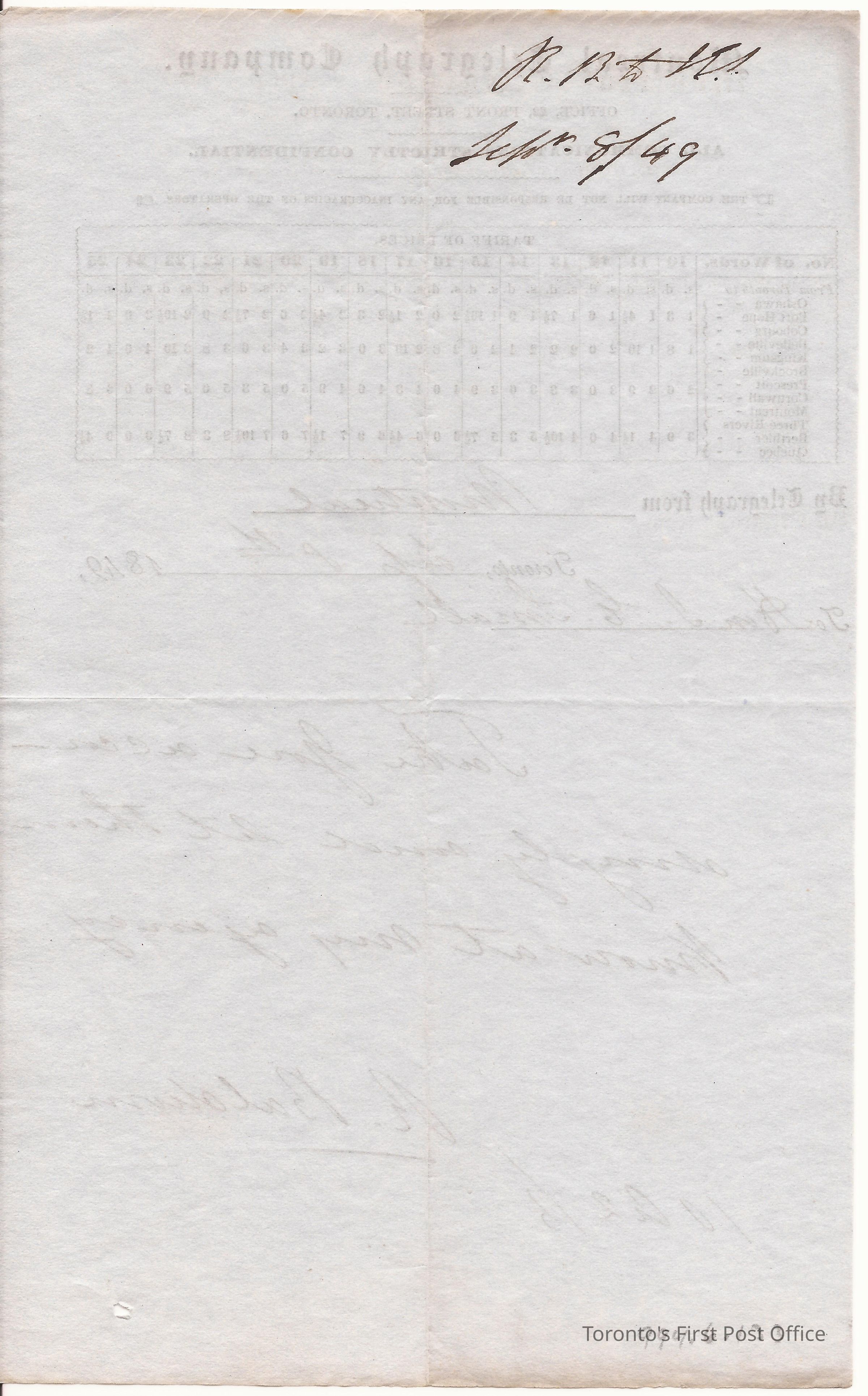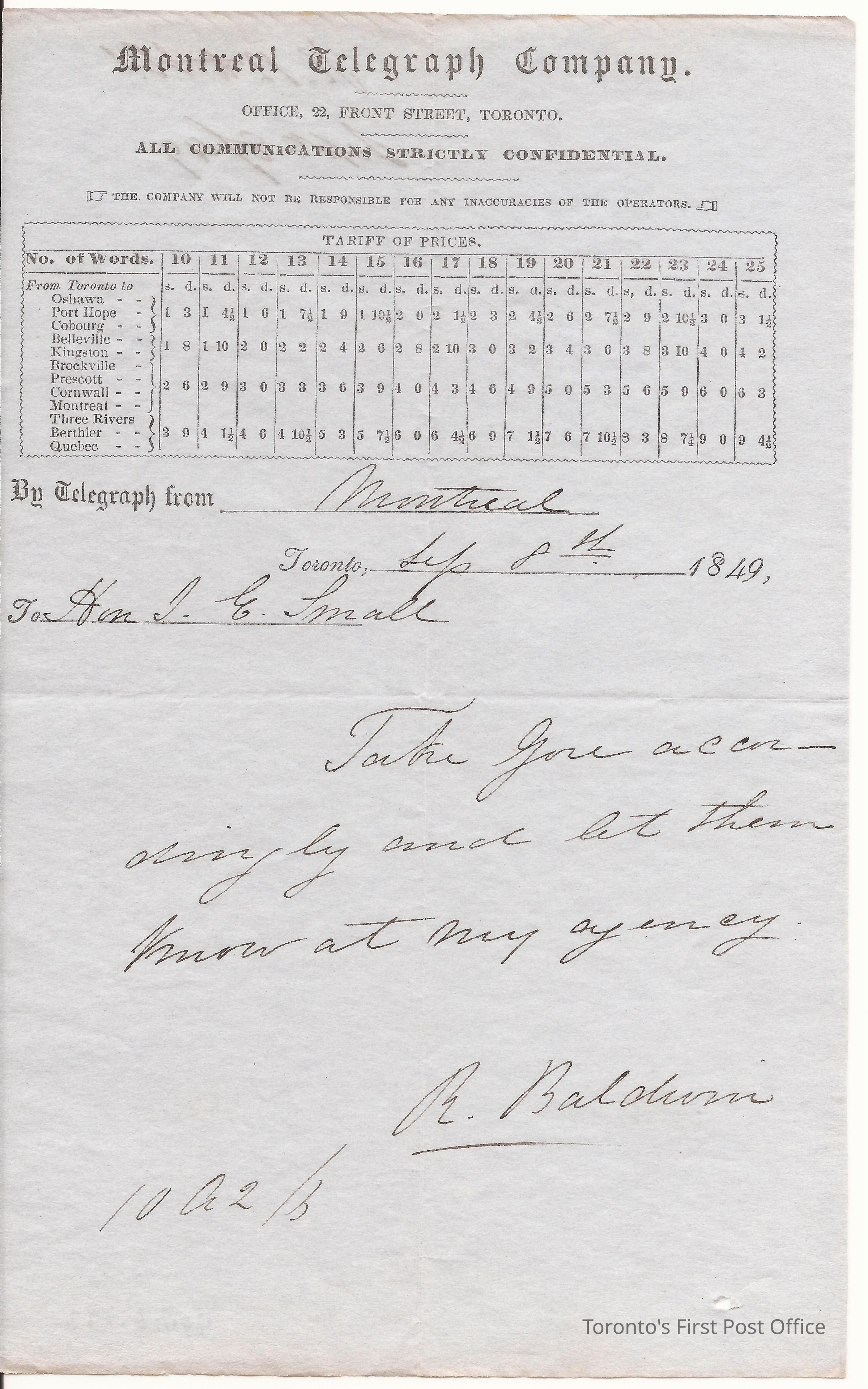 Telegraph; to Hon. J.E. Small, Toronto; from R. Baldwin, Montreal; dated: Sept. 8th 1849; message: "Take Gore accordingly and let them know at my agency."; on "Montreal Telegraph Company" letterhead; also includes table of rates.Update Date