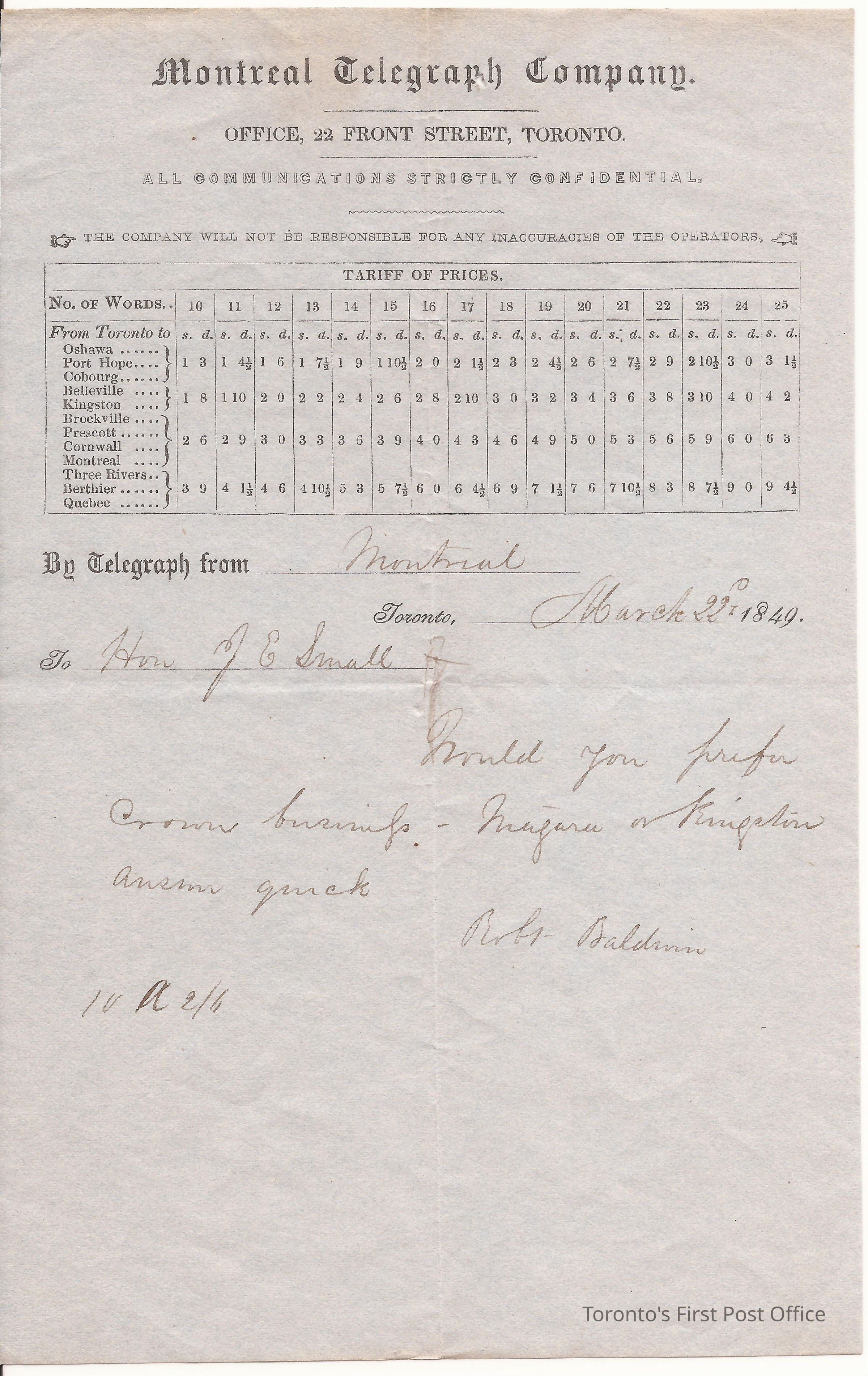 Telegraph; to Hon. J.E. Small, Toronto; from Robt Baldwin, Montreal; dated March 22 1849; message: "Would you prefer Crown business - Niagara or Kingston Answer Quick"; on Montreal Telegraph Company letterhead; also includes table of rates.Update Date