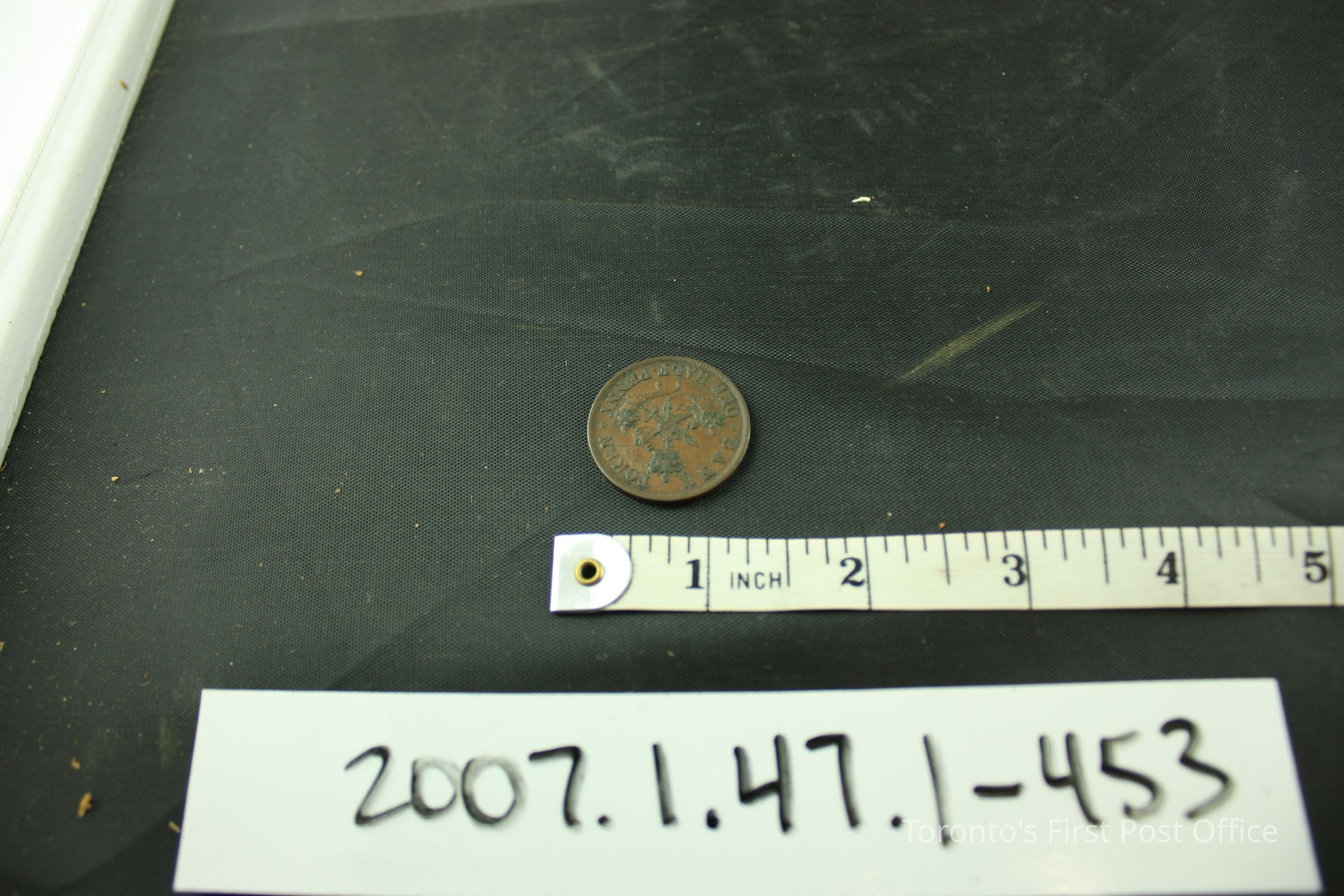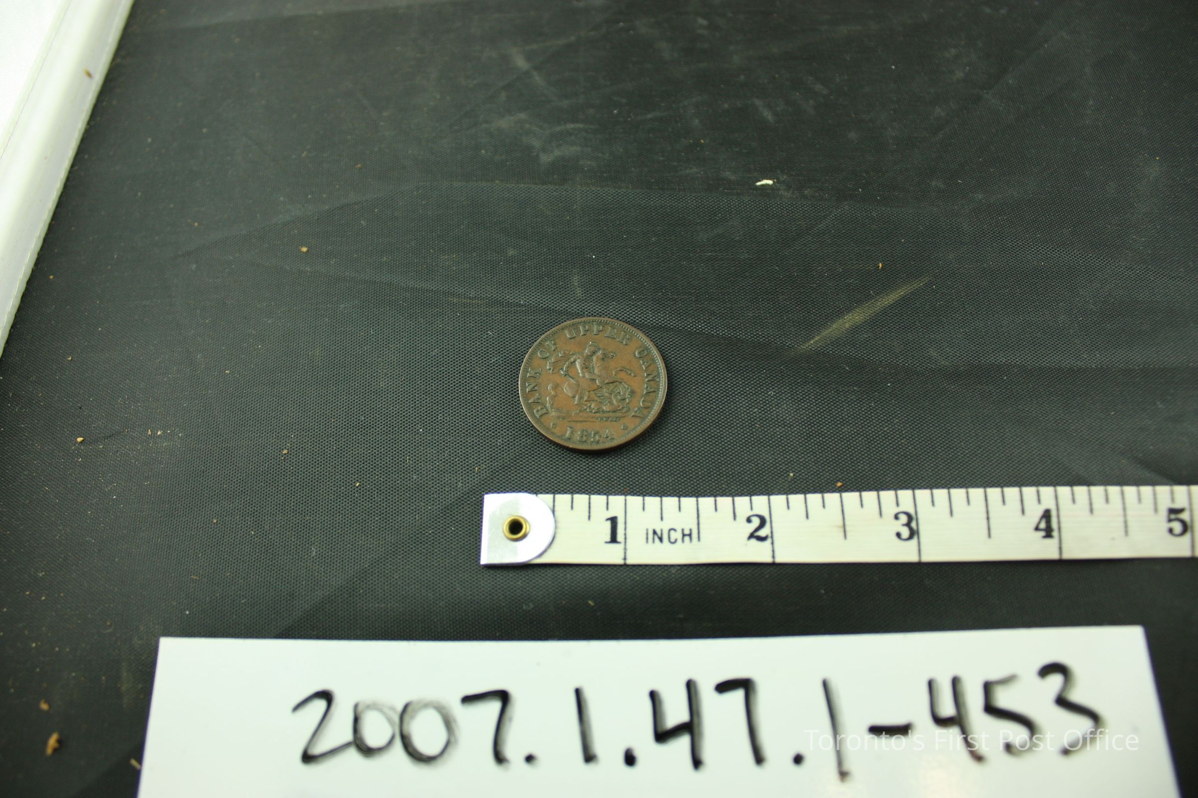 453 Bank of Upper Canada half-pennies; copper; upset reverse; plain edge; obverse: St. George slaying the dragon; "BANK OF UPPER CANADA 1854"; reverse: two cornucopia, sword, anchor, crown; "BANK TOKEN ONE HALF-PENNY". Note: 12 display-quality coins are in Bank of Upper Canada Box 2.Update Date