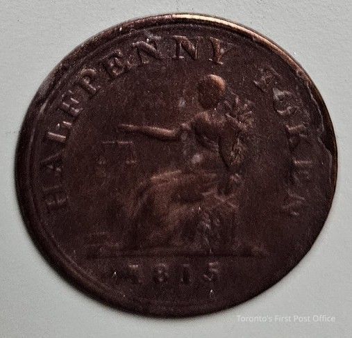 Half penny token; Upper Canada currency; obverse: ship; reverse: Britannia; 1815.