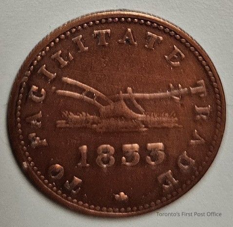 Half penny token; Upper Canada currency; obverse: ship and province of U.C.; reverse: "To Facilitate Trade"; 1833.