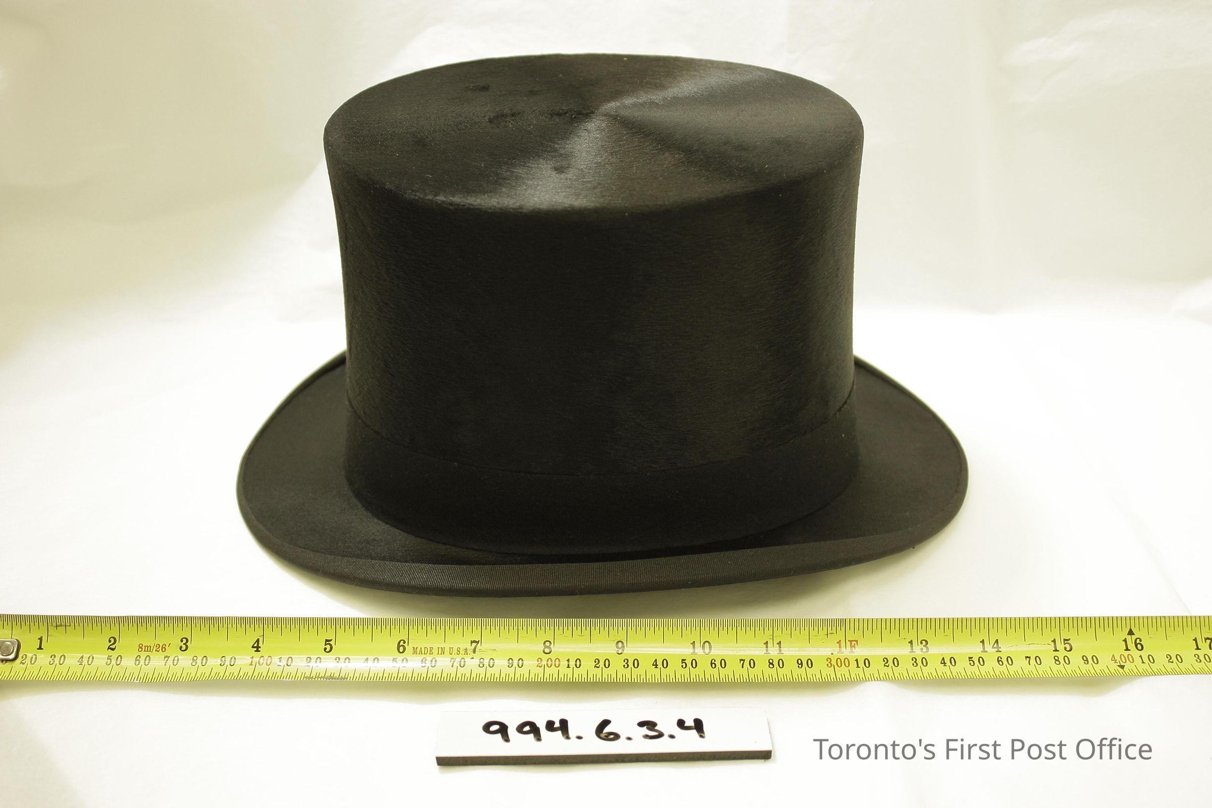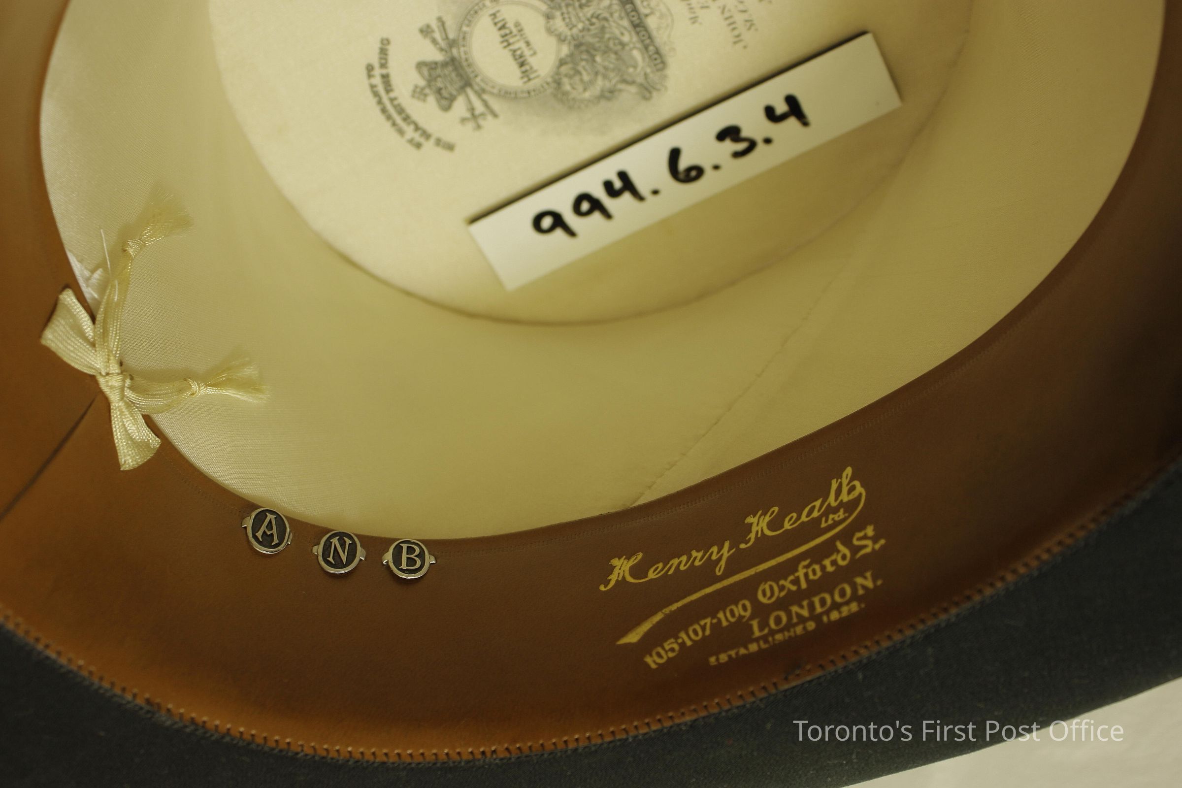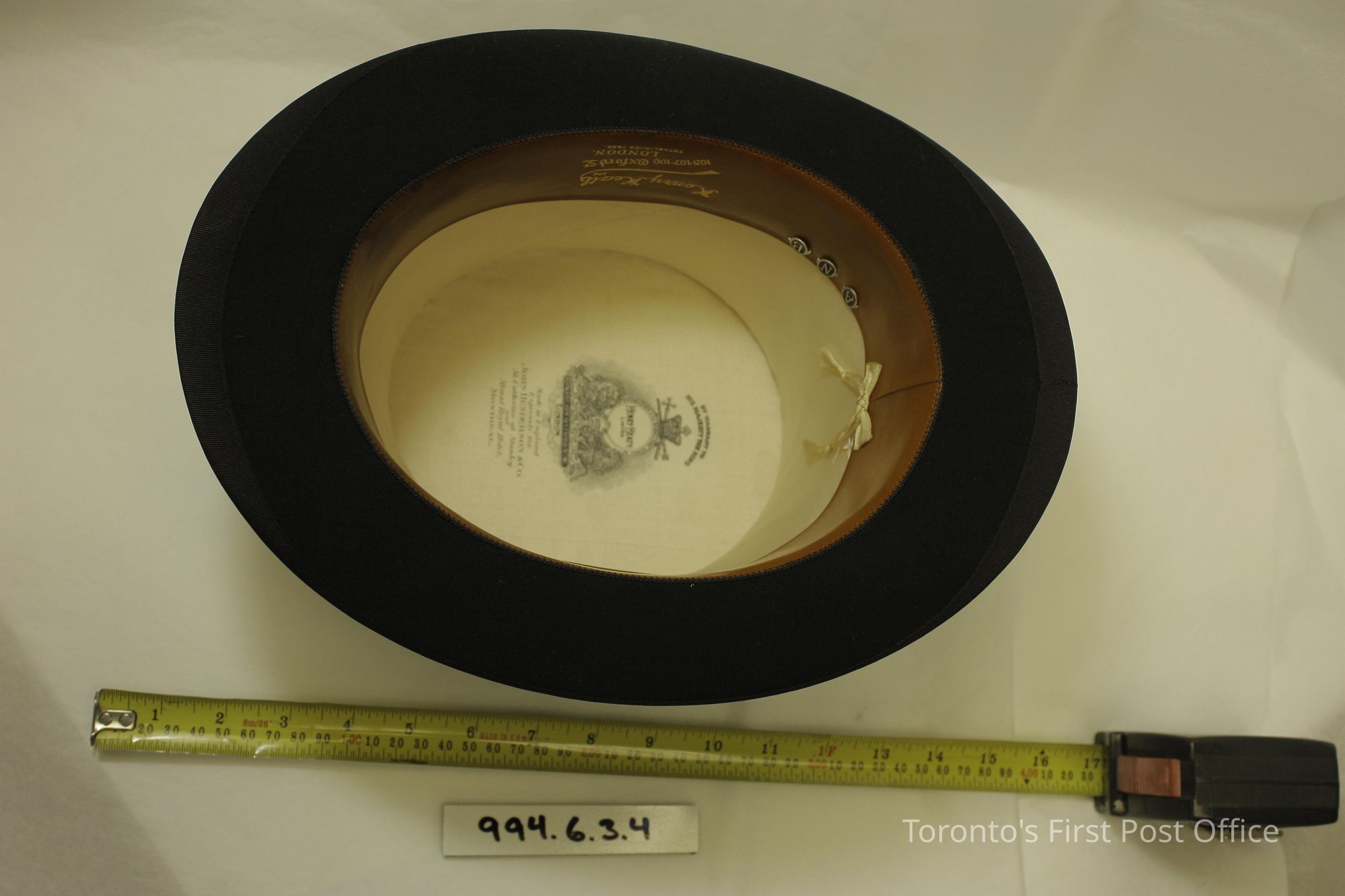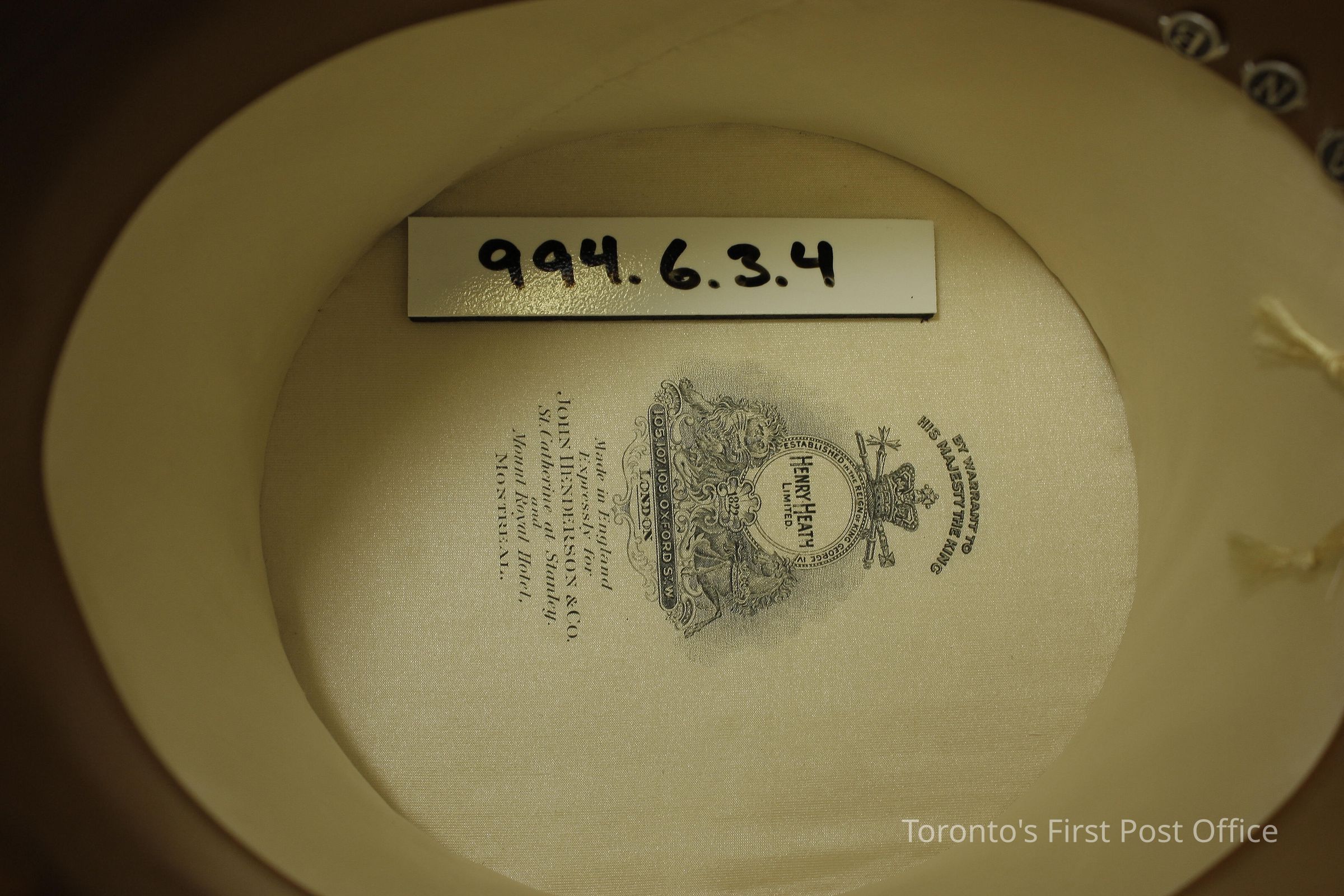 Top hat; black seal; curved brim; leather band inside crown; printed on top inside crown: "Made in England Expressly for John Henderson & Co. St. Catherine at Stanley and Mount Royal Hotel Montreal"; three leather tags on inside leather band with initials "A", "N", "B".Dimensions