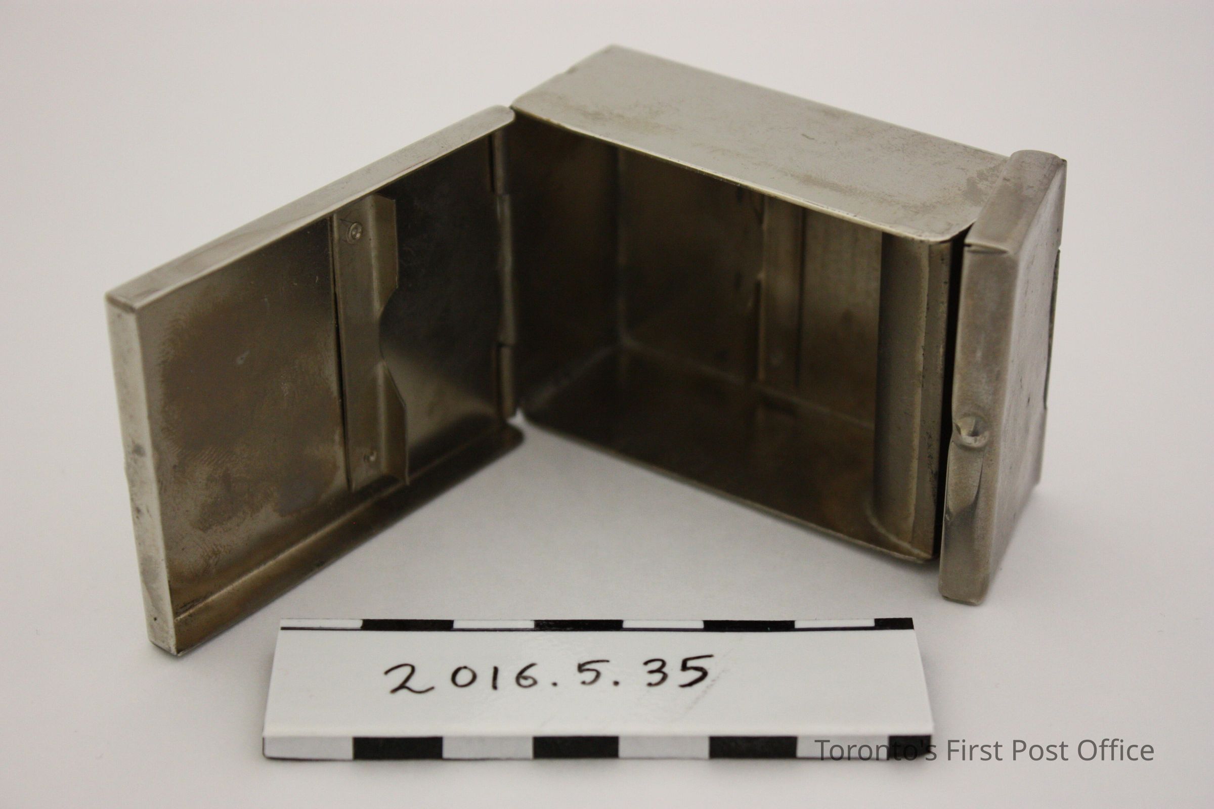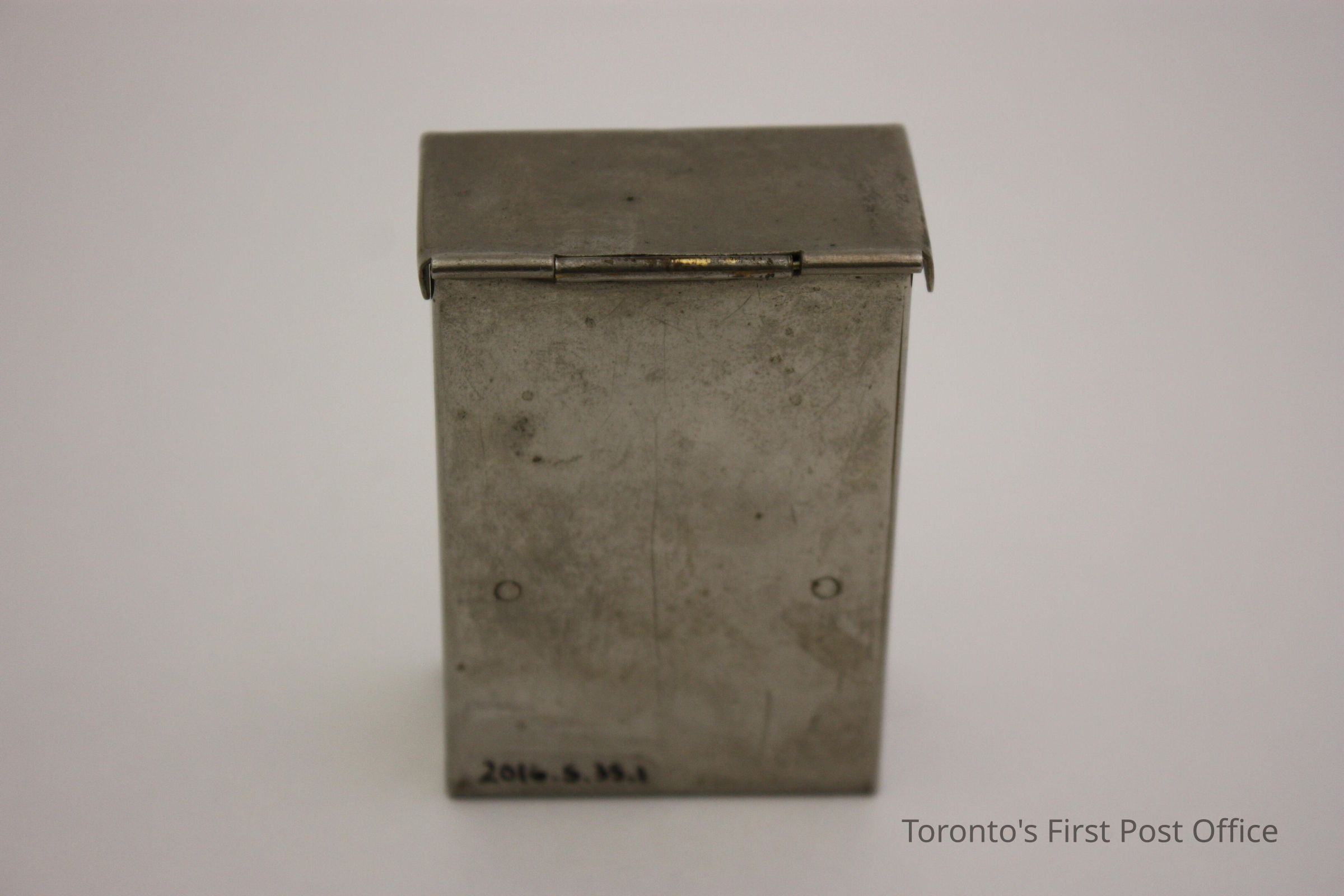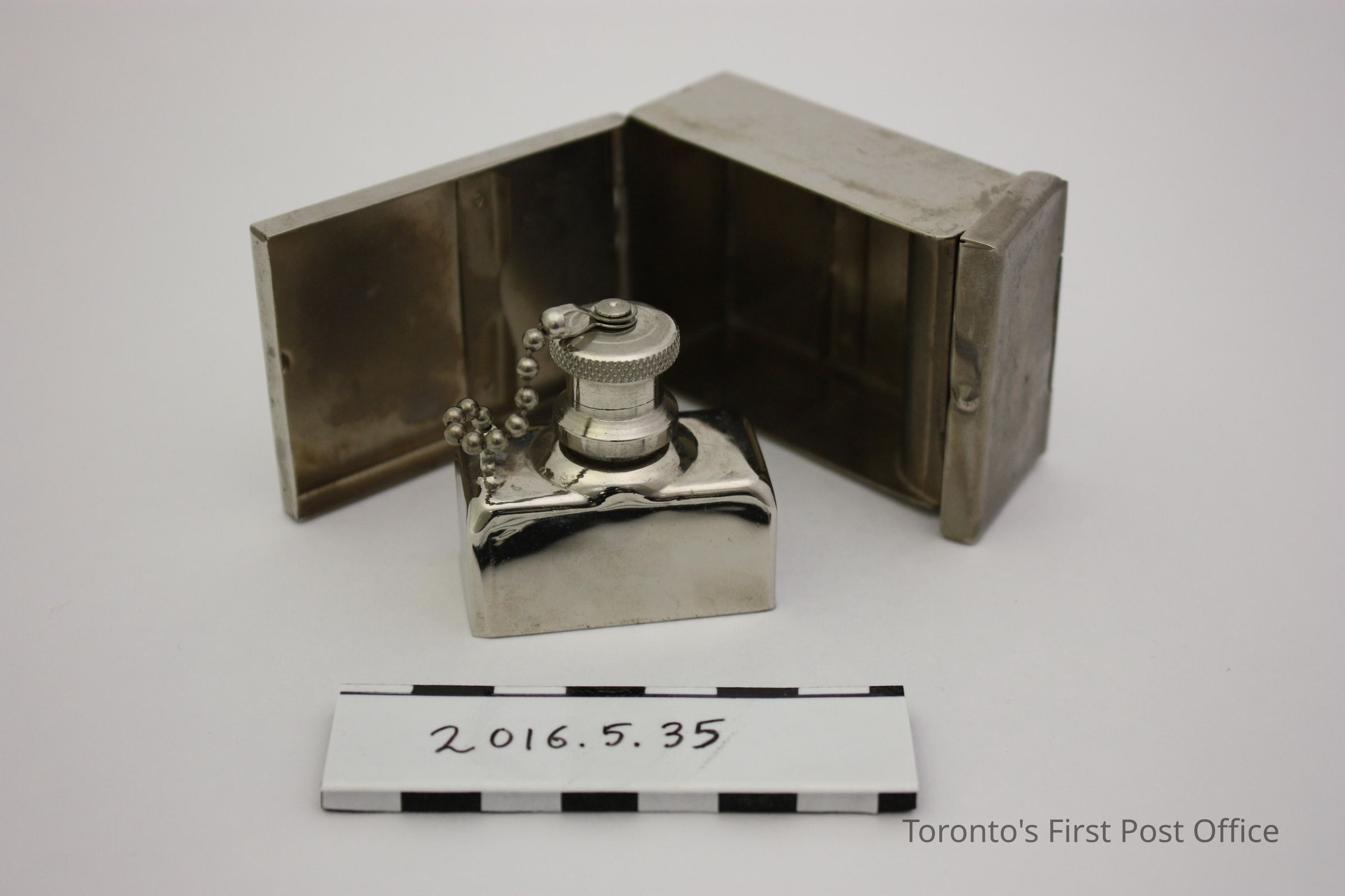 Silver coloured, recatangular, travel stamp set. Front of case opens forward, on hinge at bottom edge. Top of case opens upwards and holds front opening closed with a nub-closure. There is a compartment under the top lid for a stamp. The compartment in the main body of the case holds a short rectangular ink bottle of the same metal, with a screw top.Dimensions