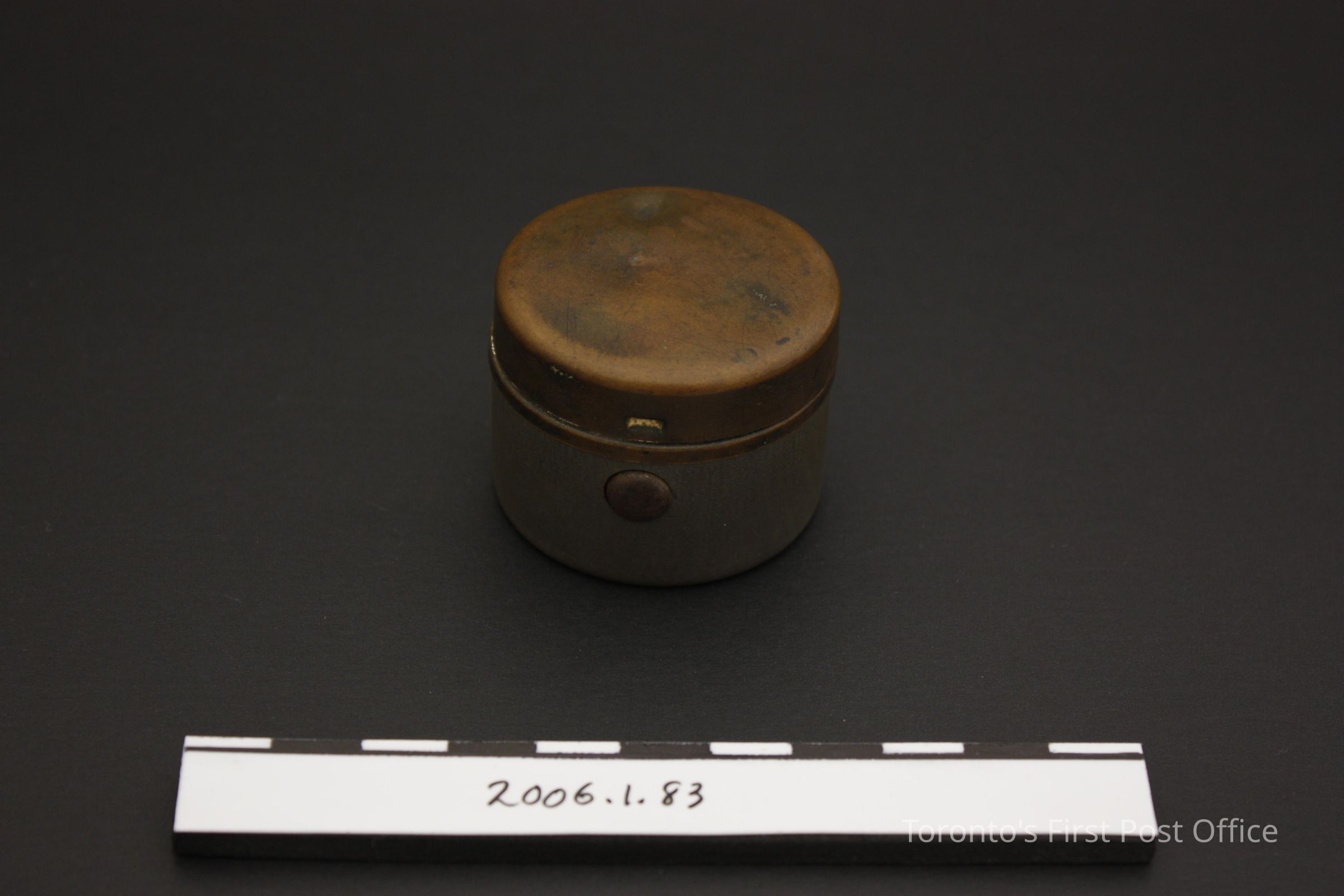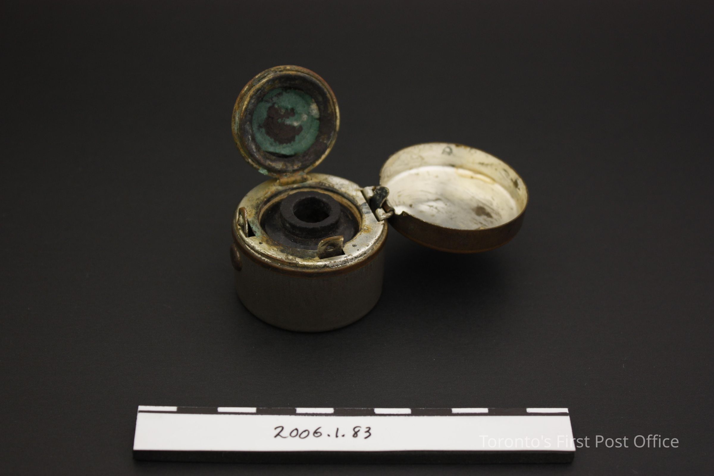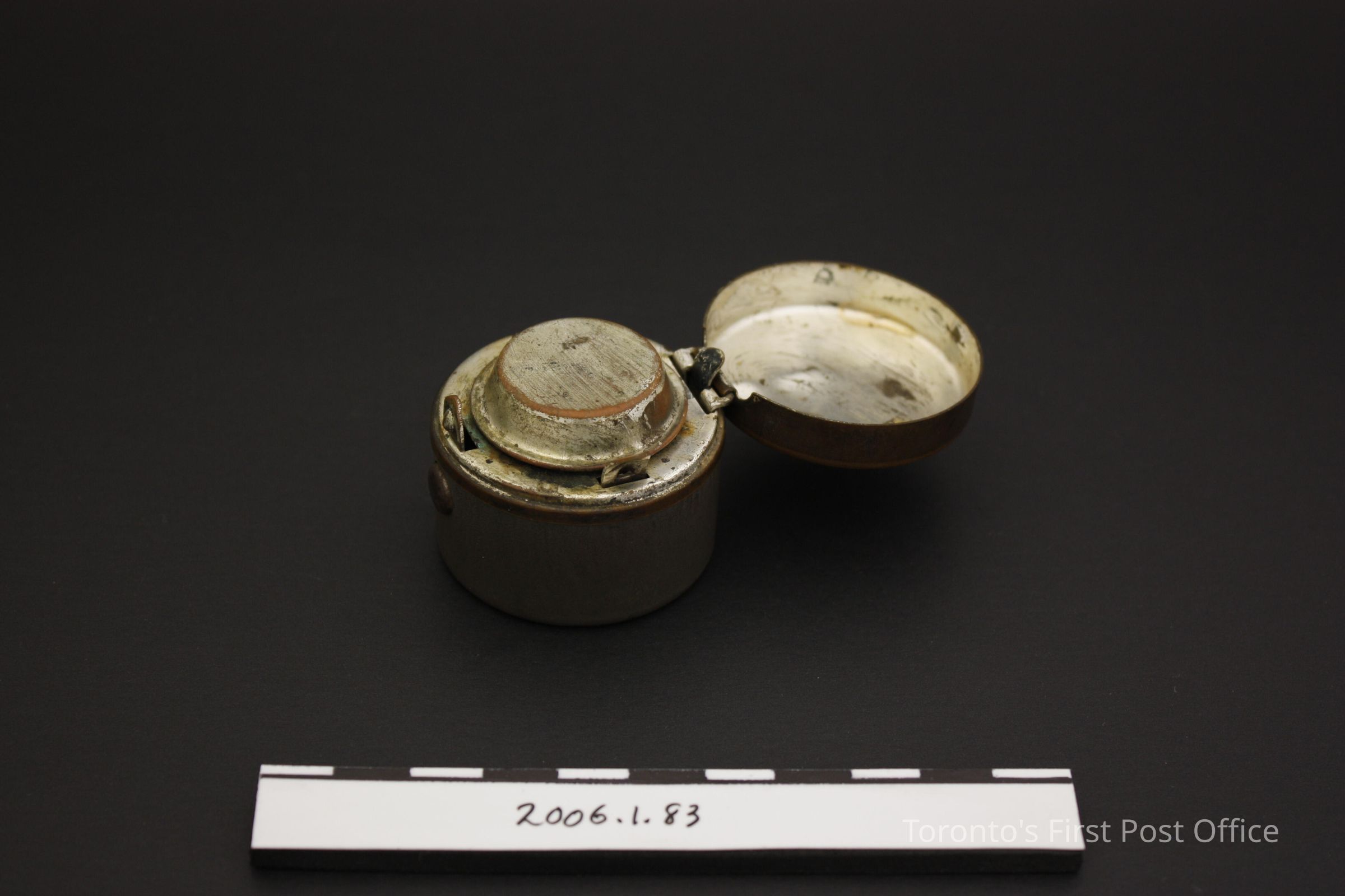 Travelling inkwell with plain glass bottle insert and hinged stopper; metal; possibly silver plated interior; spring-loaded hinged lid; "510 W" in ink and polish at back; circa 1850-1860.Dimensions