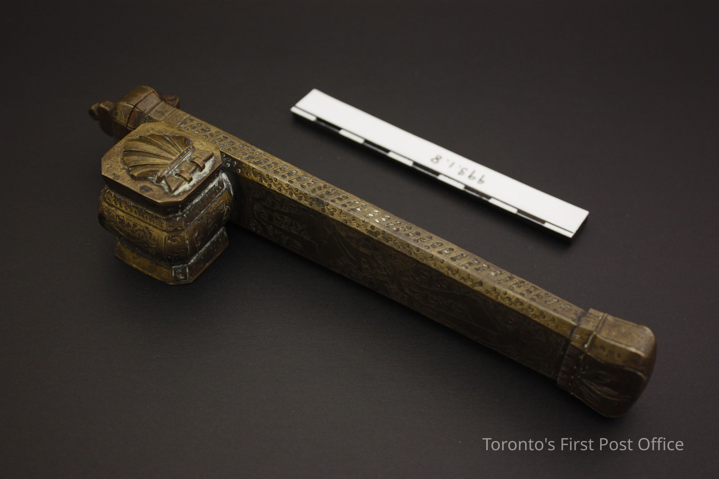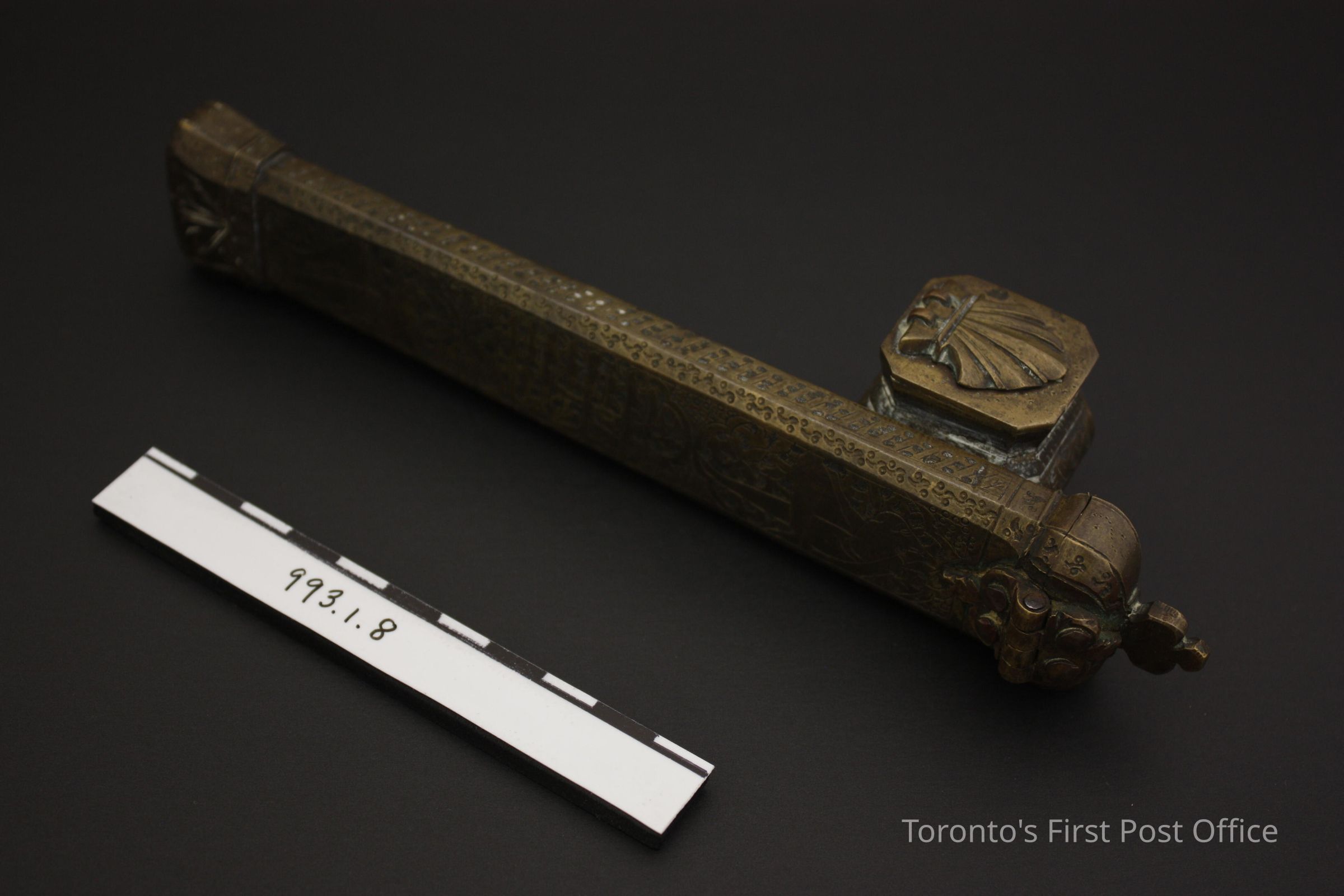 Travelling inkwell and brush case; thick brass; patterned with indented dots on narrow side, female body with animal head on leaf motif on wide side; inkwell lid is a hinged shell; brush case lid is surmounted by a three-lobed leaf.Dimensions