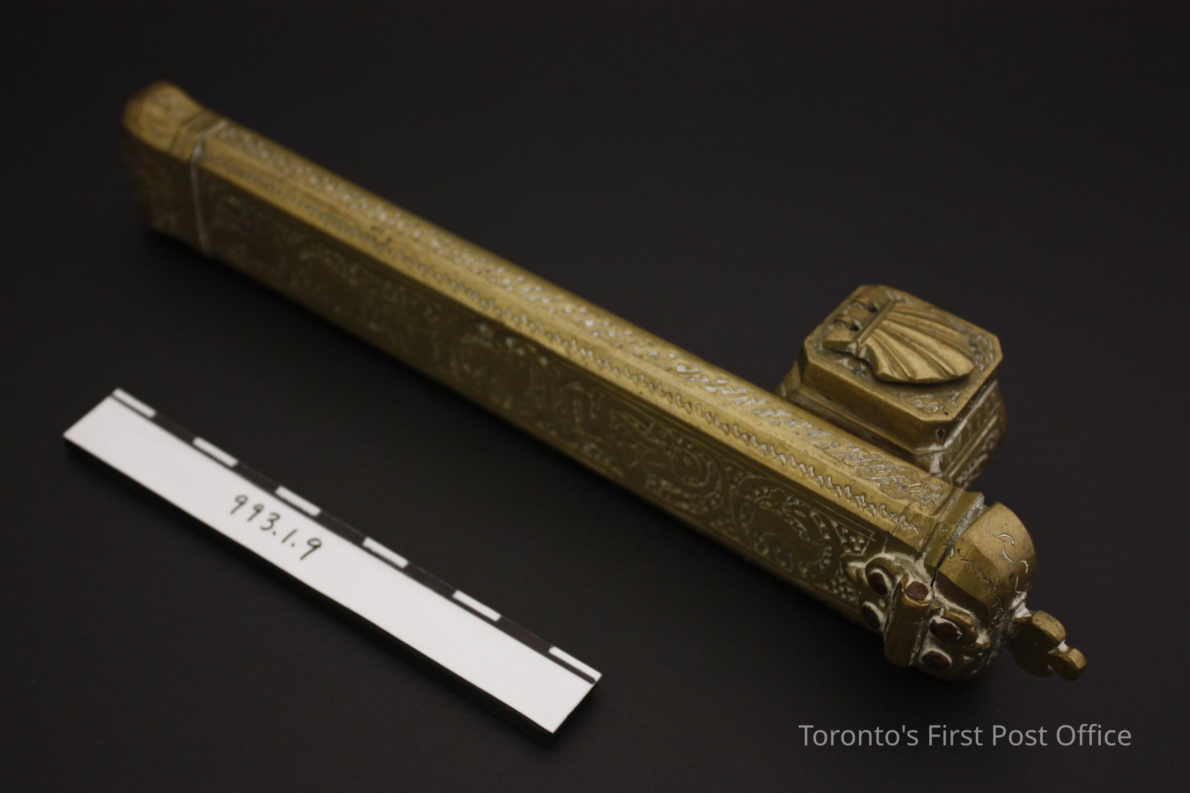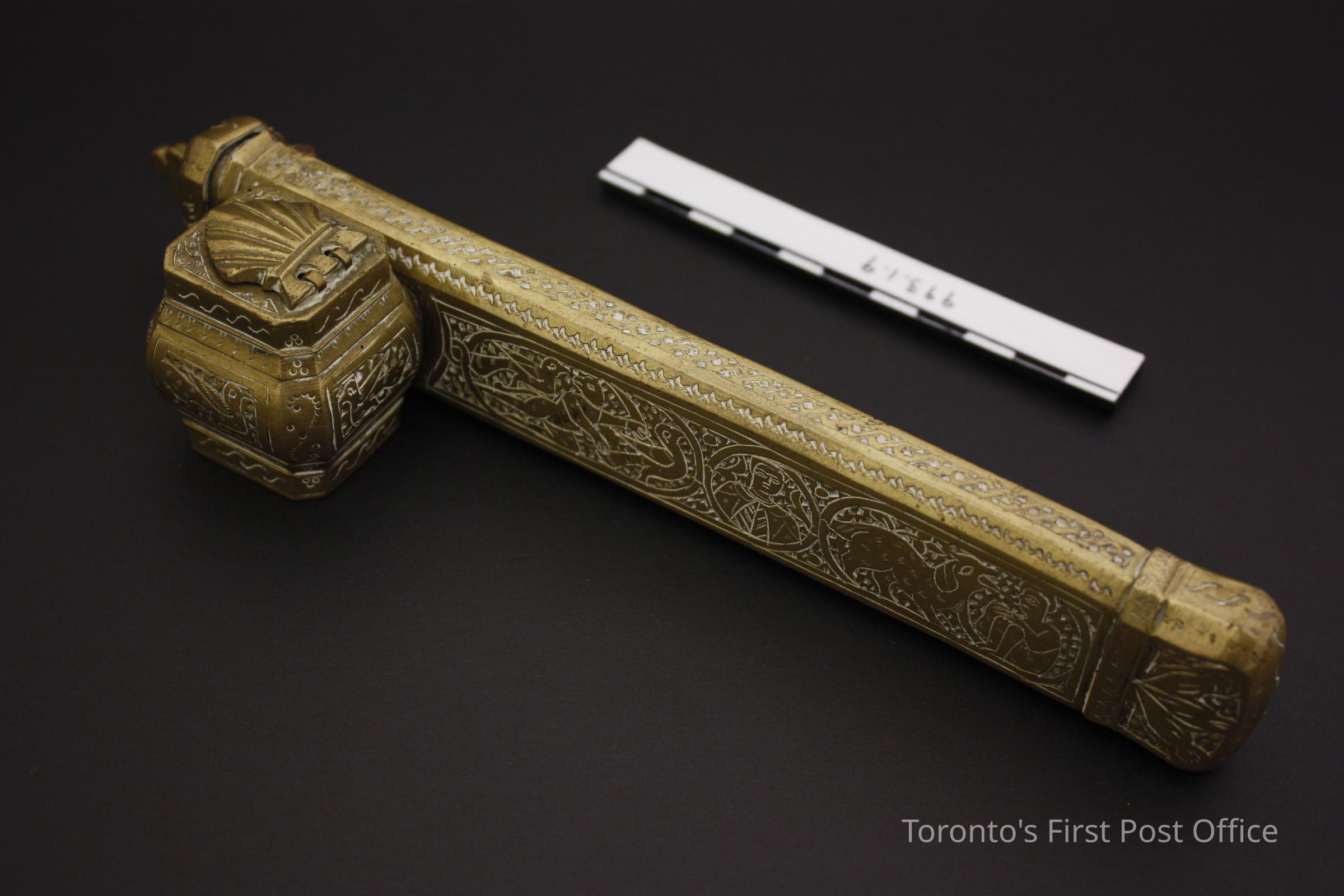 Travelling inkwell and brush case; brass; patterned with indented dots on narrow side, birds, humans, animals on leaf motif on wide side; inkwell lid is a hinged shell; brush case lid is surmounted by a three-lobed leaf.Dimensions