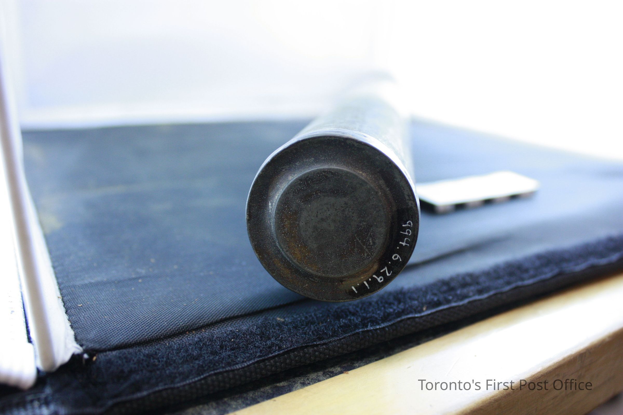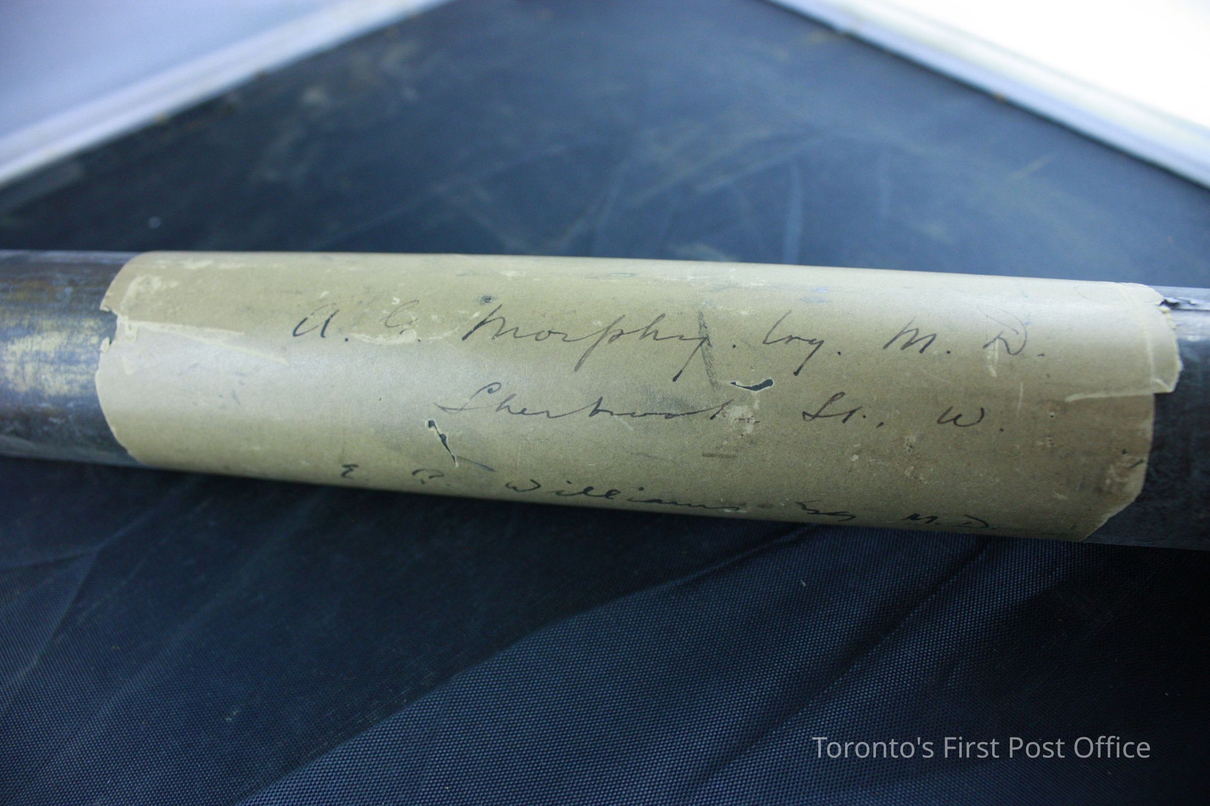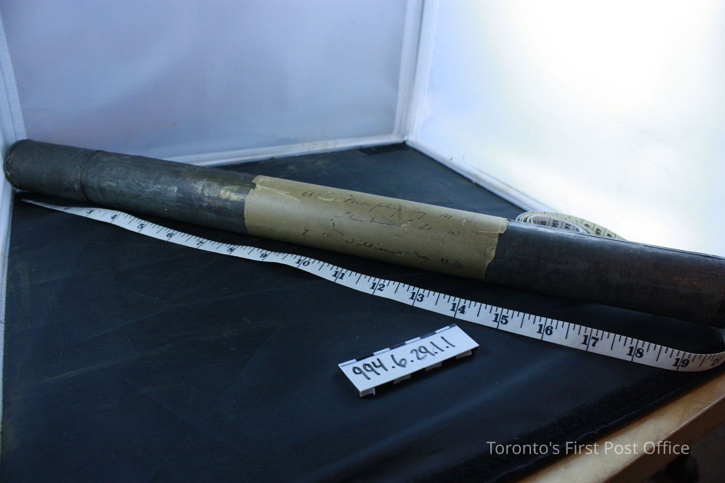 Tube; tin alloy or brass; with separate lid; paper wrapped around centre of tube reads: "A.G. Morphy… M.D. Sherbourne St. W. E.P. Williams Esq. M.D."Update Date