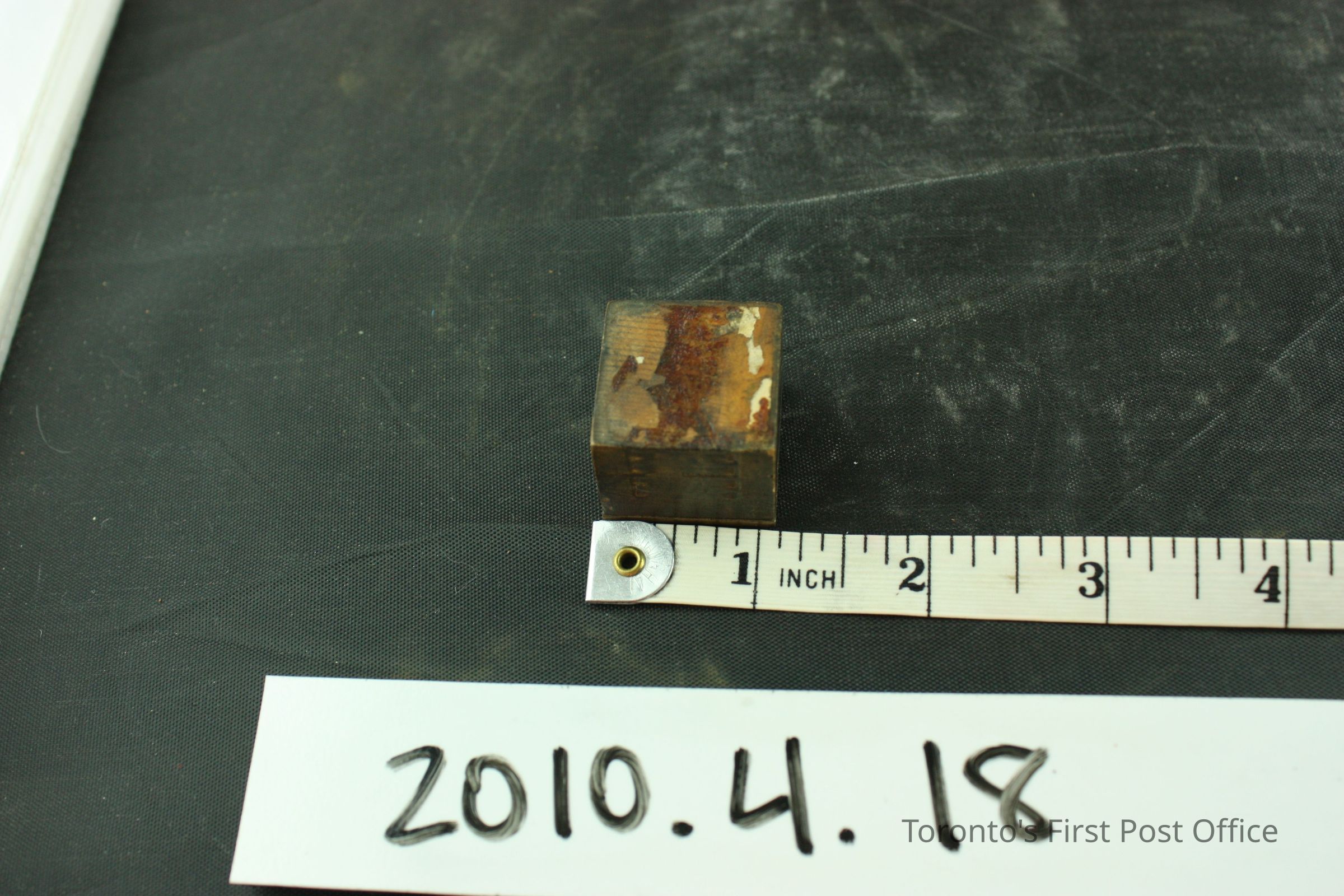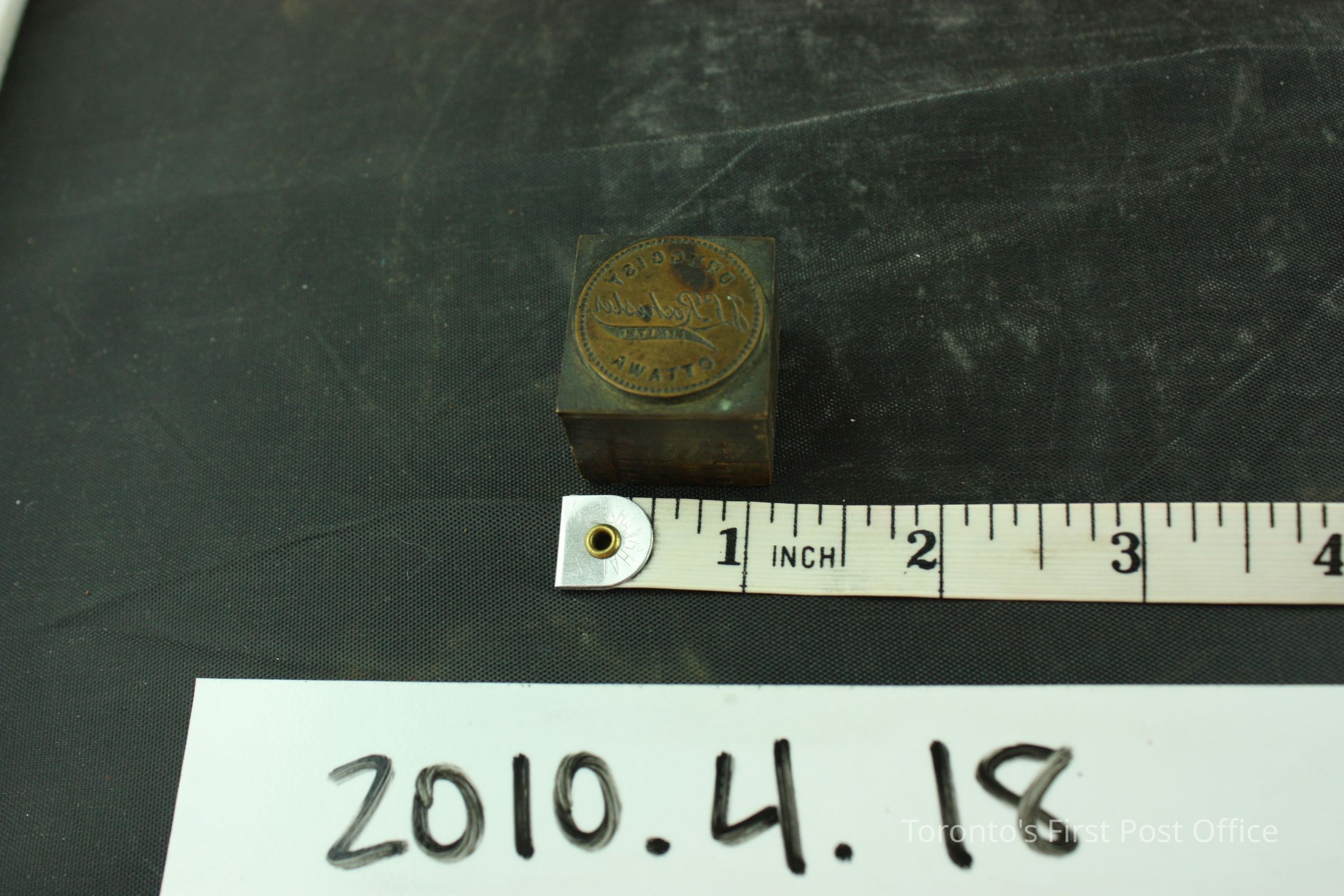 Type stamp with circular engraved copper mounted logo on a small wooden block. The stamp reads "DRUGGIST / T. L. Rochester / LIMITED / OTTAWA". There are matching indents on all four sides of the wooden block. Possible label on top has been removed and red adhesive residue remains.Dimensions