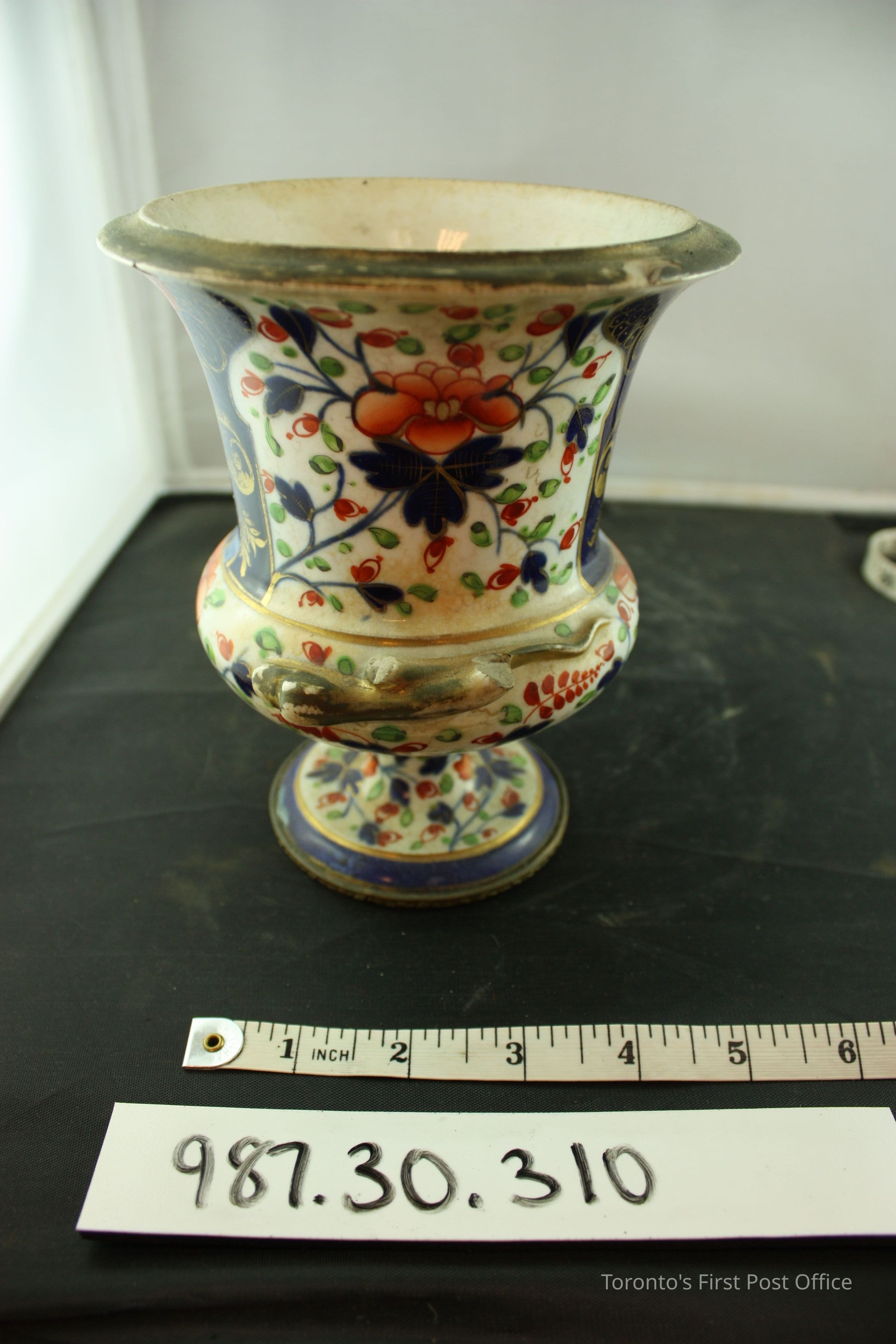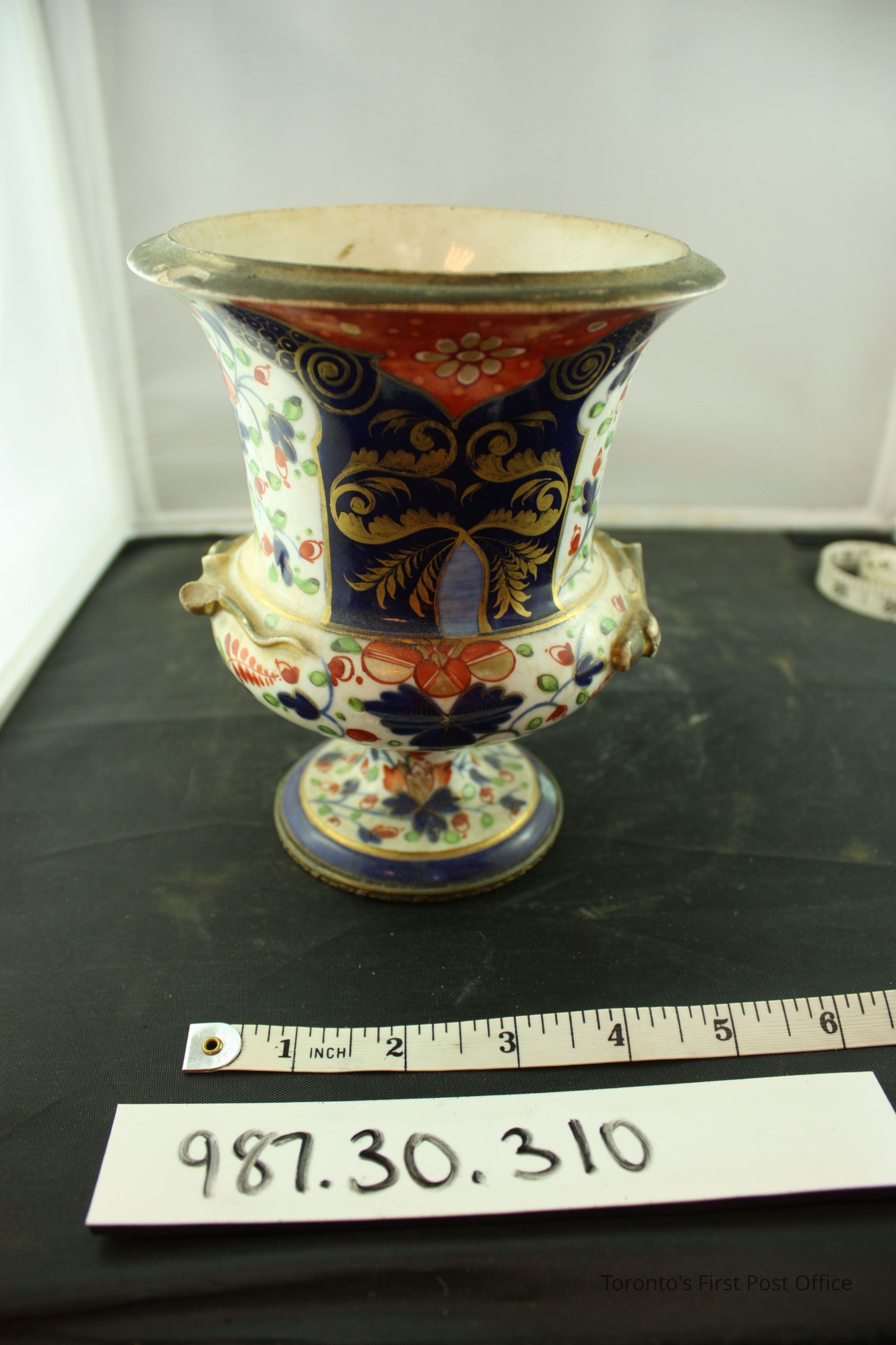 Vase, Victorian Royal Crown Derby; urn-shaped; with handles; pedestal base; decorated in Qmari style; floral pattern in red, orange, royal blue, green, gold, and light blue.Dimensions