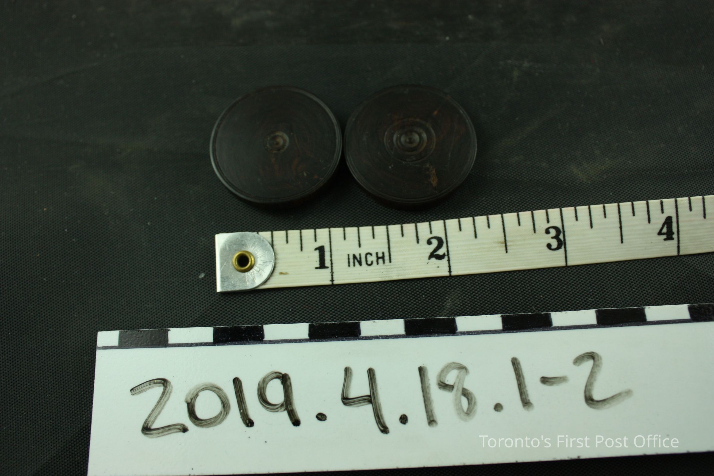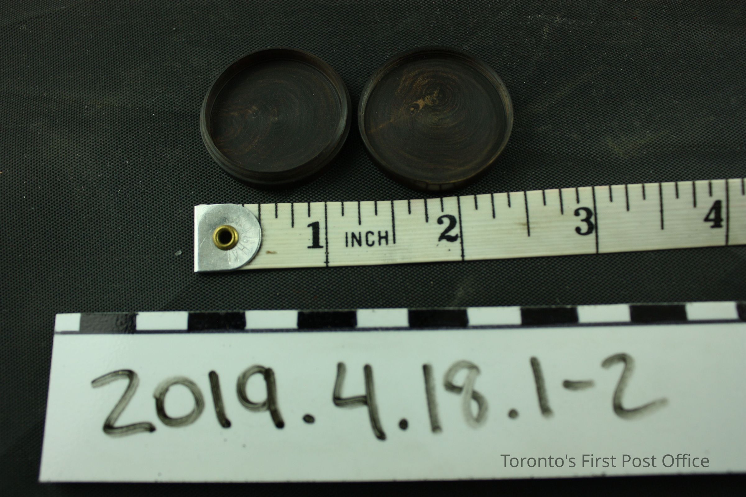 Empty, round Lignum vitae (wood) screw-turn wafer box with decorative engraved rings on lid and base.Dimensions