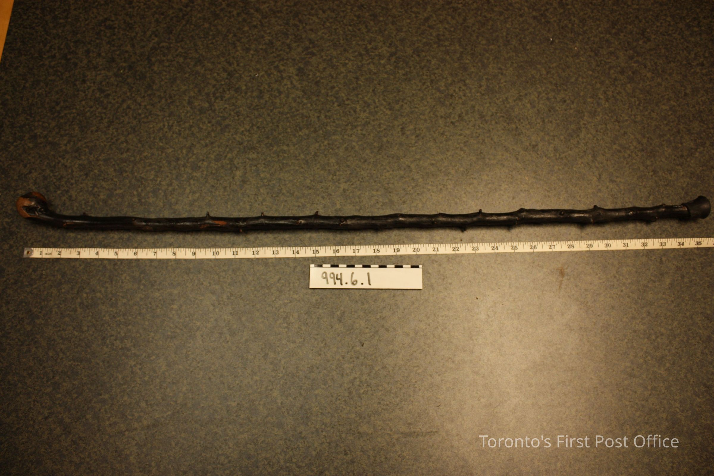 Walking stick; black hawthorn; rubber tip; thorn tips removed; walnut coloured knob; silver metal shamrock attached near handle.