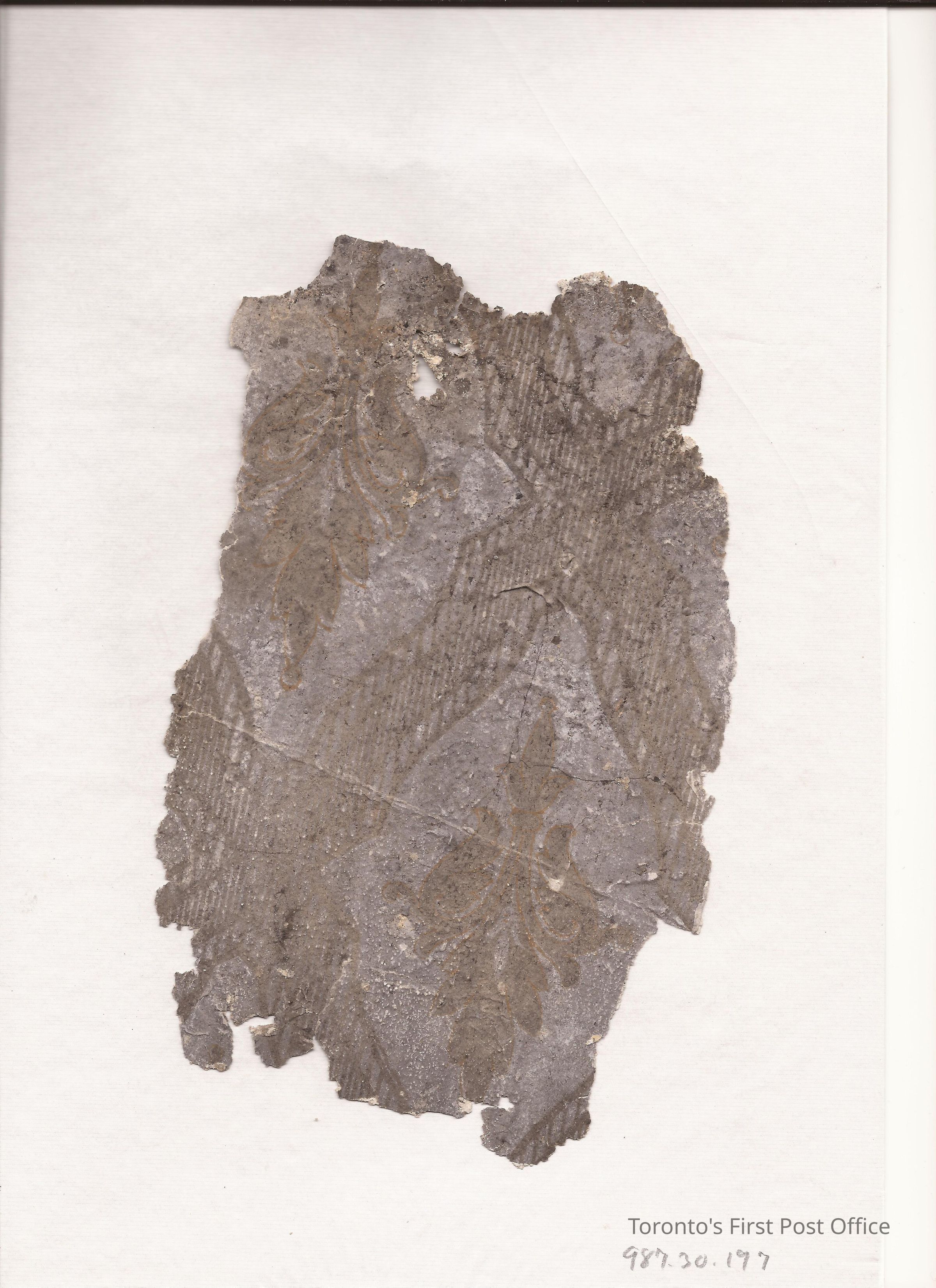Wallpaper fragment; silver, grey, and brown; diamond pattern with medallion in centre; reverse is yellow with plaster powder; this fragment removed from 2nd floor of Bank of Upper Canada Building; circa 1835.Dimensions