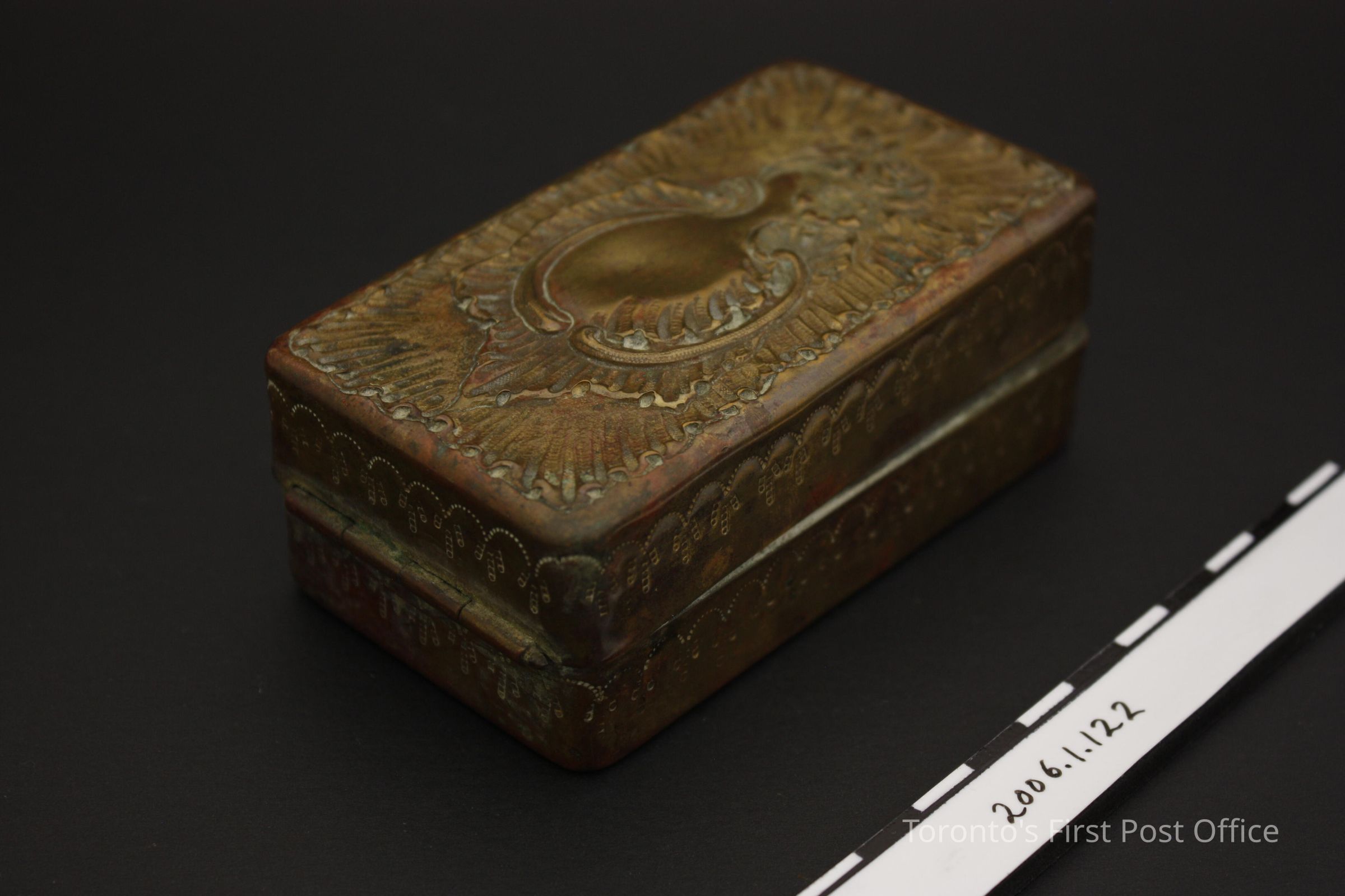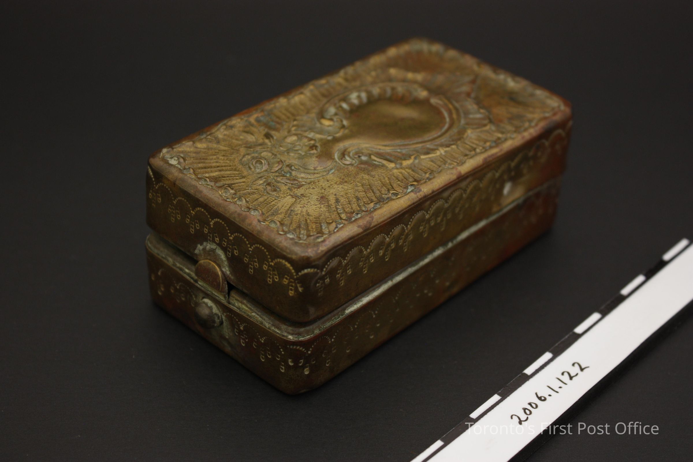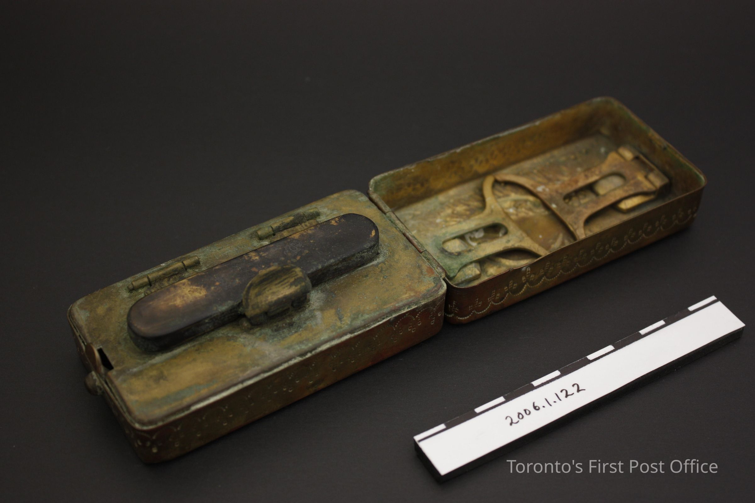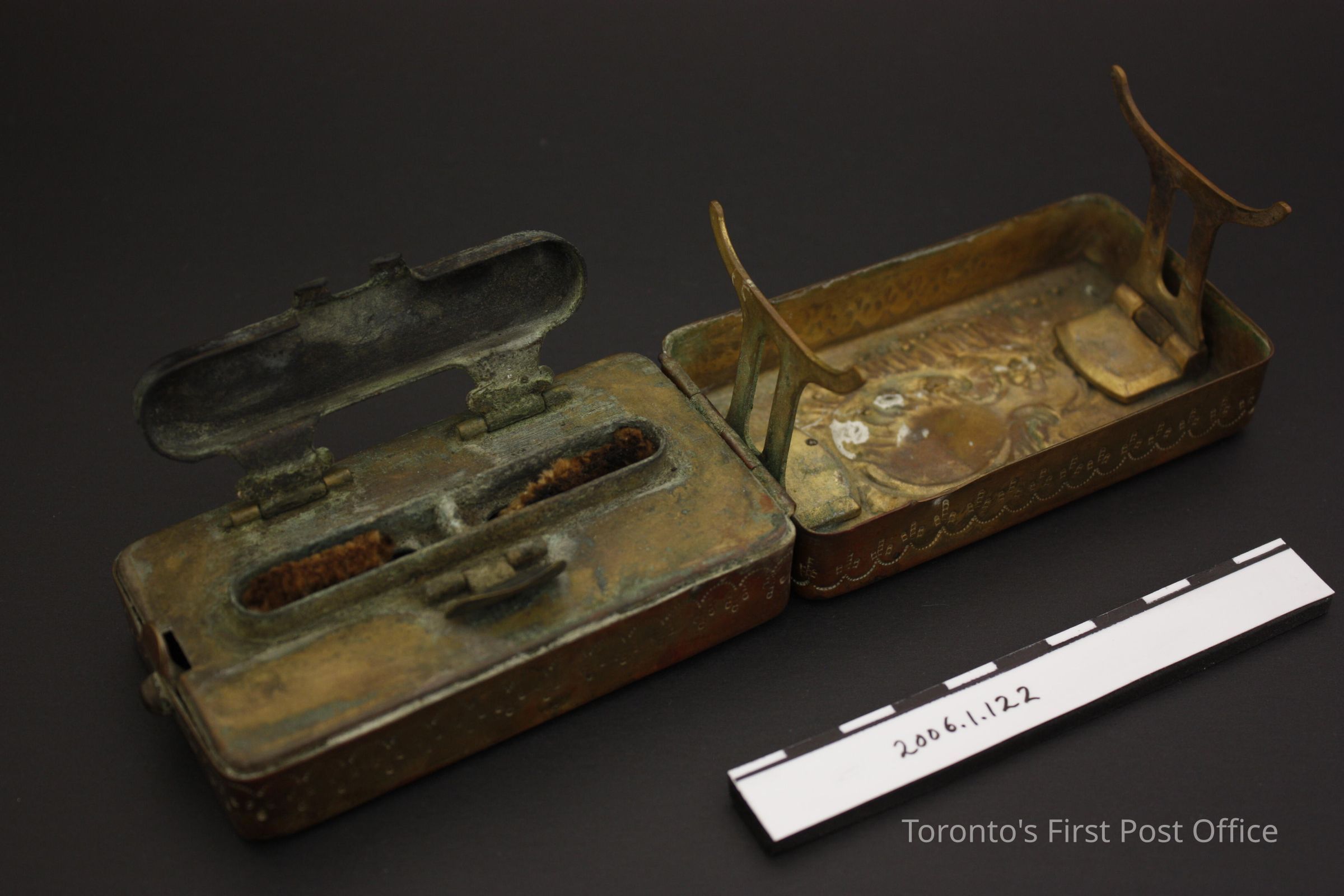 Travelling wax heater in bronze or ormulu with hand chased rococo decoration on cover and punched design on sides; inside includes reservoir and wick; with stand for wax hinged into inside of lid; circa late 18th/early 19th C.Dimensions