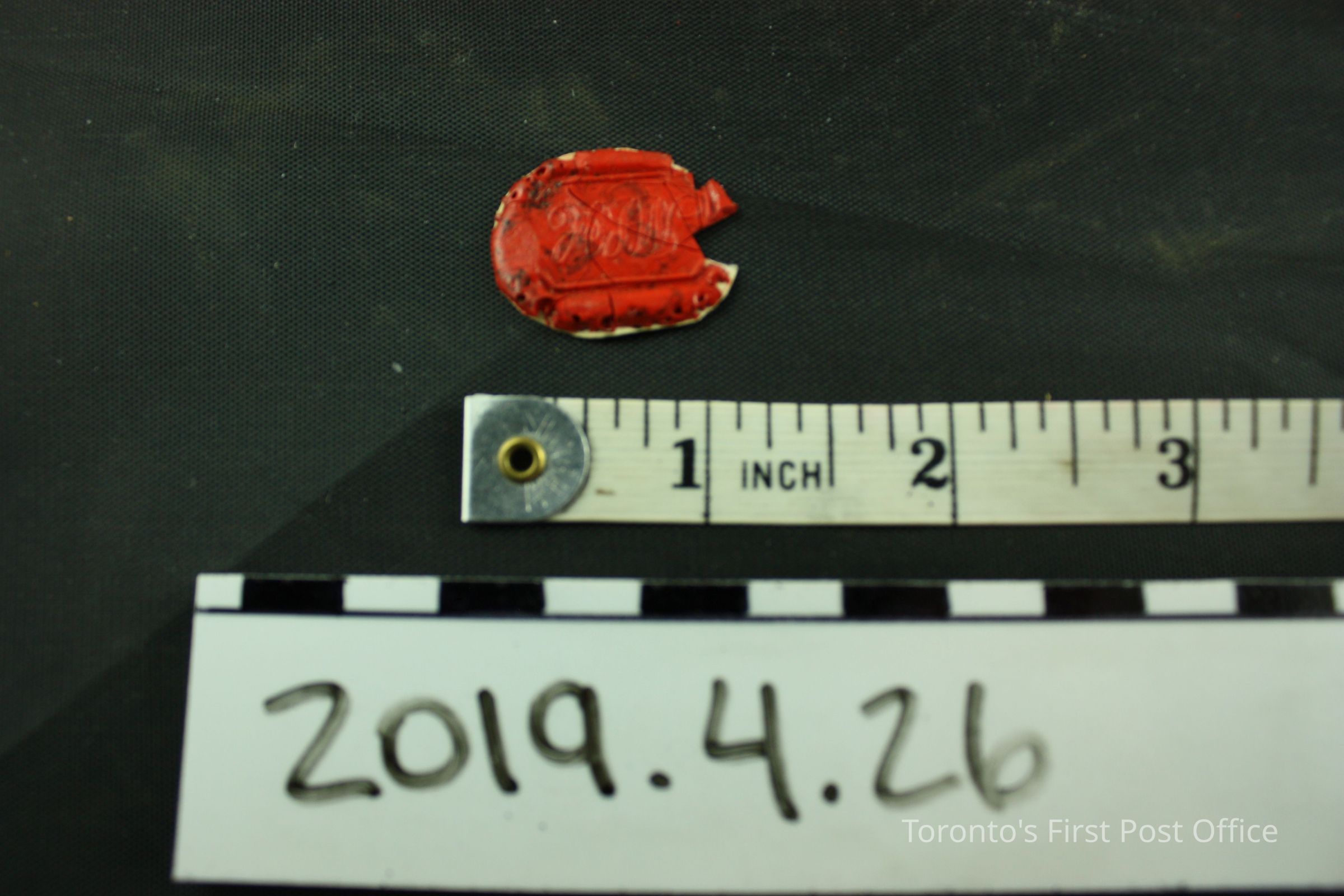 Cut out of red wax seal on paper, seal design: letters ("MLH"?)