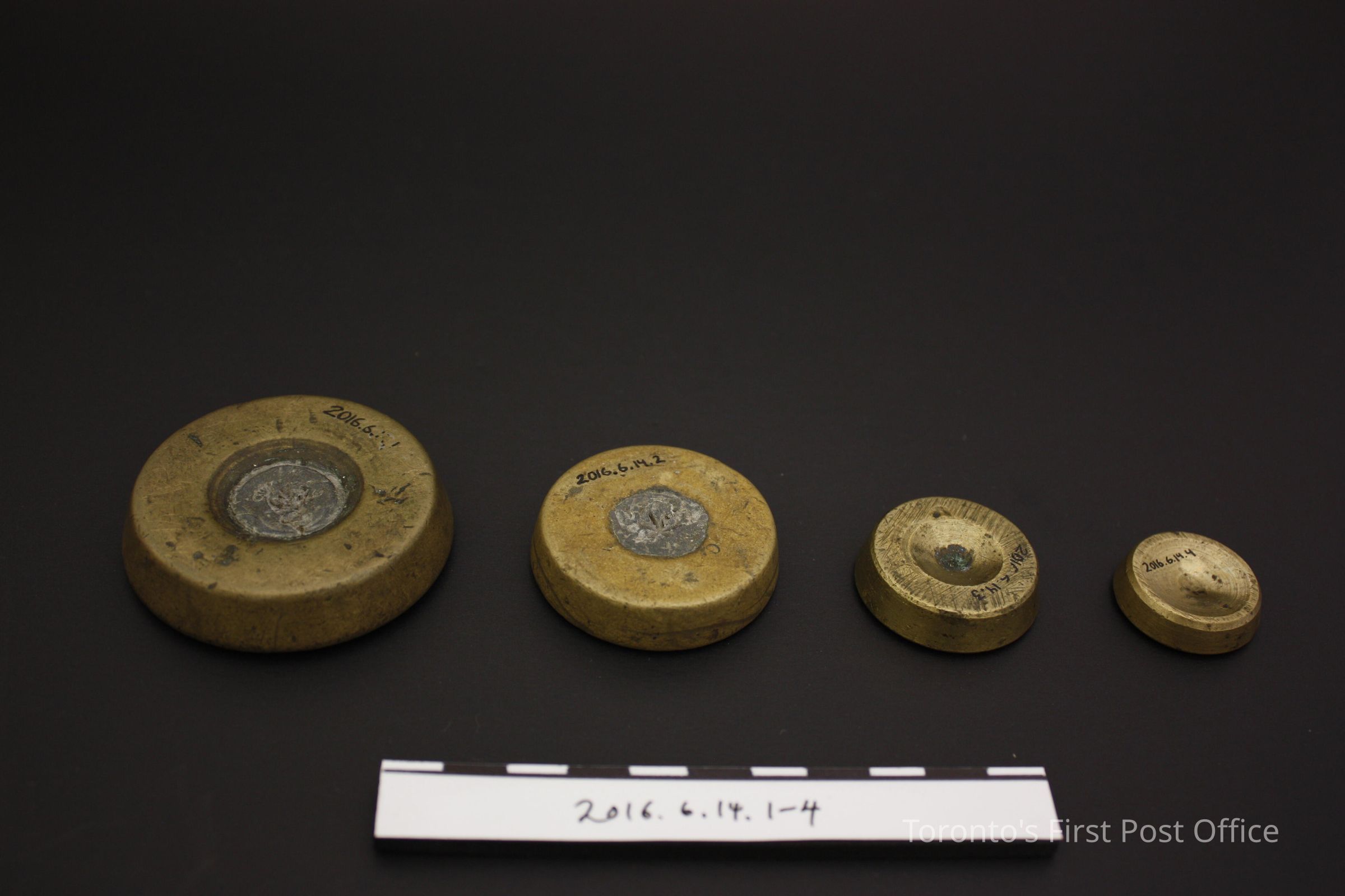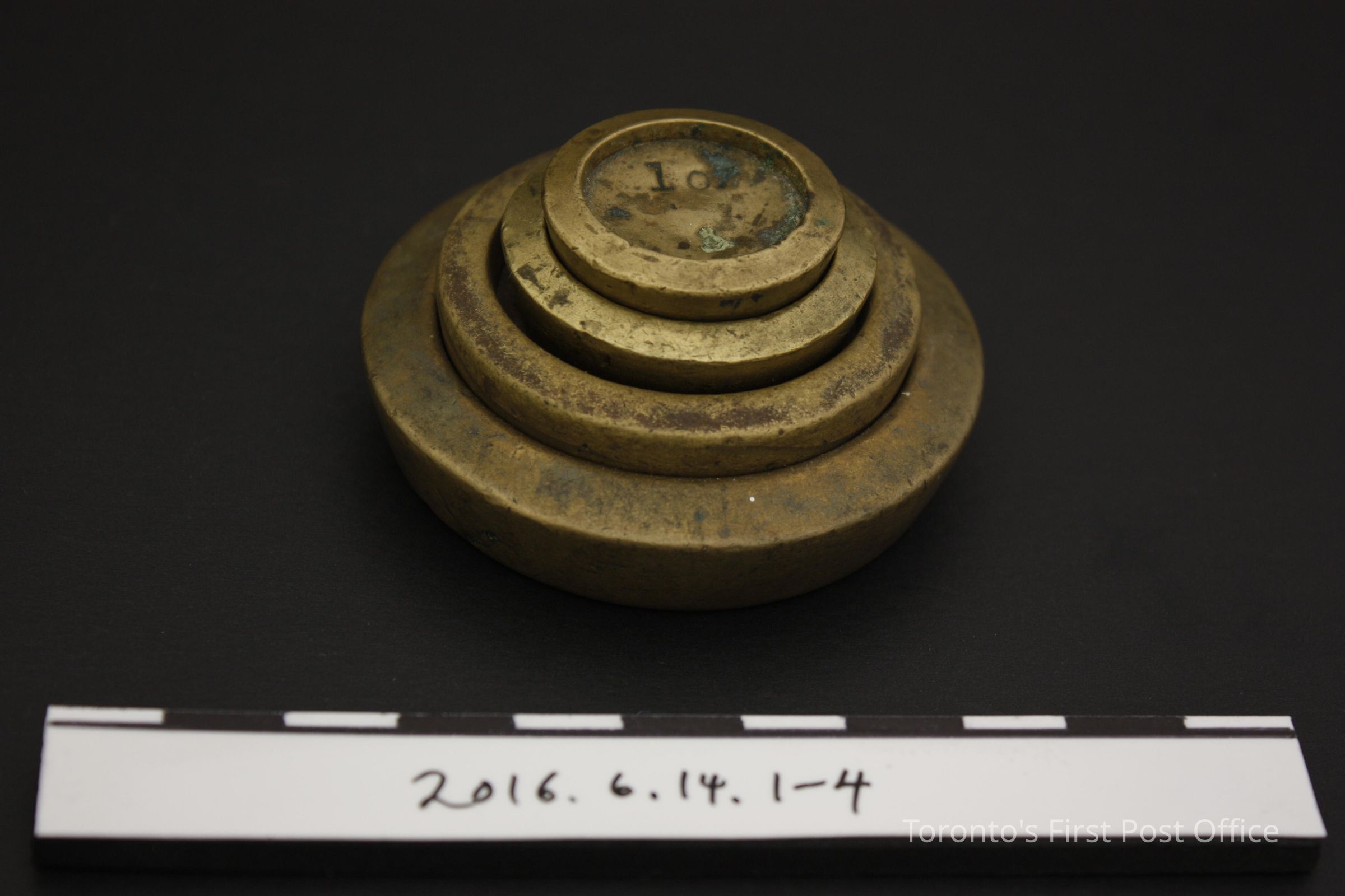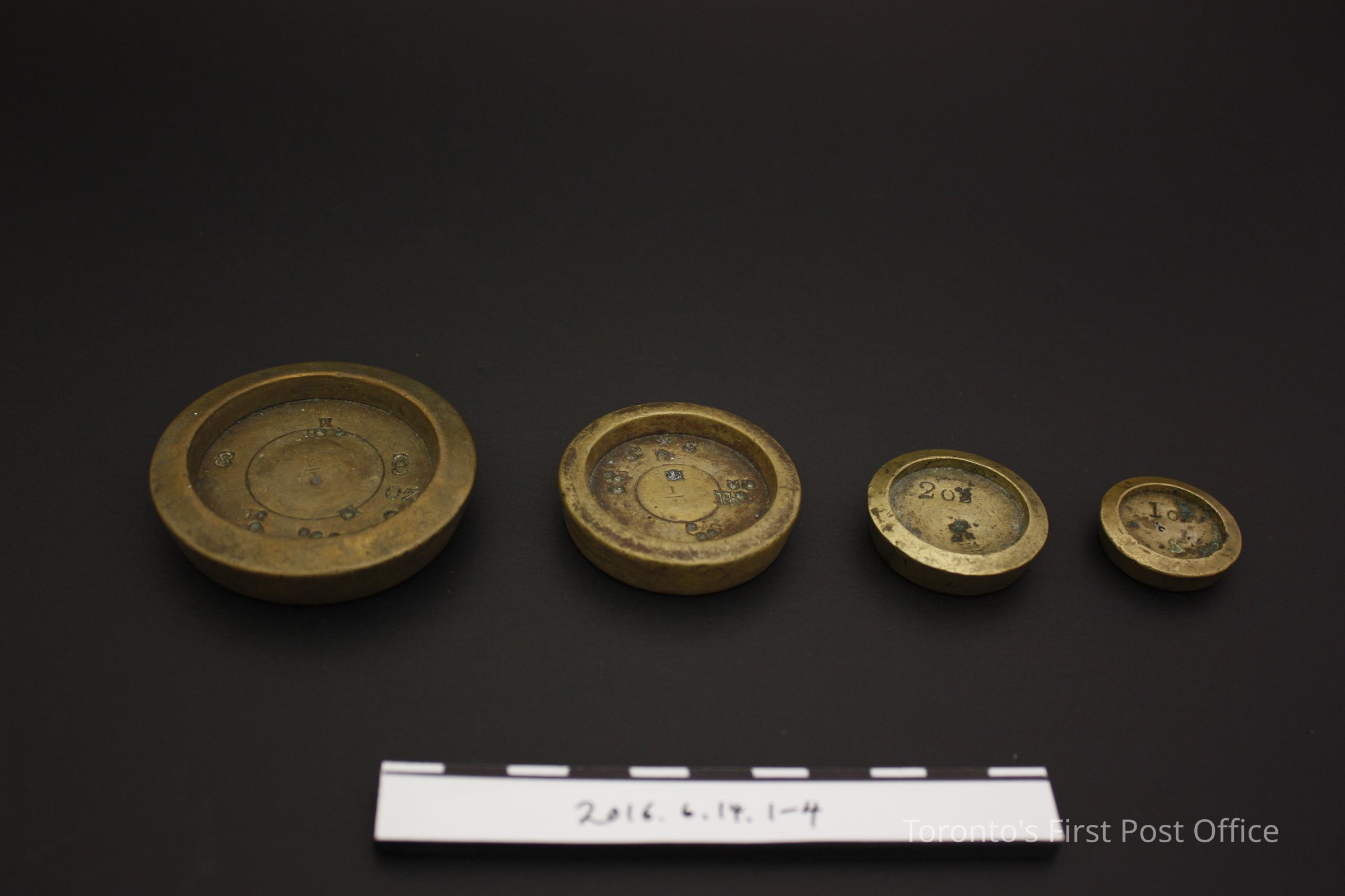 Round brass stacking weights. Four (4) weights, in denominations of 8oz, 1/4lb, 2oz, 1oz. Numerous impressed markings on the weights. Additional material, white metal on bottom of 8oz and 1/4lb weights.Dimensions