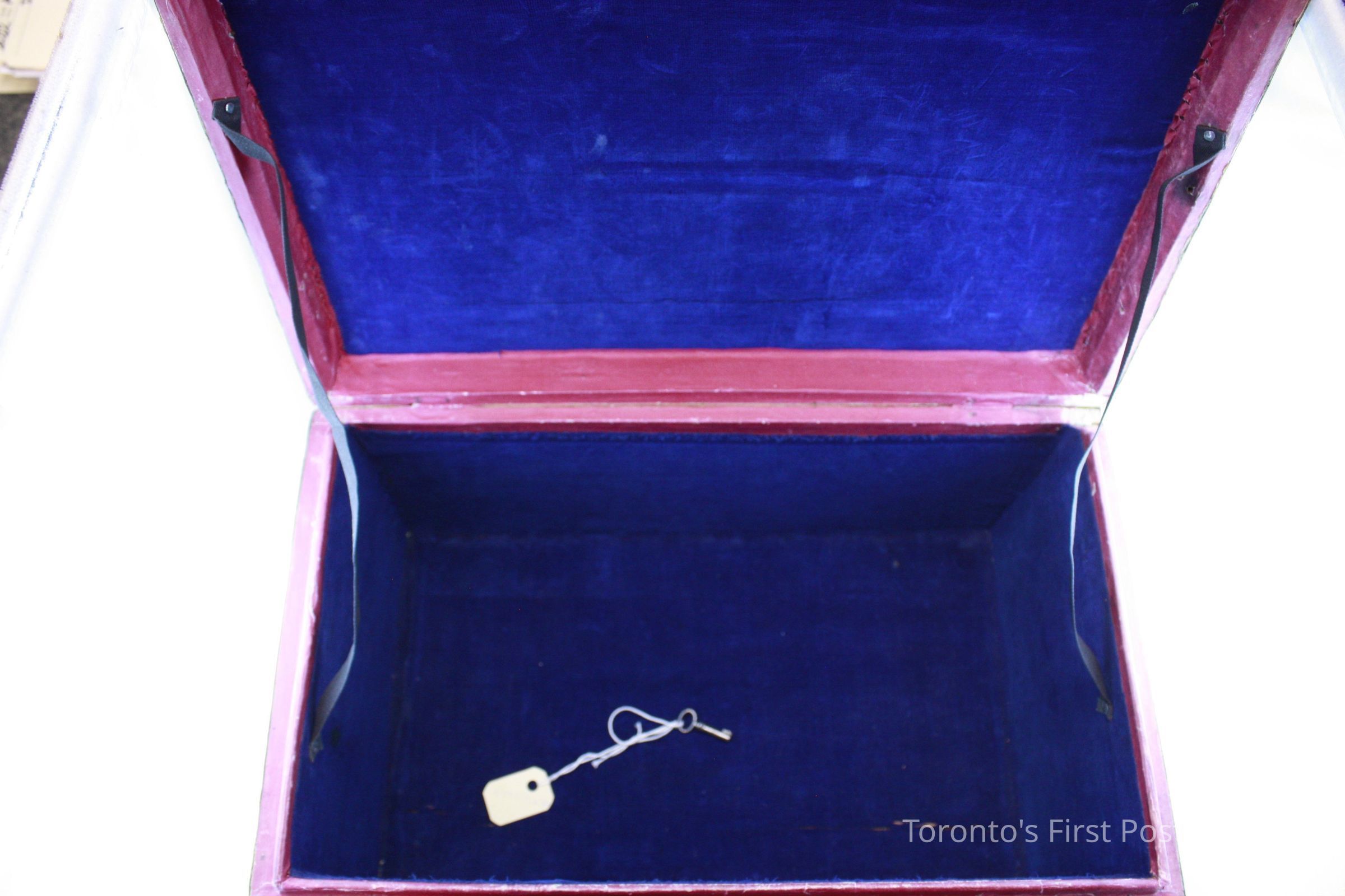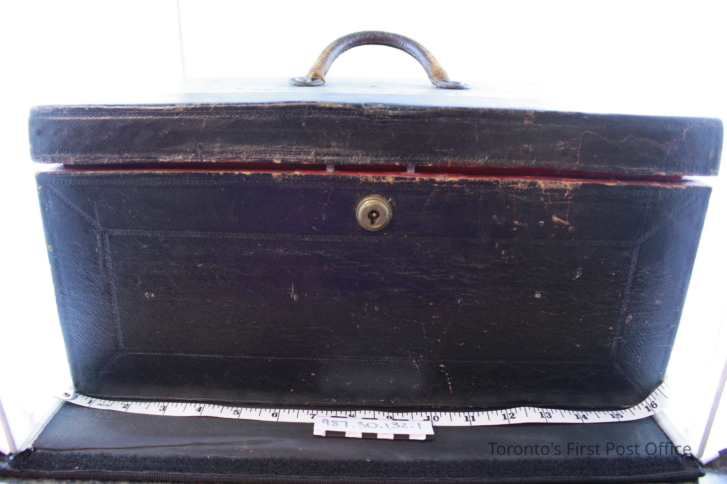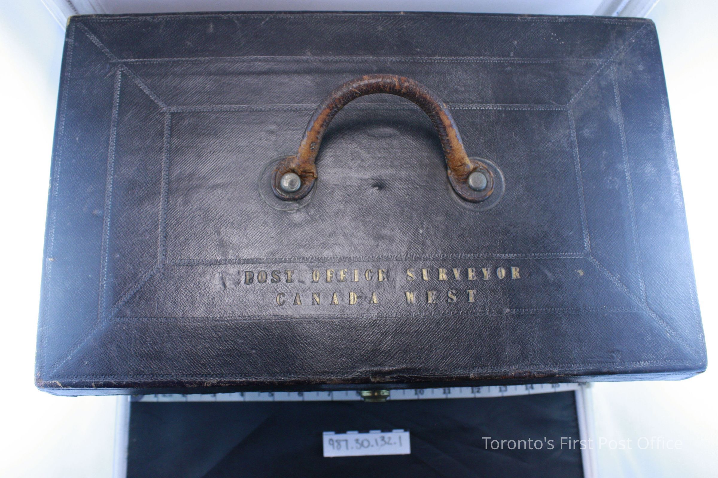Writing box/surveyors box; wood covered in dark brown leather; brass key lock; gold stamped inscription on lid: "Post Office Surveyor Canada West"; dark blue felt interior; purple/pink paper lining.Update Date