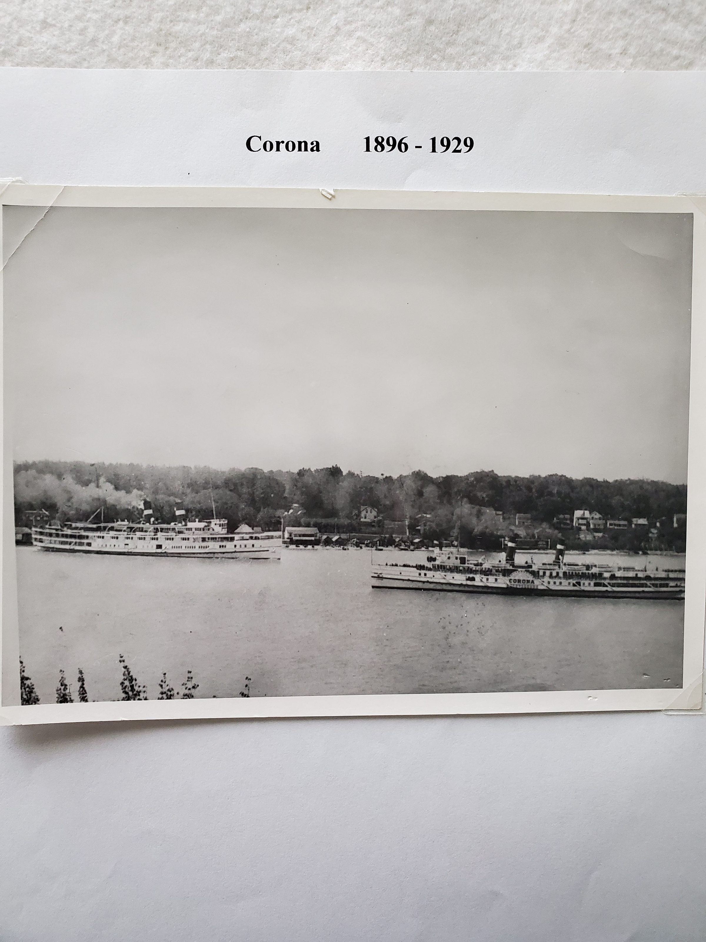 photographic print, b&w, of the ship Corona on the right in the Niagara river