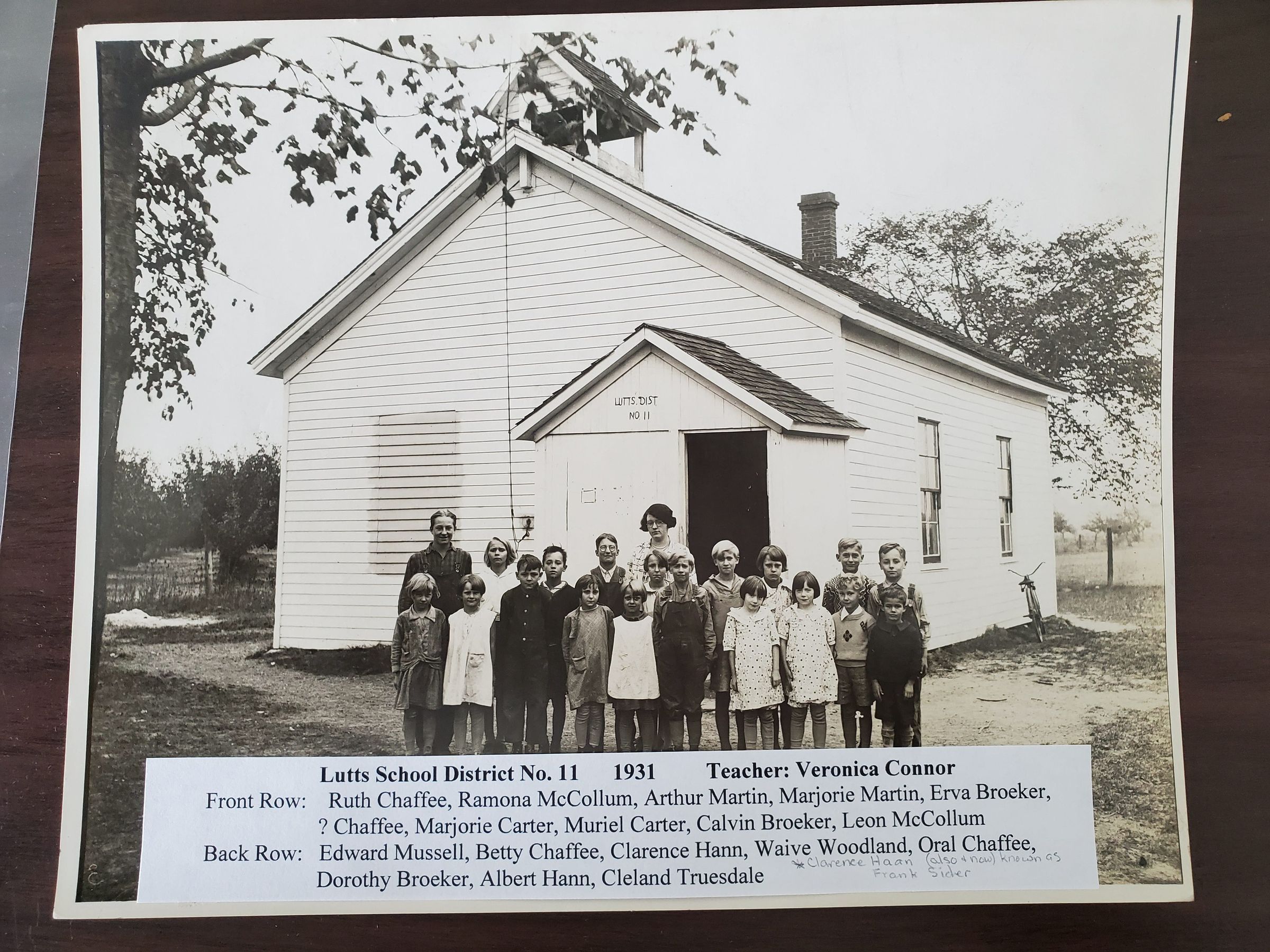 sepia colored copy of photo of Lutts District 11 students and teacher Veronica Connor in front of school; names included; 1931Acquisition