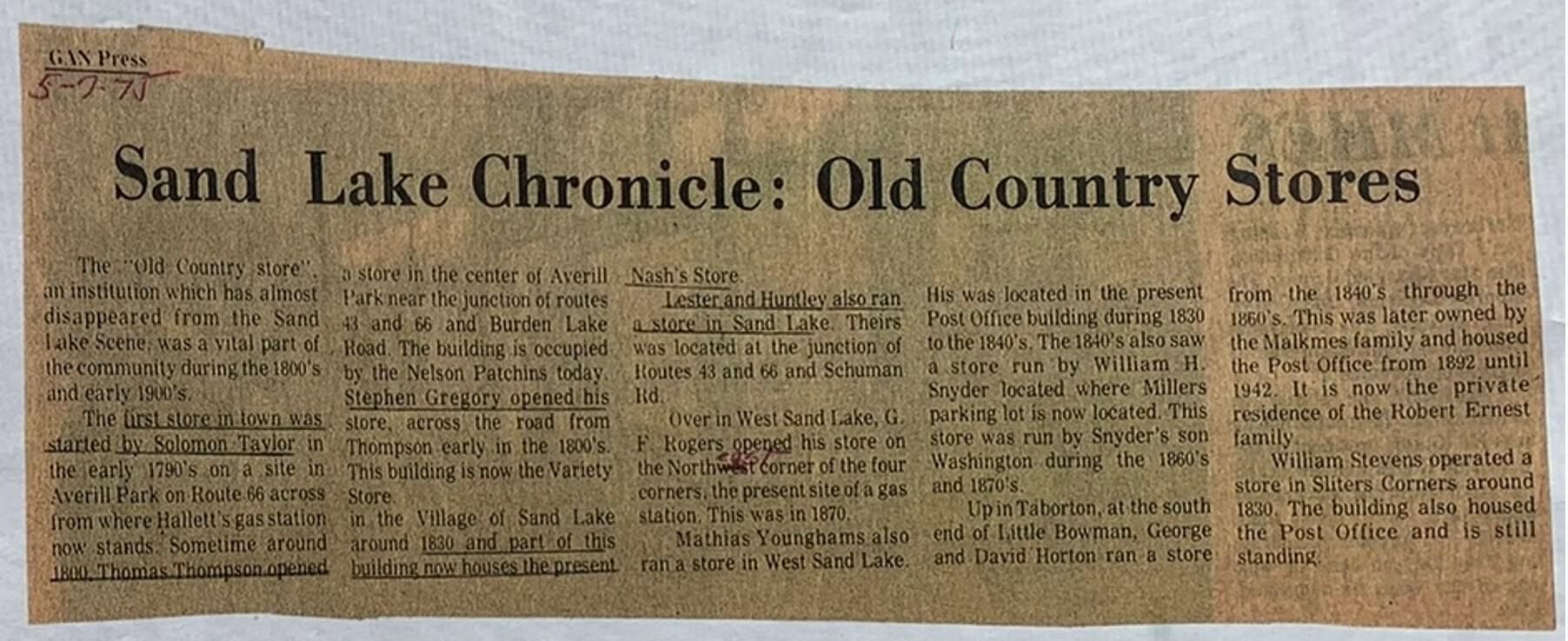 Sixty-seven-page PDF of an accounting ledger of an unidentified general store. However, based upon the notes and newspaper article displayed on pages 4 and 5 of the PDF, the store was definitely located in Sand Lake given the customers noted and, most likely, the William H. Snyder general store that once stood approximately where the parking lot of the current Hannaford (formerly Miller's) supermarket is located since Snyder's store began operation in the 1840's and the ledger opens with a zero balance. Other uncertainties include the reason why anywhere from one to several pages frequently appear to be ripped or cut out of the ledger throughout the ledger. Perhaps Regardless, the ledger is an excellent example of commerce in the Sand Lake area from 1840 t0 1853. The PDF is downloadable while fully logged into the system. Refer to the two example pages provided below for the newspaper article mentioned above and a preview of the ledger's content. A much higher resolution PDF is stored off-line and available upon request under the file name: