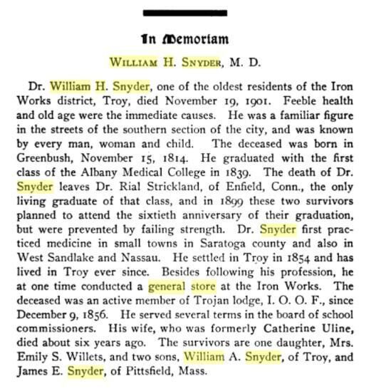 The original ledger is stored in a locked fireproof safe at Town Hall. As a final mystery, perhaps the William H. Snyder who ran the store was the same Dr. William H. Snyder noted in the 1901 Albany Medial Annals Memorial displayed below and noted in the weblinks portion of this entry since he once lived in West Sand Lake, operated a general store elsewhere, married a Uline, and moved away in the 1850s?Cataloged By