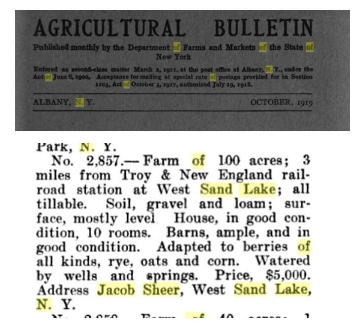 Twenty-four-page PDF detailing the labor and miscellaneous expenses required to operate the Jacob Sheer family farm and resulting products produced and revenues received in return in the Town of Sand Lake, NY, from March of 1872 through March of 1906. Sheer was an early settler of the Town of Sand Lake and still has local roads and points of interest named in his family's honor. The ledger was donated to the Town by Ms. Ethel Lillian Sheer and its entries provide a by-name accounting of the numerous individuals and area businesses employed by the farm, their wages or payments over the years, and an overview of what it took to operate a 100-acre farm with a 10-room house and ample barns in good condition with its own wells and spring that was ideally suited to raising berries of all sorts, rye, oats, and corn and for sale and overall valued at $5,000 per the NYS Department of Agriculture in 1919. The PDF is downloadable while fully logged into the system. Refer to the provided example page for a preview of its content. A much higher resolution PDF is stored off-line and available upon request under the file name: