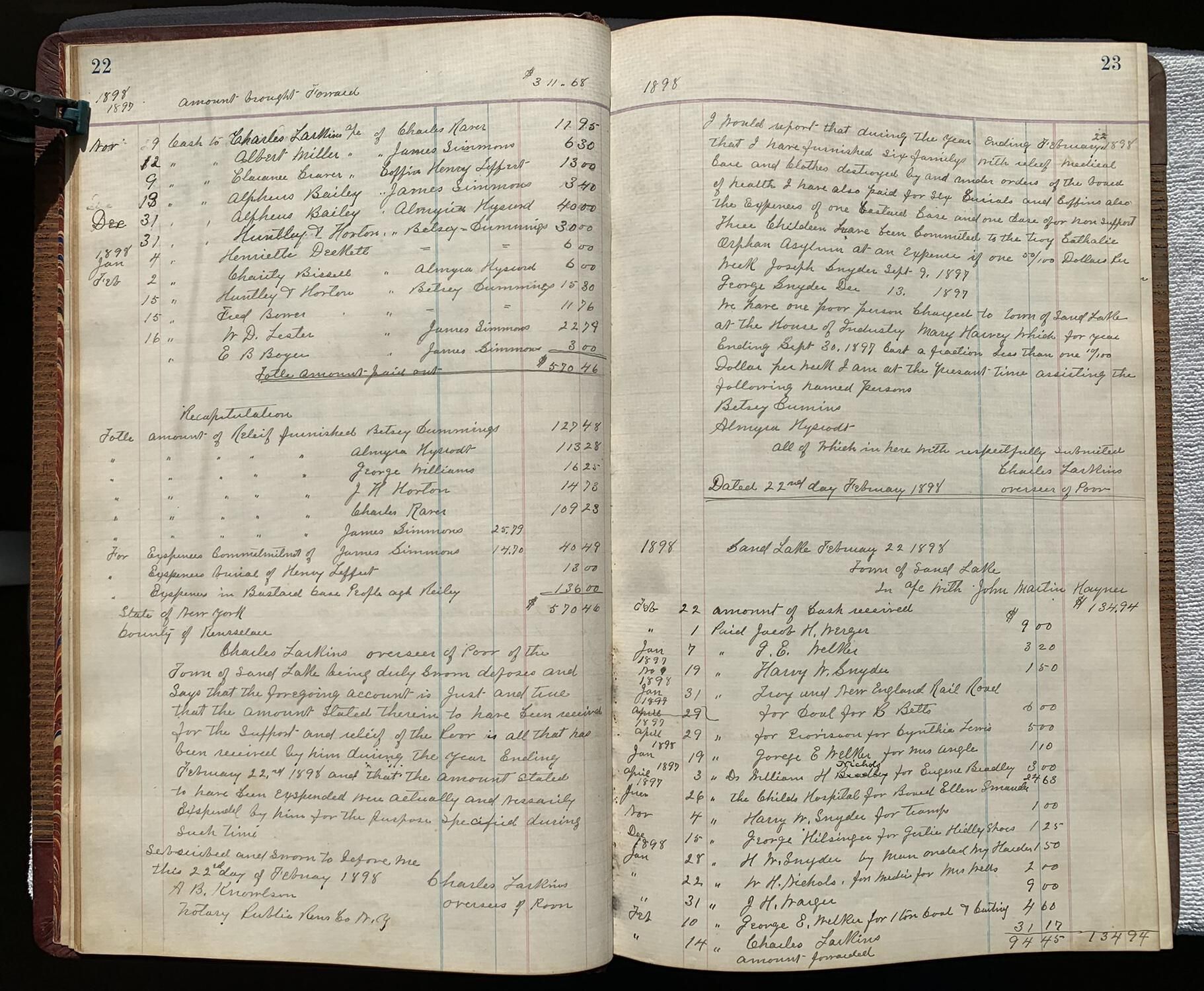 - First is a thirty-Eight-Page PDF of the Poor Master's Book of the Town of Sand Lake, NY, which records public welfare expenses, justifications, and audits from 1891 through 1915. Poor Masters validated requests for public relief either directly or via a subordinate Overseer of the Poor. For example, page 23 (displayed below) approves Overseer of the Poor Charles Larkin providing six families with medical and basic needs, paying for six burials, supporting illegitimate children, and committing one able-bodied debtor to the county poorhouse. Per the, "1895-1934 Overseers of the Poor Accounting Ledger," entry in this folder, Towns and their Overseers of the Poor were primarily responsible for public welfare until the New Deal of the 1930s shifted most of that responsibility to the State and Federal governments. The PDF is downloadable while fully logged into the system. Refer to the example page for a preview of its content. A much higher resolution PDF is stored off-line and available upon request under the file name: