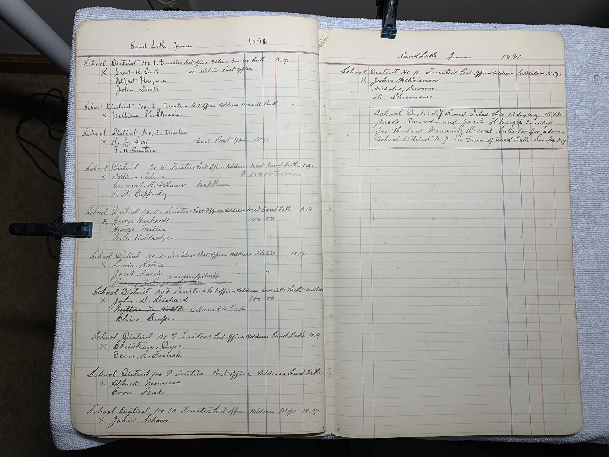Twenty-three-page PDF of poll lists, election certifications, and school district and school trustee assignments. The label on the cover of the ledger simply states, "Poll List Sand Lake NY March 6th 1894." However, the ledger actually includes separately certified poll lists for 1894 and 1895, separate certifications of election results for each of those years, and two separate school district and corresponding trustee lists for 1896 and 1897. The poll list and election results note challenges by the elected election inspectors and the local court and justices of the peace appear to have had a much larger role than today in conducting the elections, resolving any disputes, and certifying the results. The PDF is downloadable while fully logged into the system. Refer to the three example pages for a preview of its content. A much higher resolution PDF is stored off-line and available upon request under the file name: