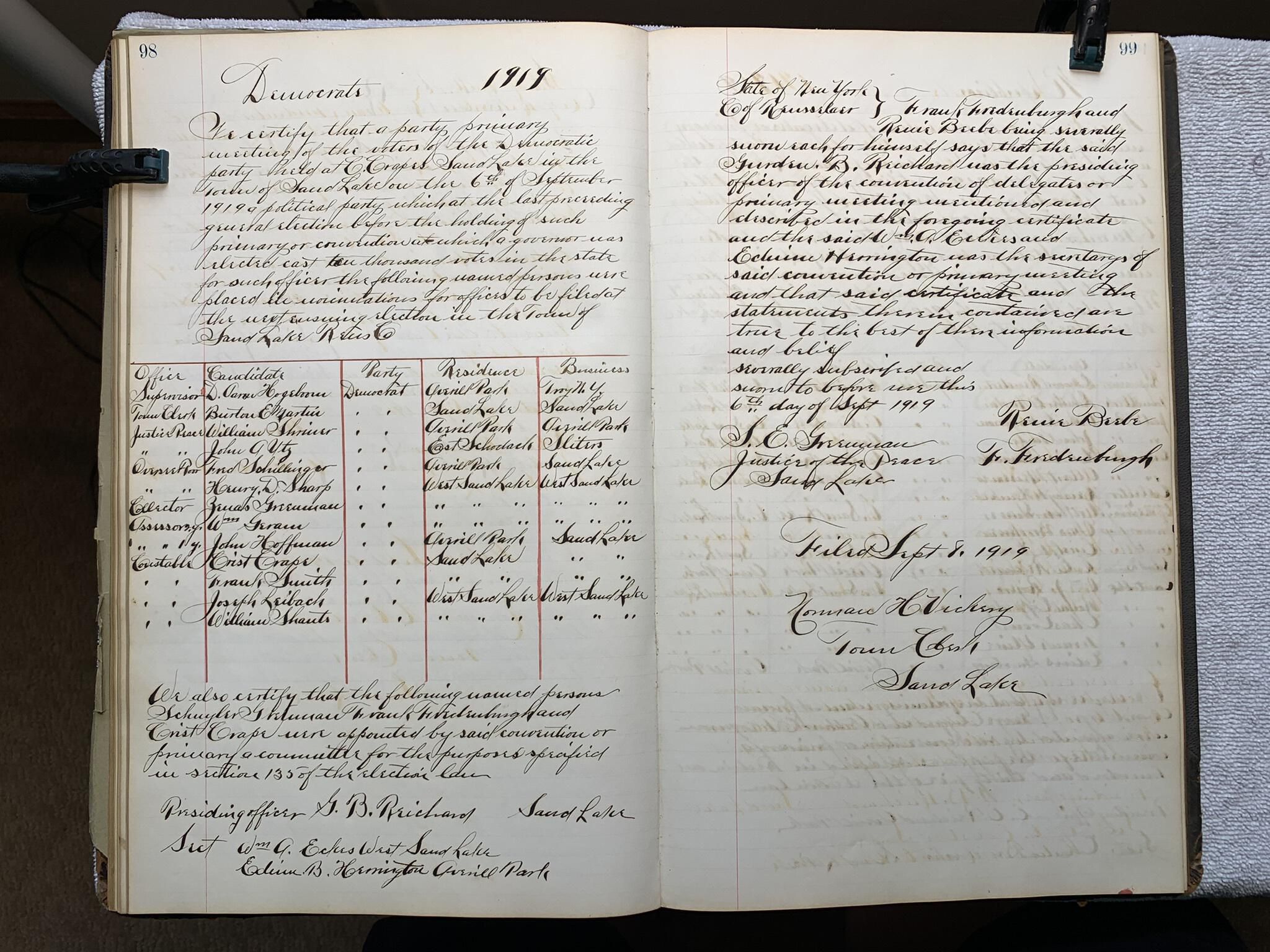 The election and voting records begin on page 51 of the ledger and continue through page 101 of the ledger. Pages 51 through 83 primarily relate to election expenses, results, and oaths of office covering the time period 1901 to 1913. Pages 84 through 101 record the Town primary/convention results for nominating the Democratic, Republican, and Prohibition party candidates for Town offices during the 1915, 1917, and 1919 elections.