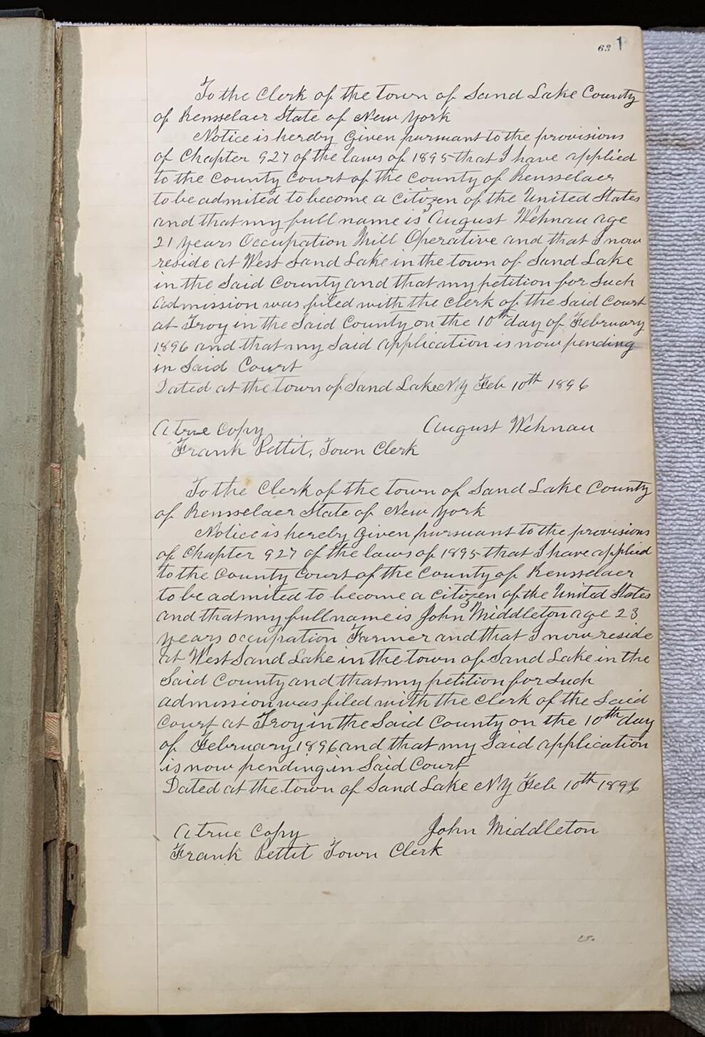 Specifically, the citizenship papers appear in the first five pages of the PDF and formally certify that the following twelve Sand Lake residents had applied for citizenship via Rensselaer County between 1896 and 1901: August Wehnau, John Middleton, Robert Snyder, Christian Gentner, Gotleb Engle, Frederick Suppes, Charles Wehnau, Christian Schneider, Gotleb Angle, William Bennsteel, Edward Angle, and Robert Angle. The entries also note the applicant's age, occupation, residence, and entry date per the examples provided below.