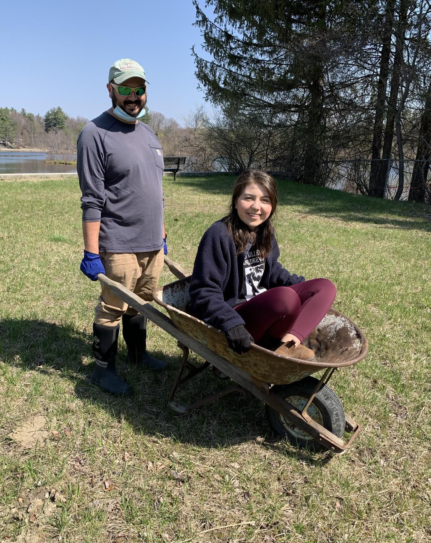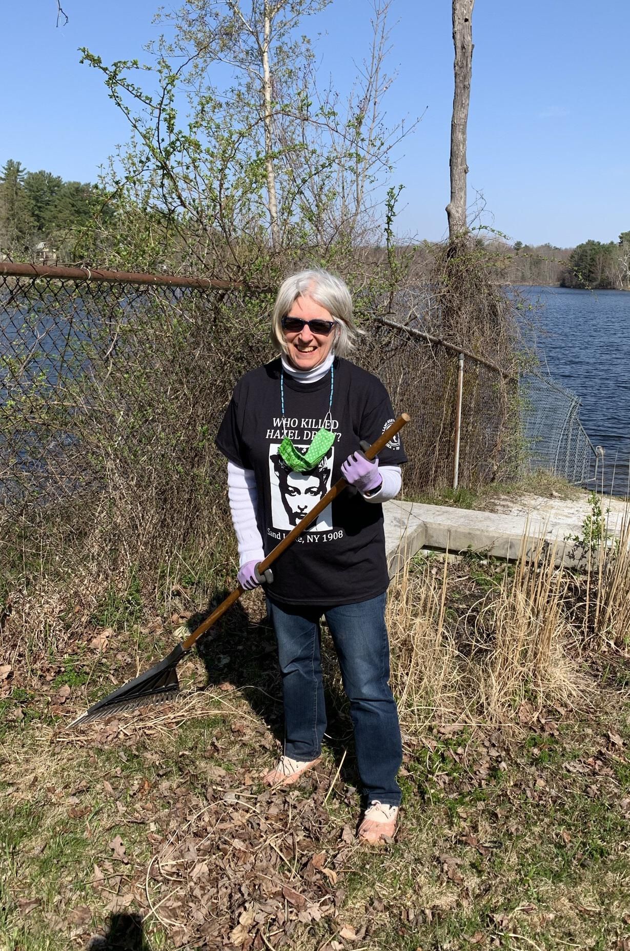 SLHS sponsored "Town Beach Team" during the Spring 2021, "Make Sand Lake Shine," Earth Day celebration, town-wide clean-up. SLHS volunteered to clean-up the Town Beach area. Pictured are Jane Minotti, Jennifer Perry and Mike Perry of SLHS plus additional volunteers Jesse Keltz and Kevin Williams. The Team collected and removed numerous bags of litter, debris and leaves from the Town Beach area. SLHS participants wore, "Who Killed Hazel Drew," t-shirts, which helped attract several new SLHS members as well as sell three t-shirts.