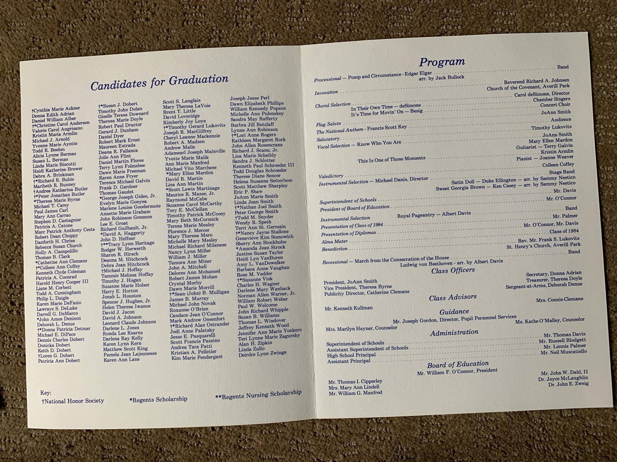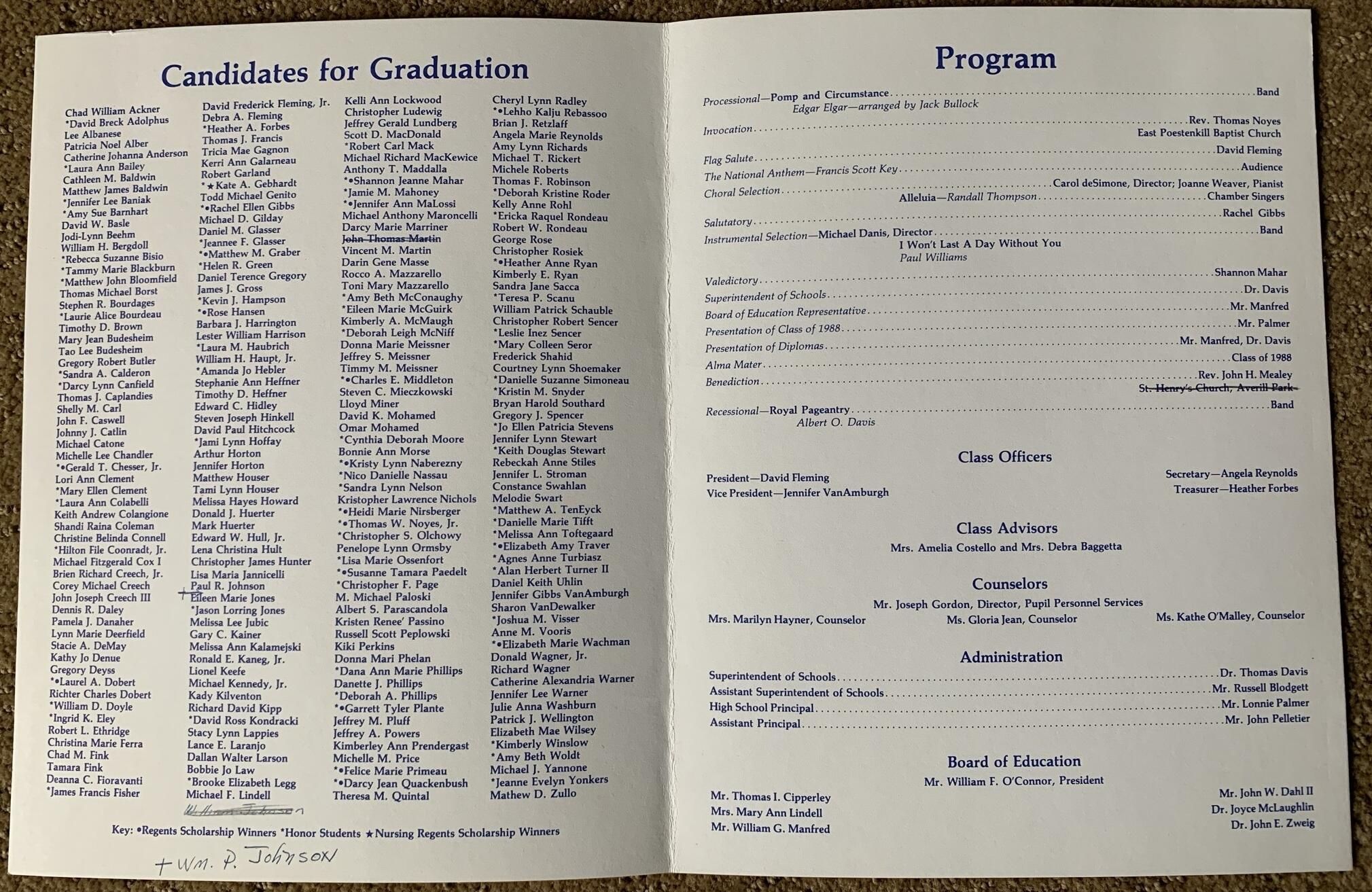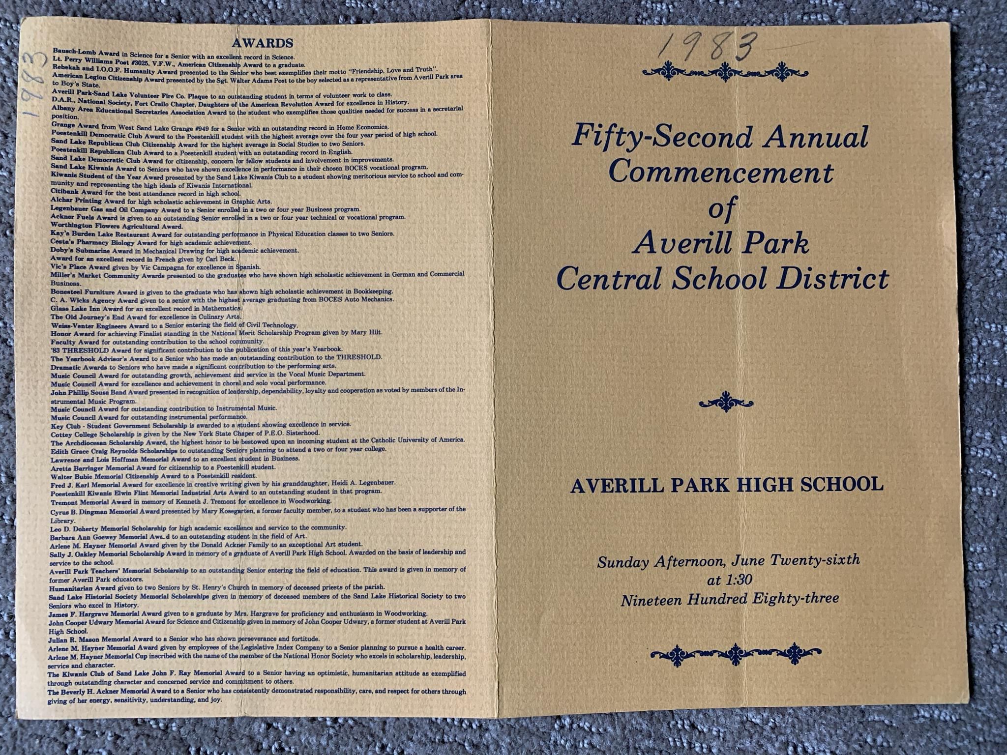 Each year the Sand Lake Historical Society (SLHS) sponsors the award of typically $100 each to an Averill Park High School (APHS) graduating male and female student who have demonstrated an exception interest in historical studies and in the memory of past SLHS members. This entry notes the SLHS member memorials made and, as/if noted, student winners from 1980 through 1989 as well as includes photos of the APHS Commencement Ceremony Programs for most of those years. These artifacts are stored in a SLHS Scholarship Program folder that can be found in Drawer 1 of SLHS File Cabinet 2 located on the second floor of Town Hall. The awards continued through present, but similar records are not readily available.Context