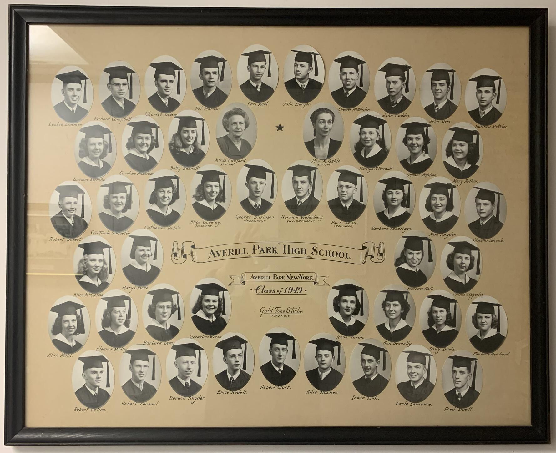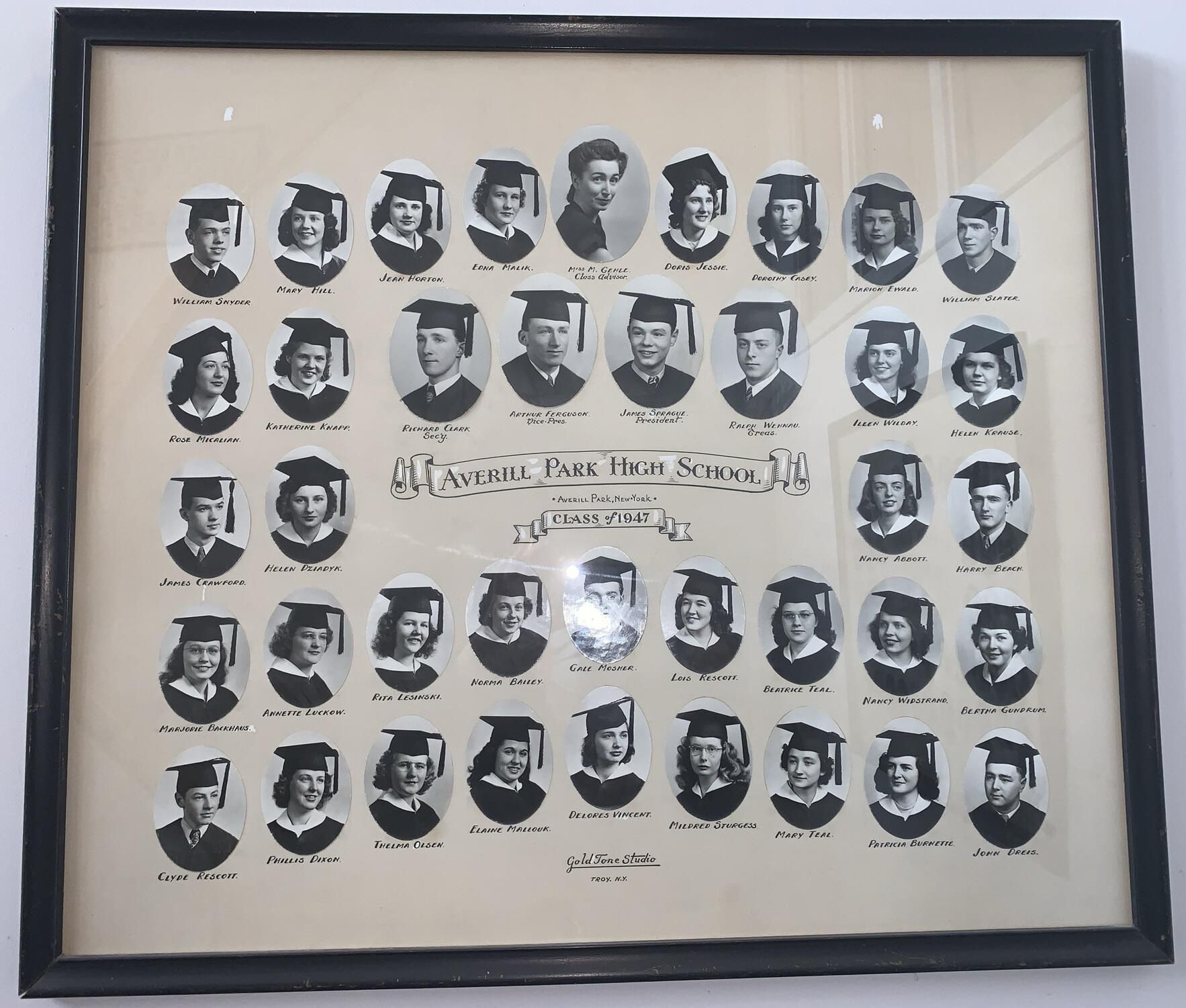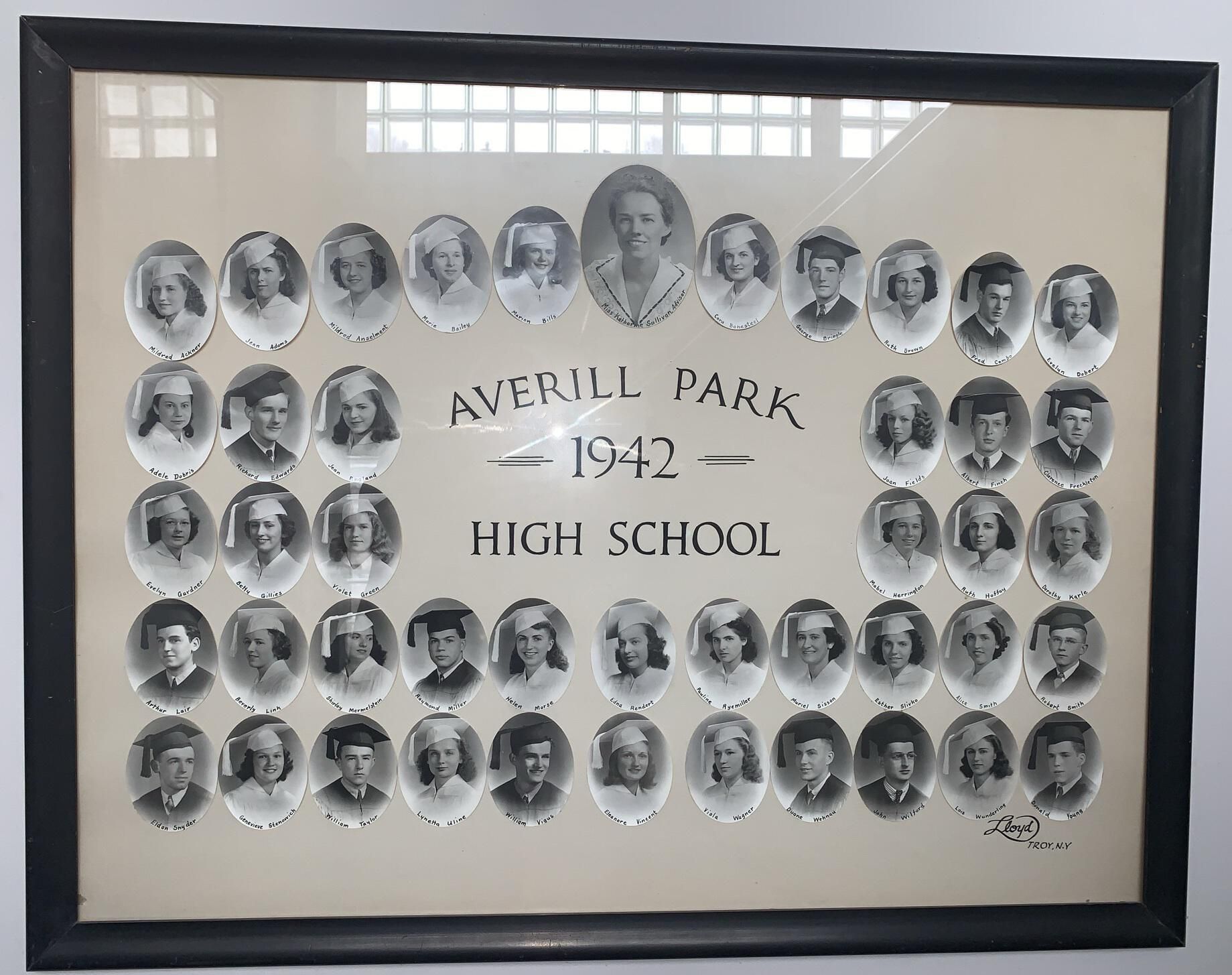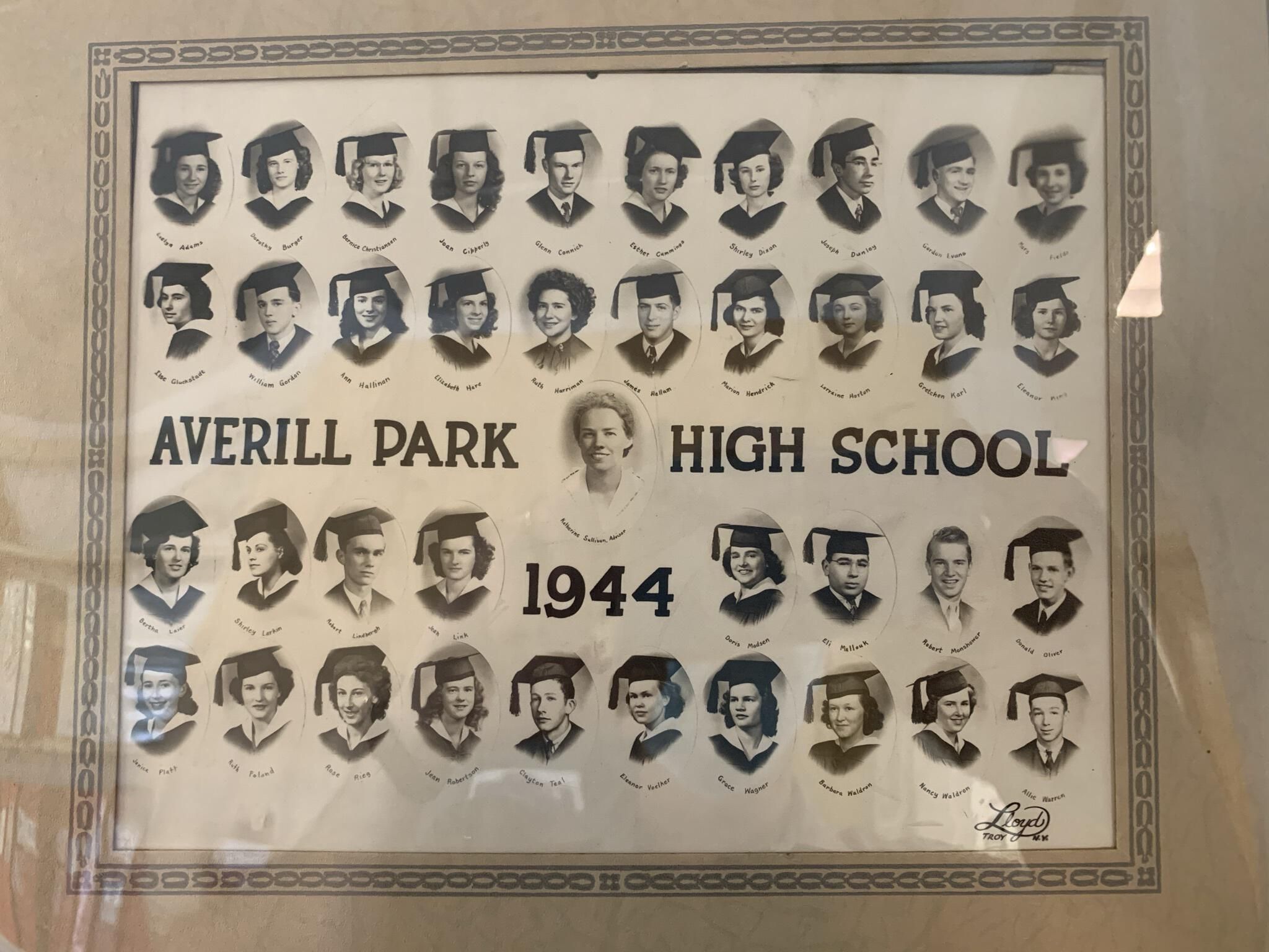 Averill Park High School (APHS) graduating class photographs for 1932, 33, 35, 36, 39, 41, 42, 43, 44, 45, 46, 47, 48, 49, 50, 51, 52, 53, and 55. All of these photocollages other than 1944 are currently hung on the walls in the hallways throughout the 1st-floor, main entrance stairway, and a 2nd-floor hallway of the Town Hall of the Town of Sand Lake, NY. 1944 is currently being framed for hanging. NOTE: Higher resolution photographs available via the main SLHS database.Photograph Details