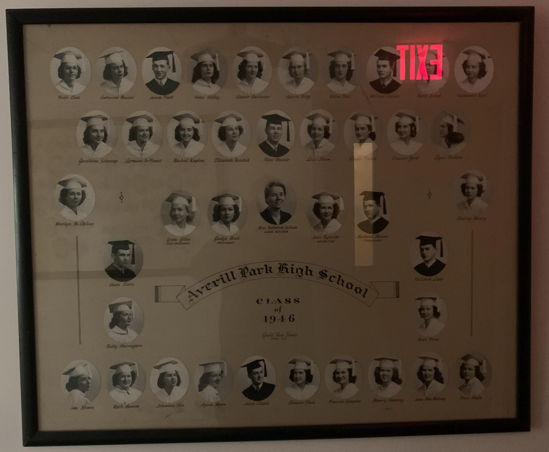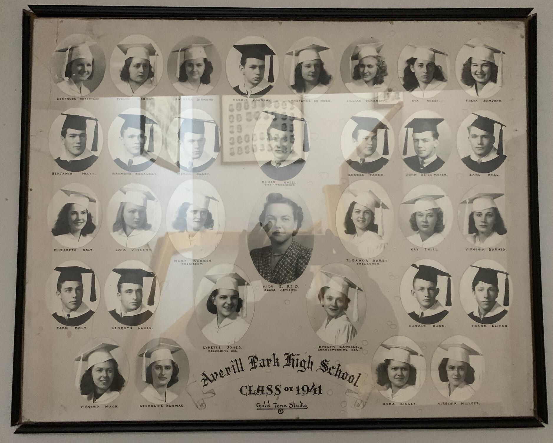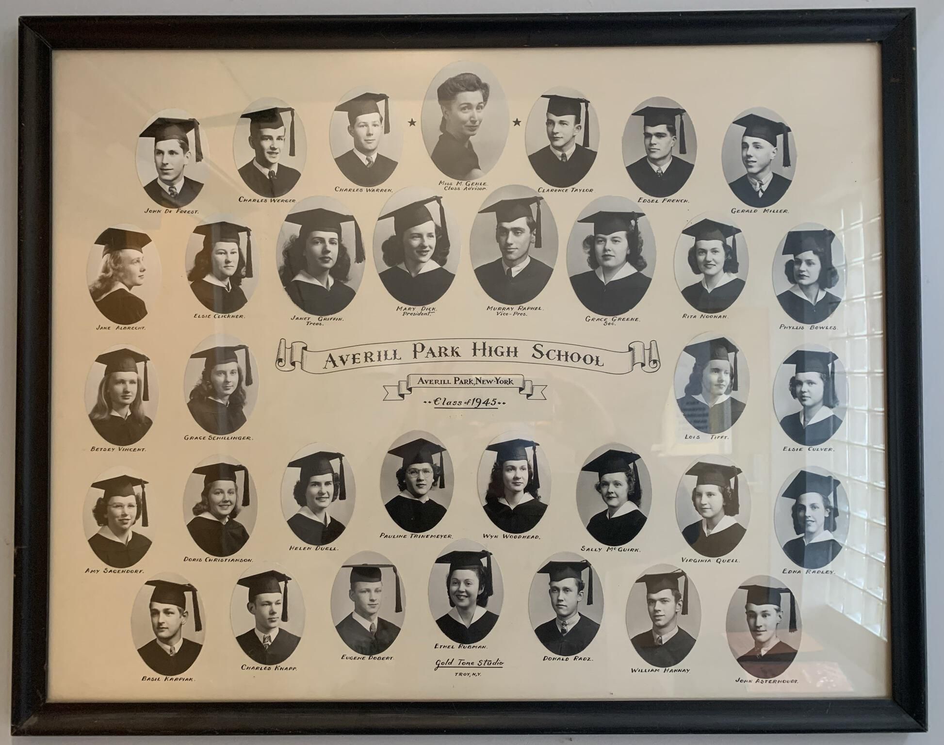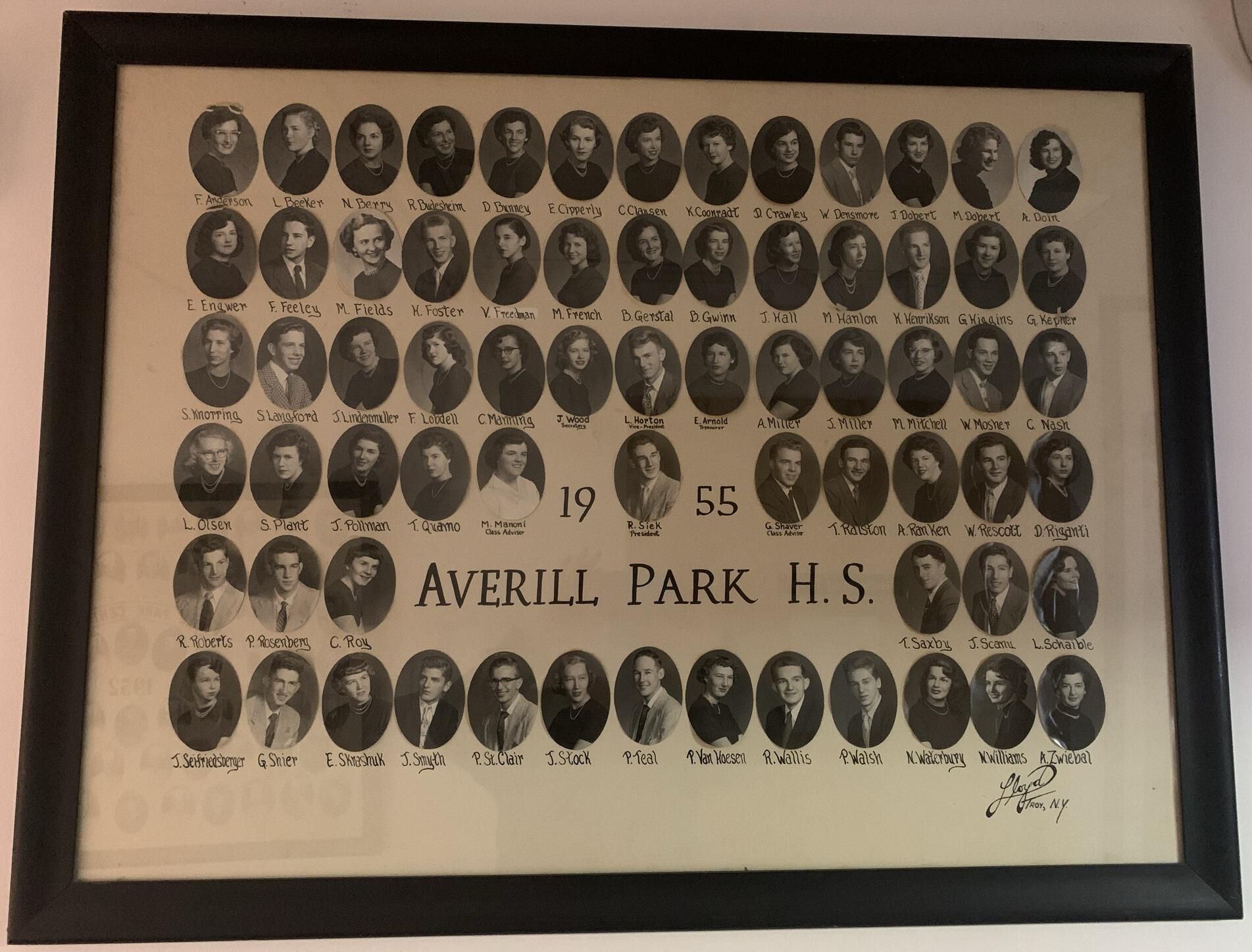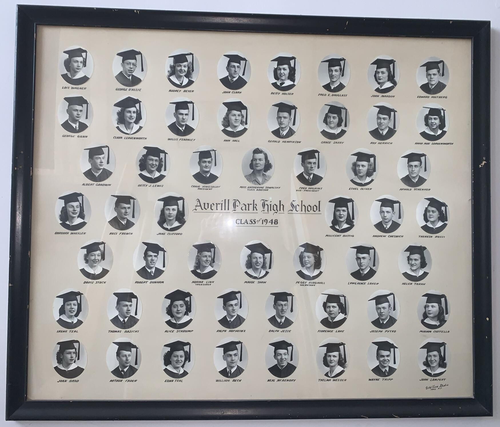 Averill Park High School (APHS) graduating class photographs for 1932, 33, 35, 36, 39, 41, 42, 43, 44, 45, 46, 47, 48, 49, 50, 51, 52, 53, and 55. All of these photocollages other than 1944 are currently hung on the walls in the hallways throughout the 1st-floor, main entrance stairway, and a 2nd-floor hallway of the Town Hall of the Town of Sand Lake, NY. 1944 is currently being framed for hanging. NOTE: Higher resolution photographs available via the main SLHS database.Photograph Details