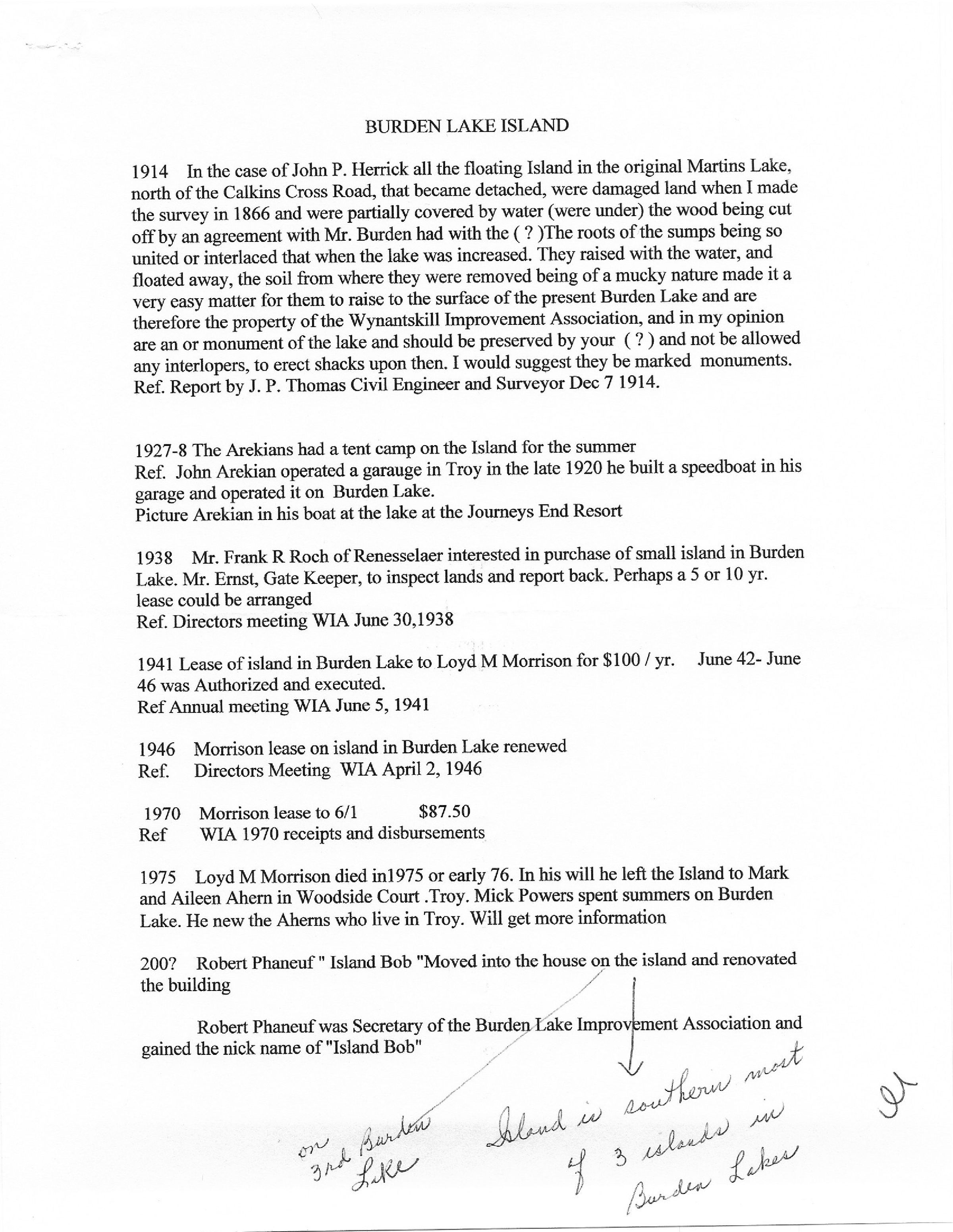 Historical notes regarding the ownership, development and occupancy of Burden Lake Island up to and including its occupancy by Island Bob Phaneuf who once owned a notably historically renovated (recipient of an SLHS award) variety store in Sand Lake. This two-page PDF can be downloaded while fully logged into the system. Hardcopy of the PDF can be found in the, “General Articles Binder #2,” which is located in Drawer 3 of SLHS File Cabinet 1 on the second floor of Town Hall.Cataloged By