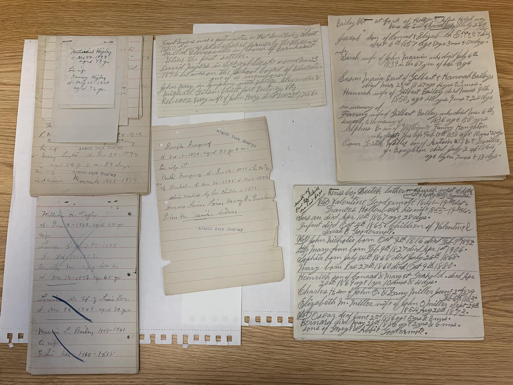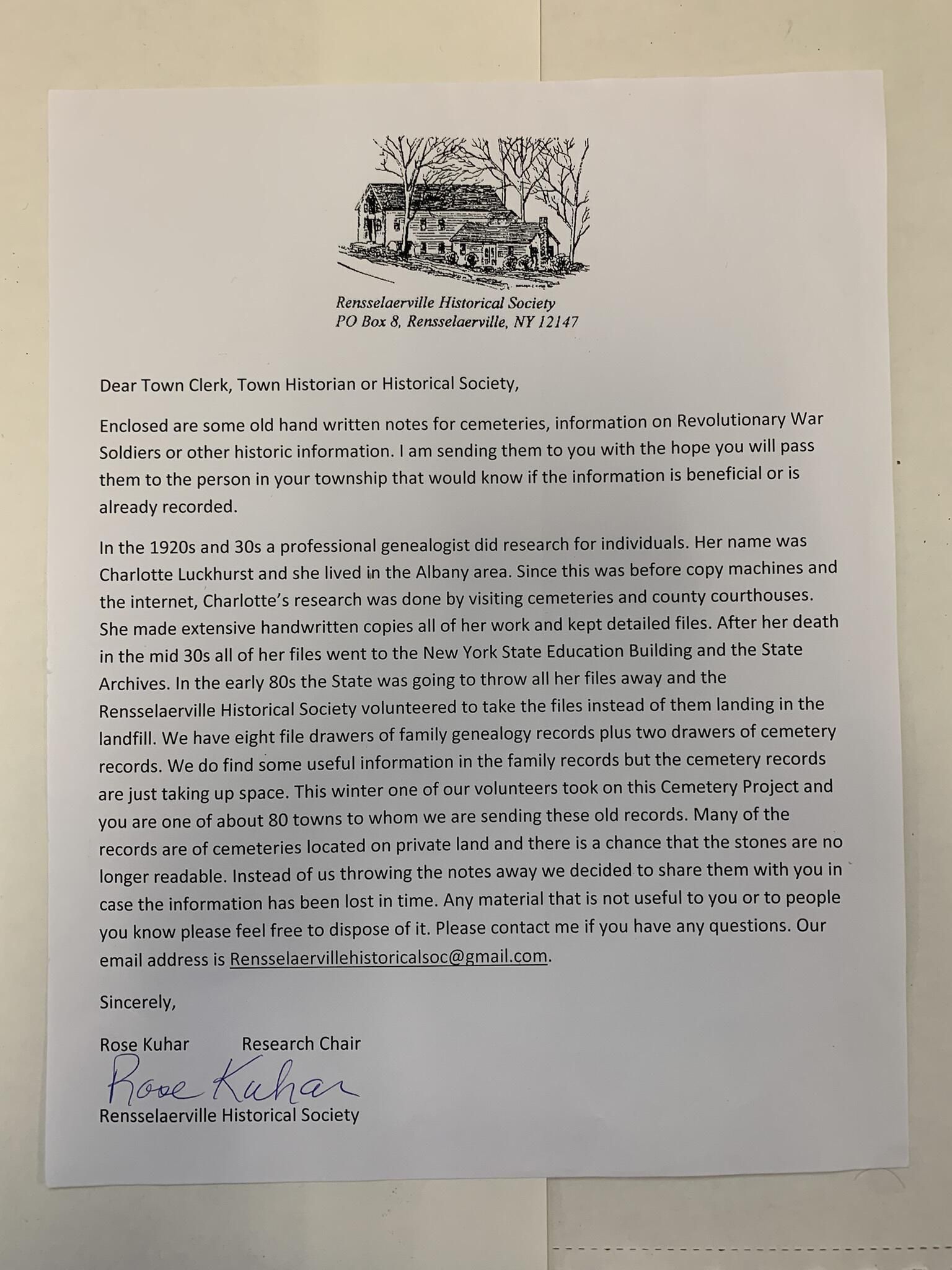 Collection of disjointed handwritten notations of cemetery, grave, and headstone locations and epitaphs reportedly collected by professional genealogist Charlotte Luckhurst (best known and searched as Charlotte Tayor Luckhurst) in the 1920s and 30s. Donated to SLHS by the Rensselaerville Historical Society in 2017 per the included transmittal letter. While likely of marginal use as compared to modern on-line services such as find a grave or ancestry sites, they may offer some useful information to those particularly familiar with the history of Sand Lake. The records are stored the mailing envelope pictured below and SLHS File Cabinet 5 - Drawer 2. Charlotte published several important genealogical compilations per the references cited in the weblinks portion of this entry.Cataloged By