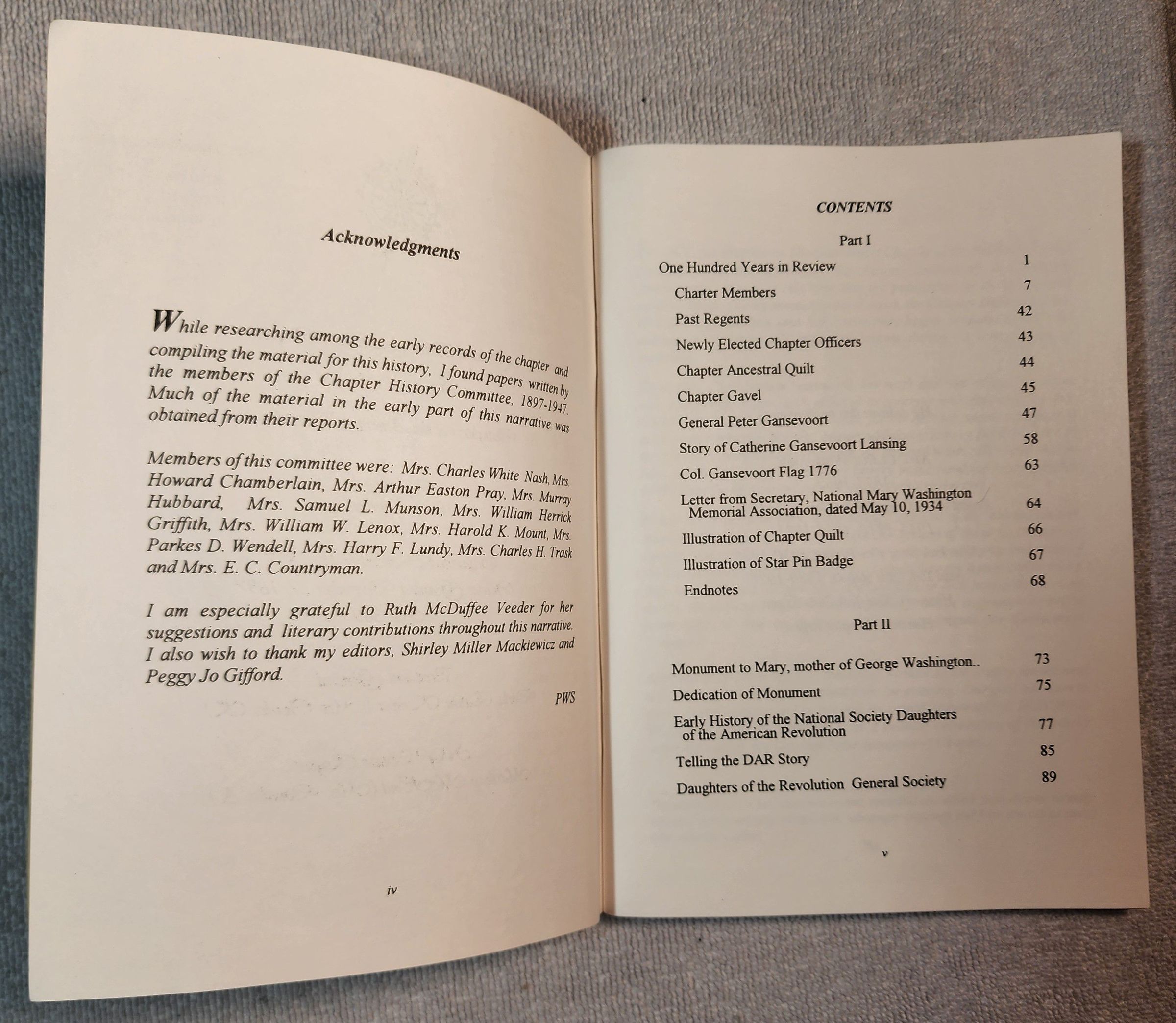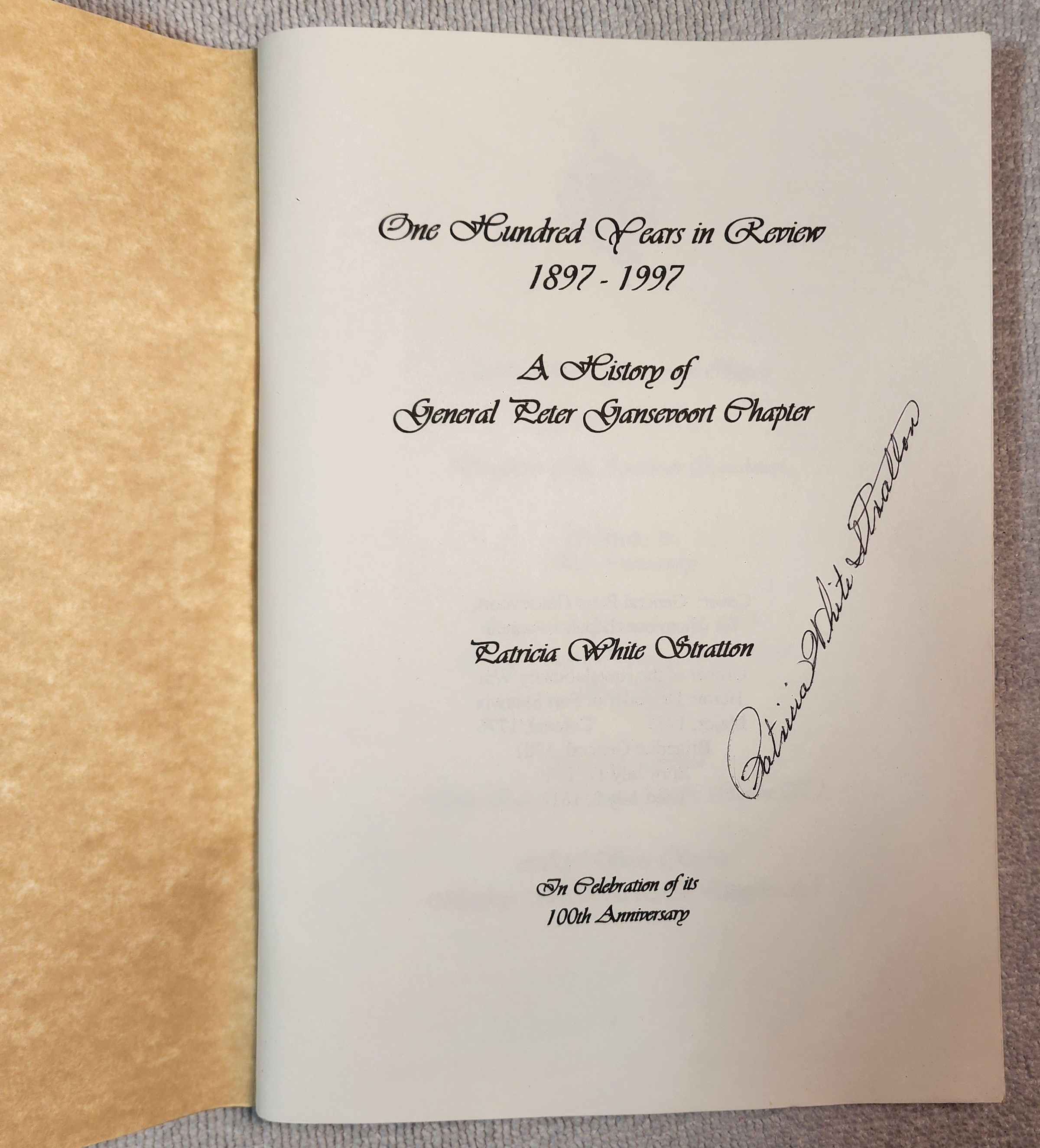 One-hundred-year anniversary and history publication authored by Daughters of the American Revolution (DAR), General Peter Gansevoort Chapter member Patricia White Stratton. The publication is signed by Ms. Stratton, who passed away in 2023, and describes the Chapter's support of the Historic Van Schaick Mansion in Cohoes, NY, which was the site of considerable American Revolution military strategy and history, per the web links portion of this entry.Cataloged By