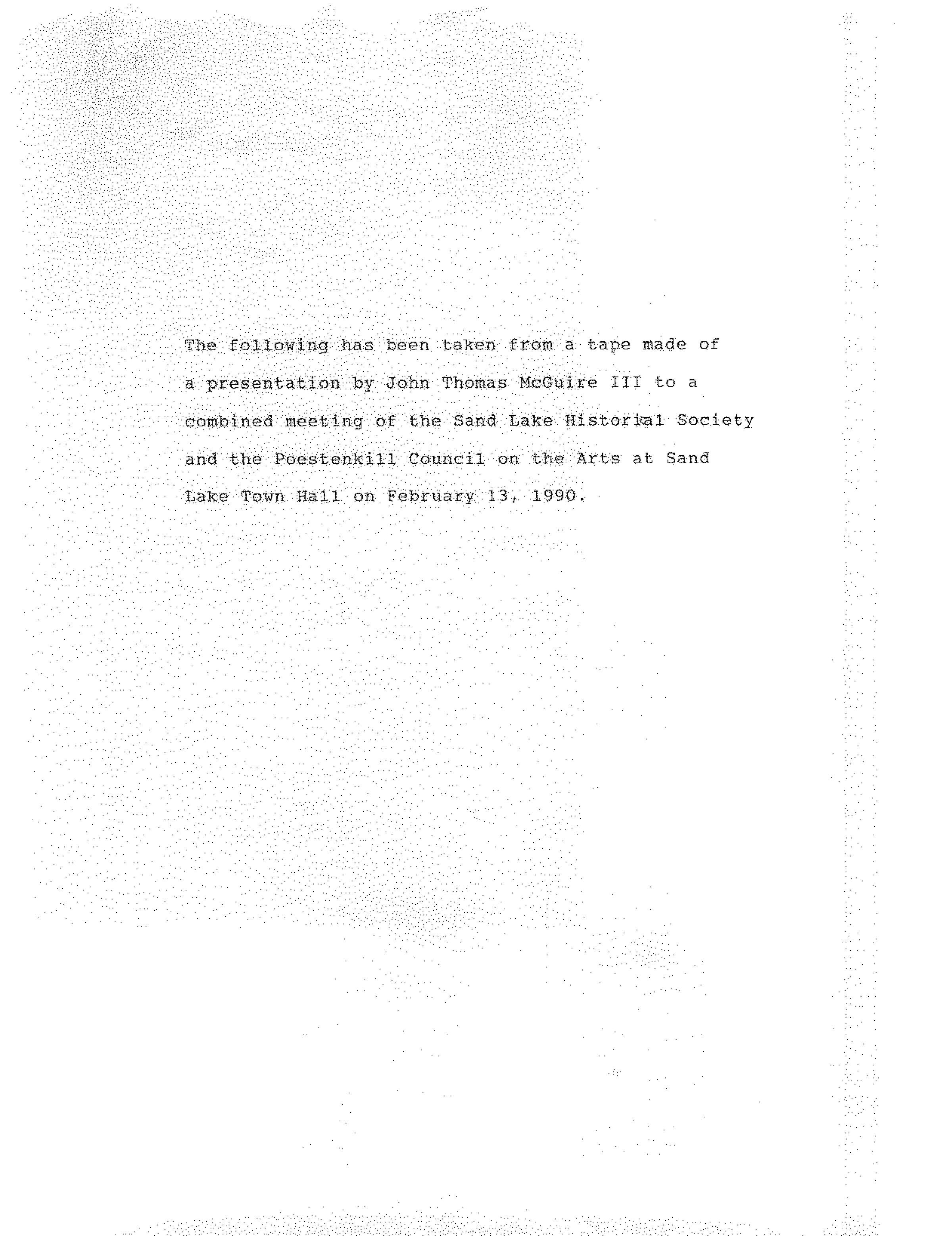 Twelve-page PDF transcript of a cassette tape recording of a February 13, 1990, combined SLHS and Poestenkill Council on the Arts program presentation by John Thomas McGuire III regarding a visit to Moscow, Russia, by members of the Empire State Institute for the Performing Arts (ESIPA) as part of a cultural exchange program. The PDF is downloadable while fully logged into the system. The original copy and additional unscanned supporting documentation are located in, "Blue Presentations Folder #1," which is stored in SLHS File Cabinet 5 - Drawer 3.Cataloged By