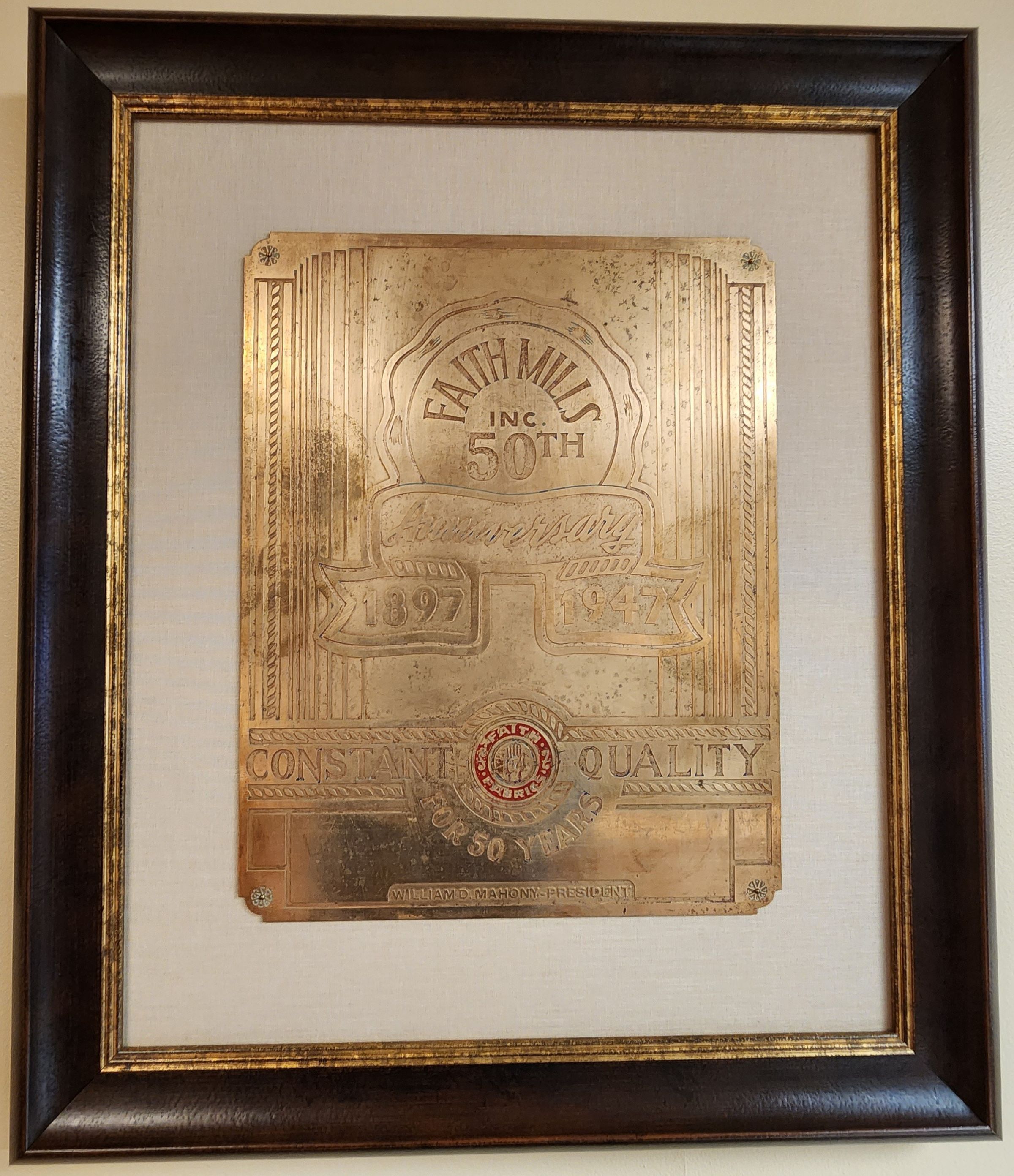 Bronze plaque presumably commissioned by Faith Mills, Incorporated, which was located in the Town of Sand Lake and Hamlet of Averill Park, NY, and a major employer of Sand Lake residents from 1897 through its closing in the mid 1960s due to unionization and labor disputes. Specifically, the plaque commends the manufacturer's "CONSTANT QUALITY FOR 50 YEARS" beginning in 1897 and continuing through 1947 with William D. Mahoney serving as its President at the time.Cataloged By