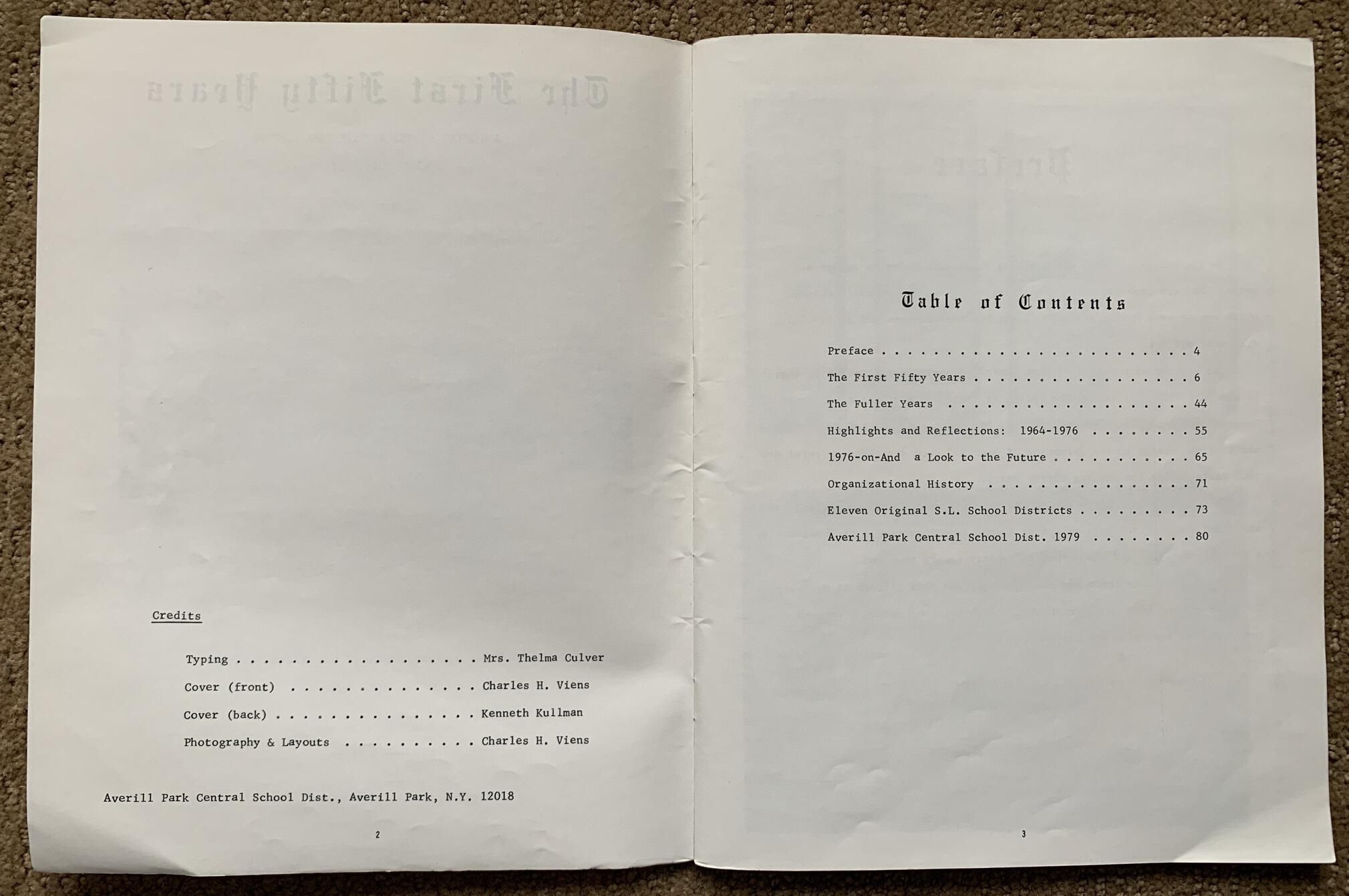 Publication commemorating the first 50 years (1929 - 1978) of the Averill Park Central School. Only the first few pages of this 88-page booklet are presented here for sake of efficiency. Refer to the archival hardcopy stored in Drawer 1 of SLHS File Cabinet 2 located on the 2nd Floor of Town Hall for hard copy of the entire document as/is desired.Cataloged By