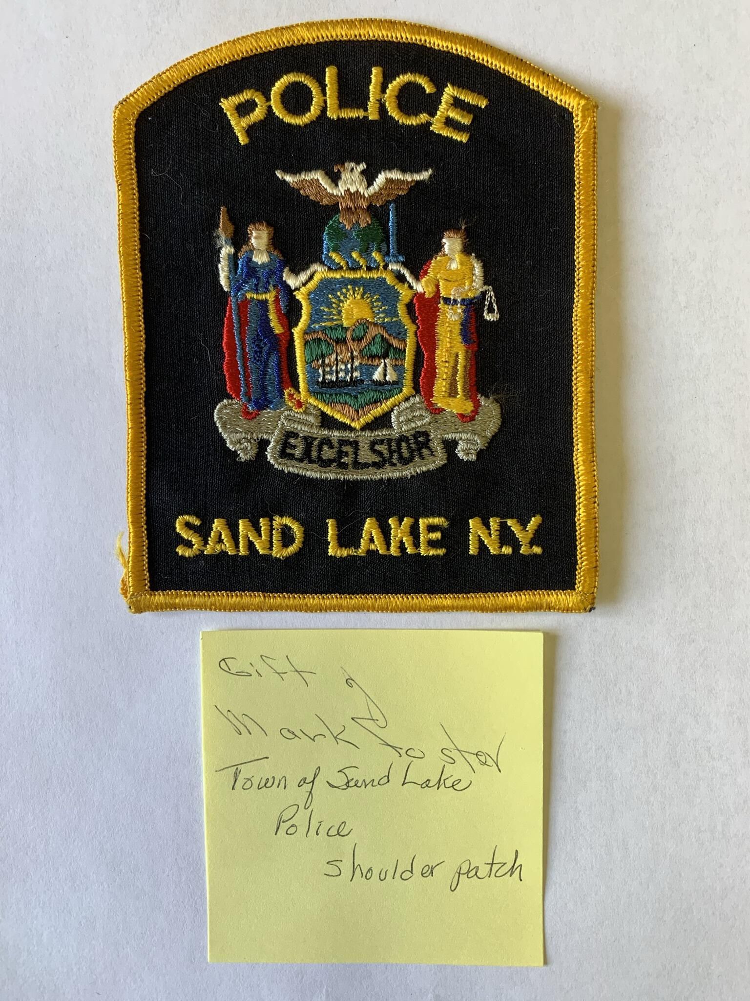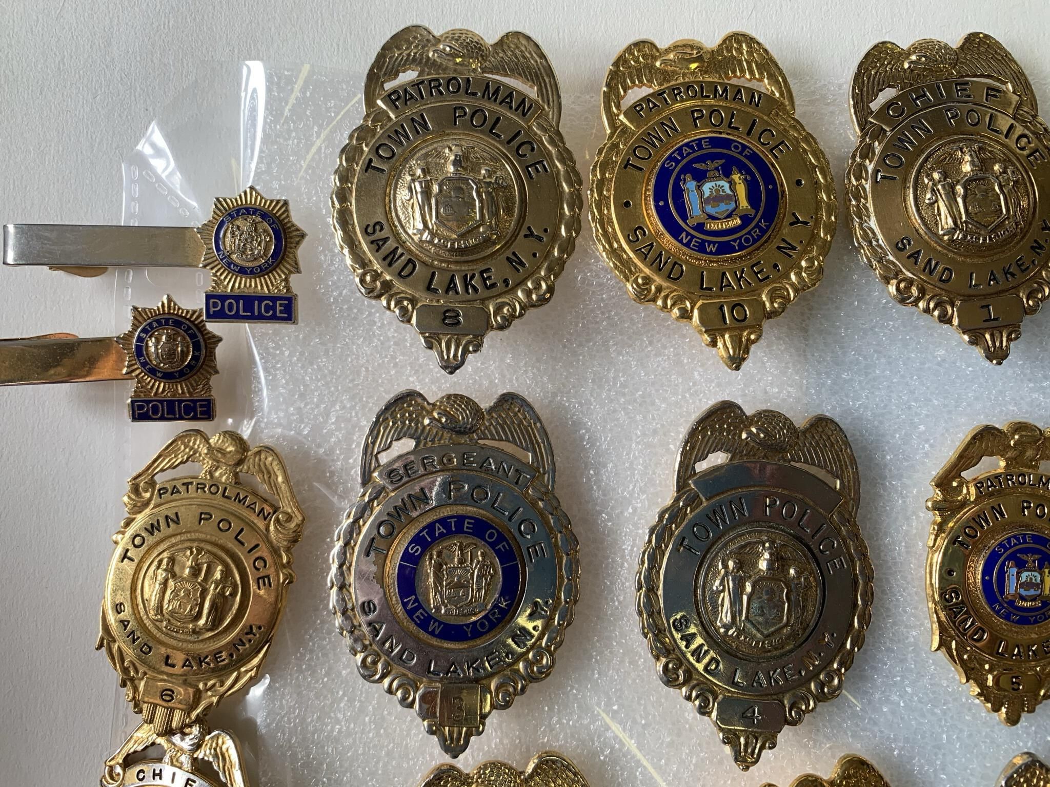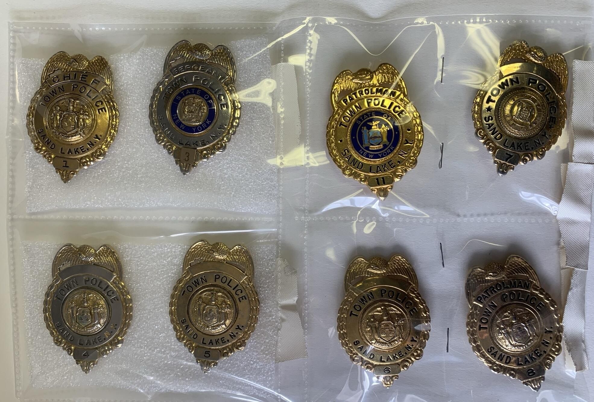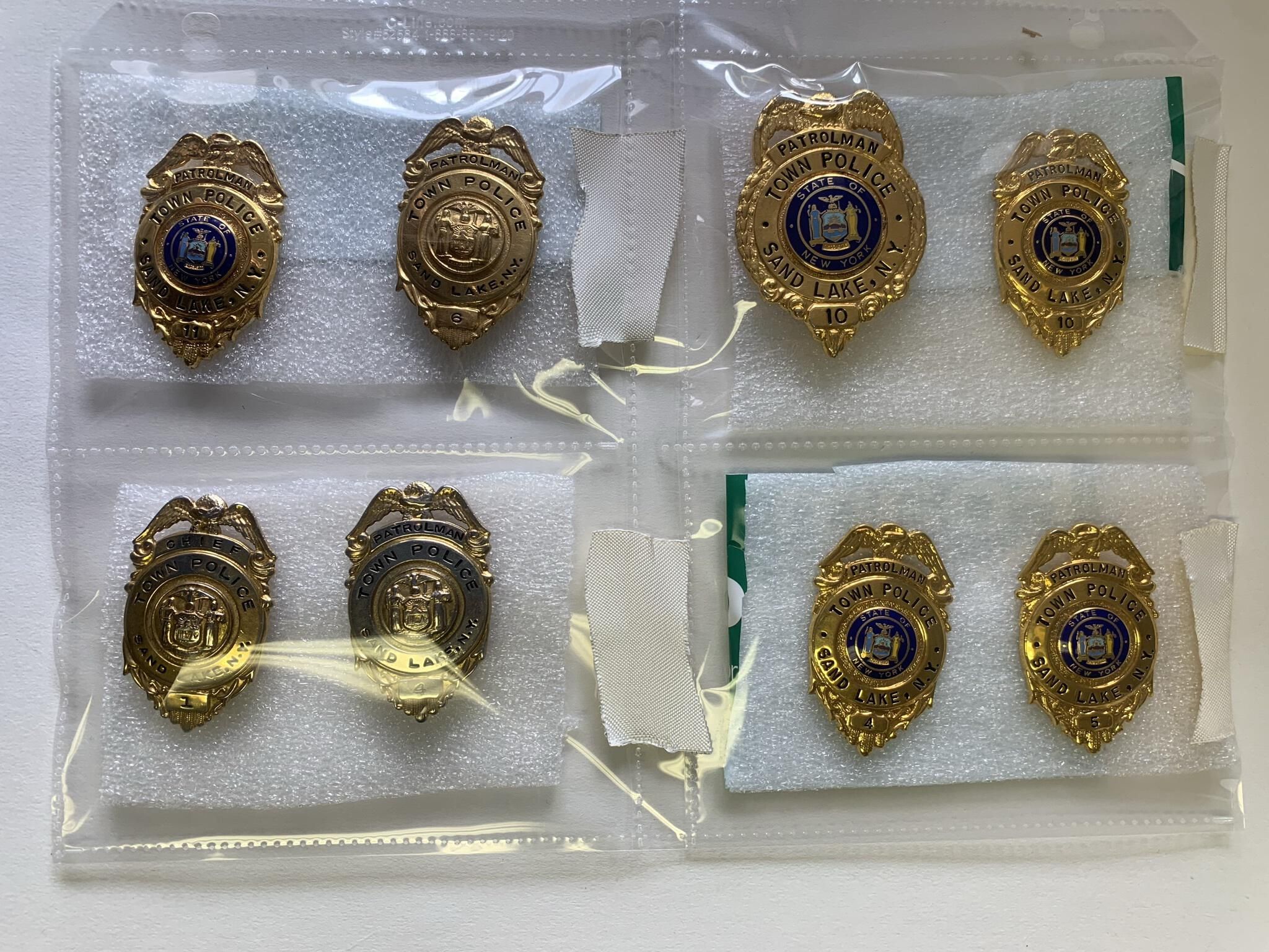 Photographs, badges and uniform items related to the former Town of Sand Lake (TOSL) Police Department. The TOSL disbanded its Police Department in favor of hosting a NYS Police sub-station at Town Hall, which is far less expensive than running its own Department. The photos and badges are stored in a binder marked, "Town of Sand Lake Police Department Photos and Badges," on the spine located in the Town Historian's Office of Town Hall. Refer to the 1st and 2nd floor Town Hall Photos and Plaques folder of this site for group and squad car photos of the former TOSL Police Department.Context