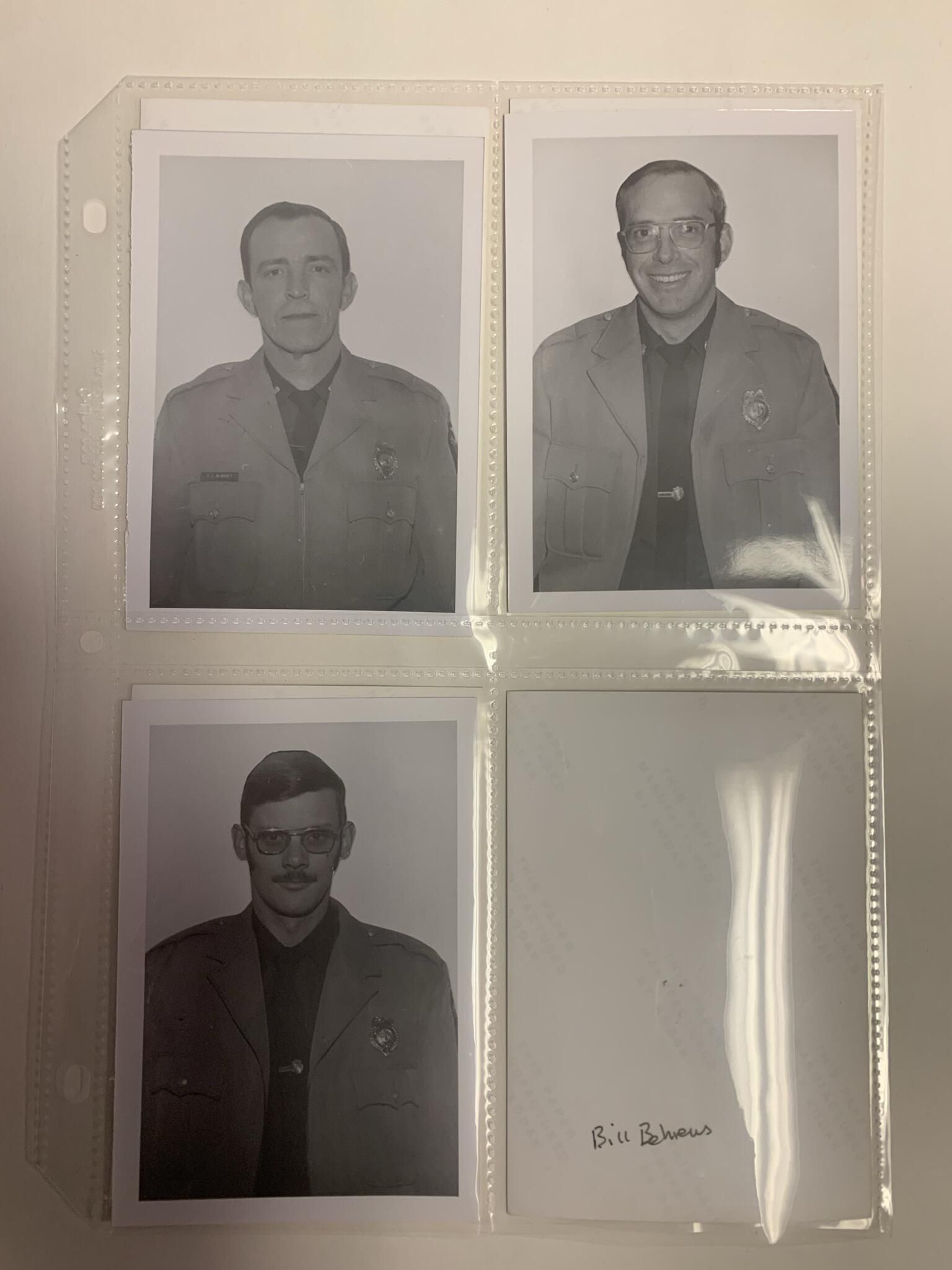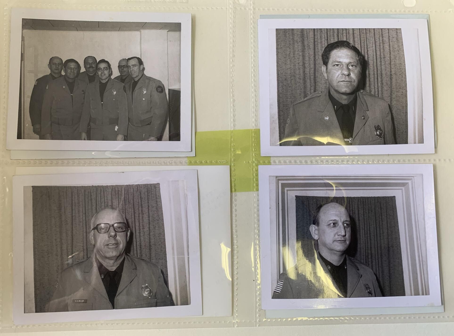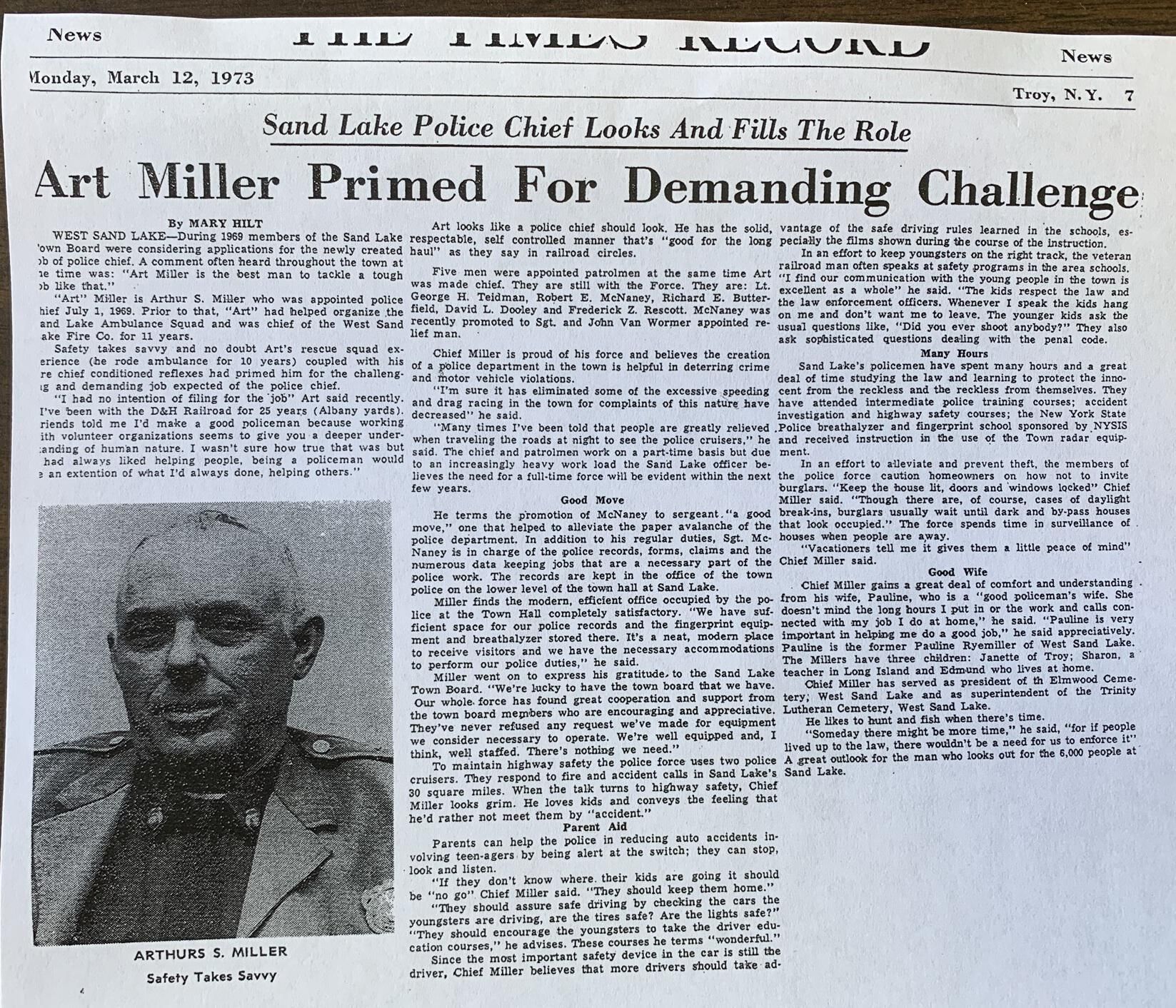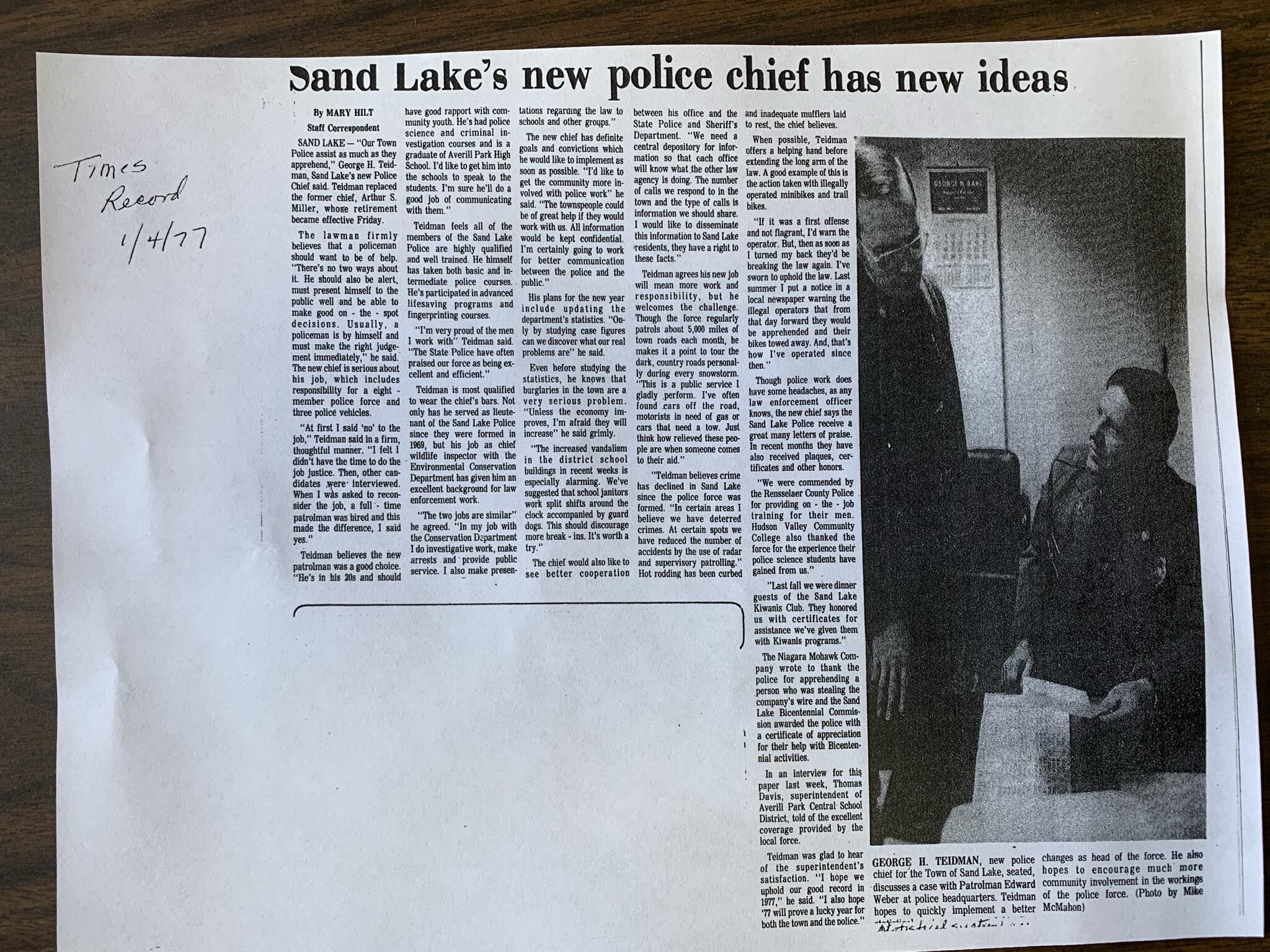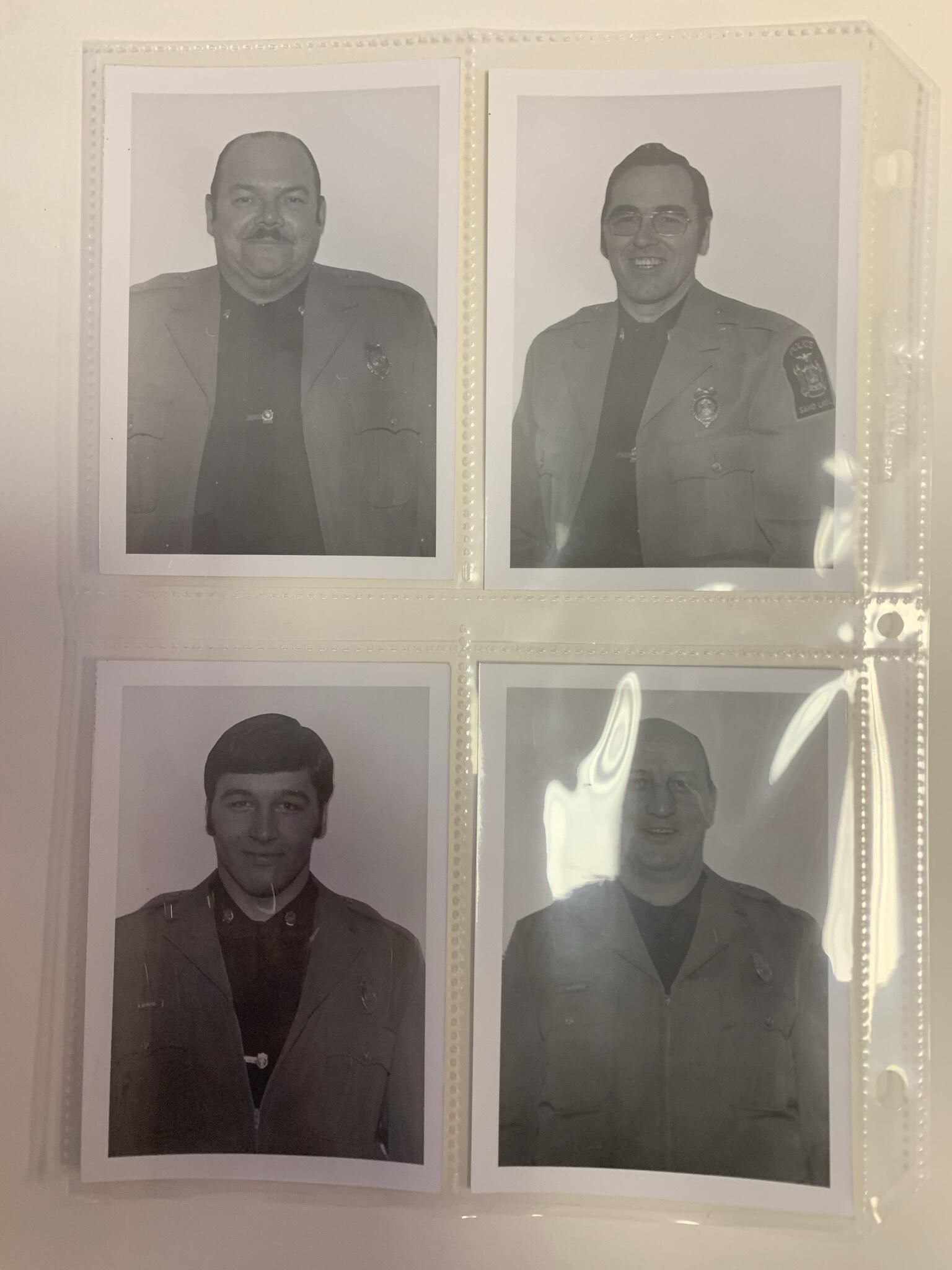 Photographs, badges and uniform items related to the former Town of Sand Lake (TOSL) Police Department. The TOSL disbanded its Police Department in favor of hosting a NYS Police sub-station at Town Hall, which is far less expensive than running its own Department. The photos and badges are stored in a binder marked, "Town of Sand Lake Police Department Photos and Badges," on the spine located in the Town Historian's Office of Town Hall. Refer to the 1st and 2nd floor Town Hall Photos and Plaques folder of this site for group and squad car photos of the former TOSL Police Department.Context