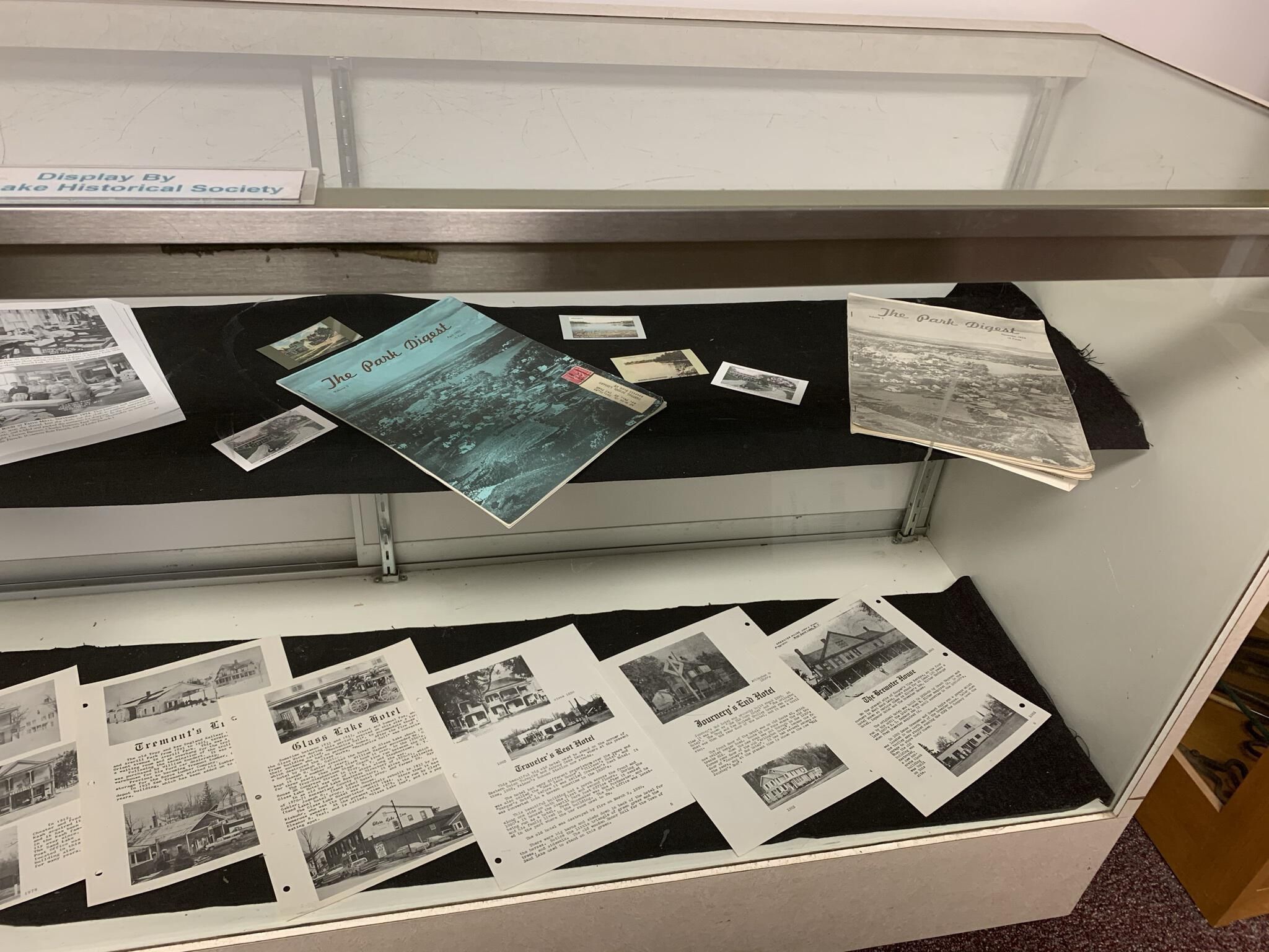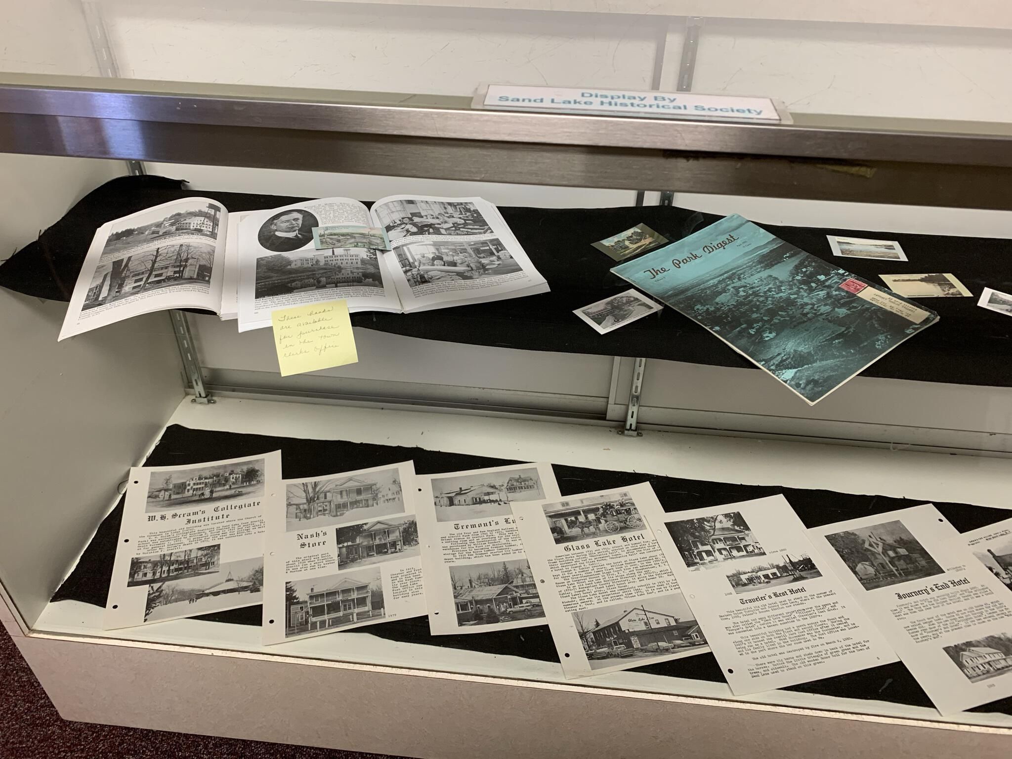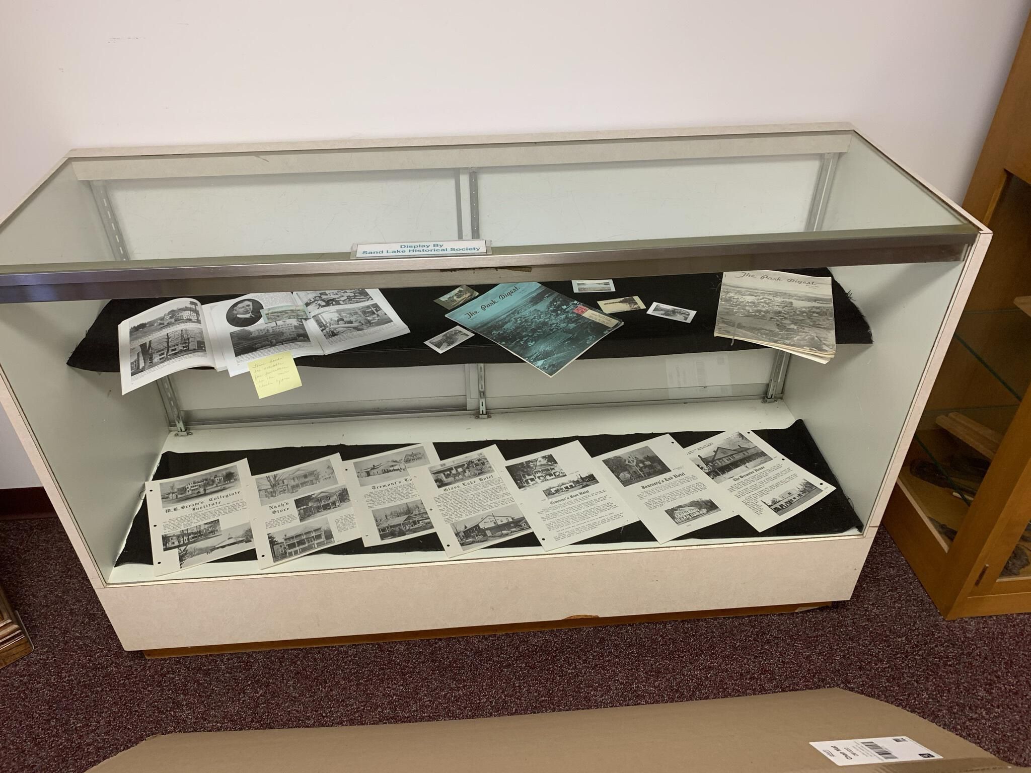 Sand Lake Historical Society (SLHS) organized display of local historic publications that appeared in the main entrance foyer of Town Hall until April of 2022. SLHS President Jackie Tremont owned the items in the display and returned them to her personal collection when the display was removed and eventually replaced by another SLHS display. However, copies of most of the items displayed in the case can be found in SLHS File Cabinet 2.Context