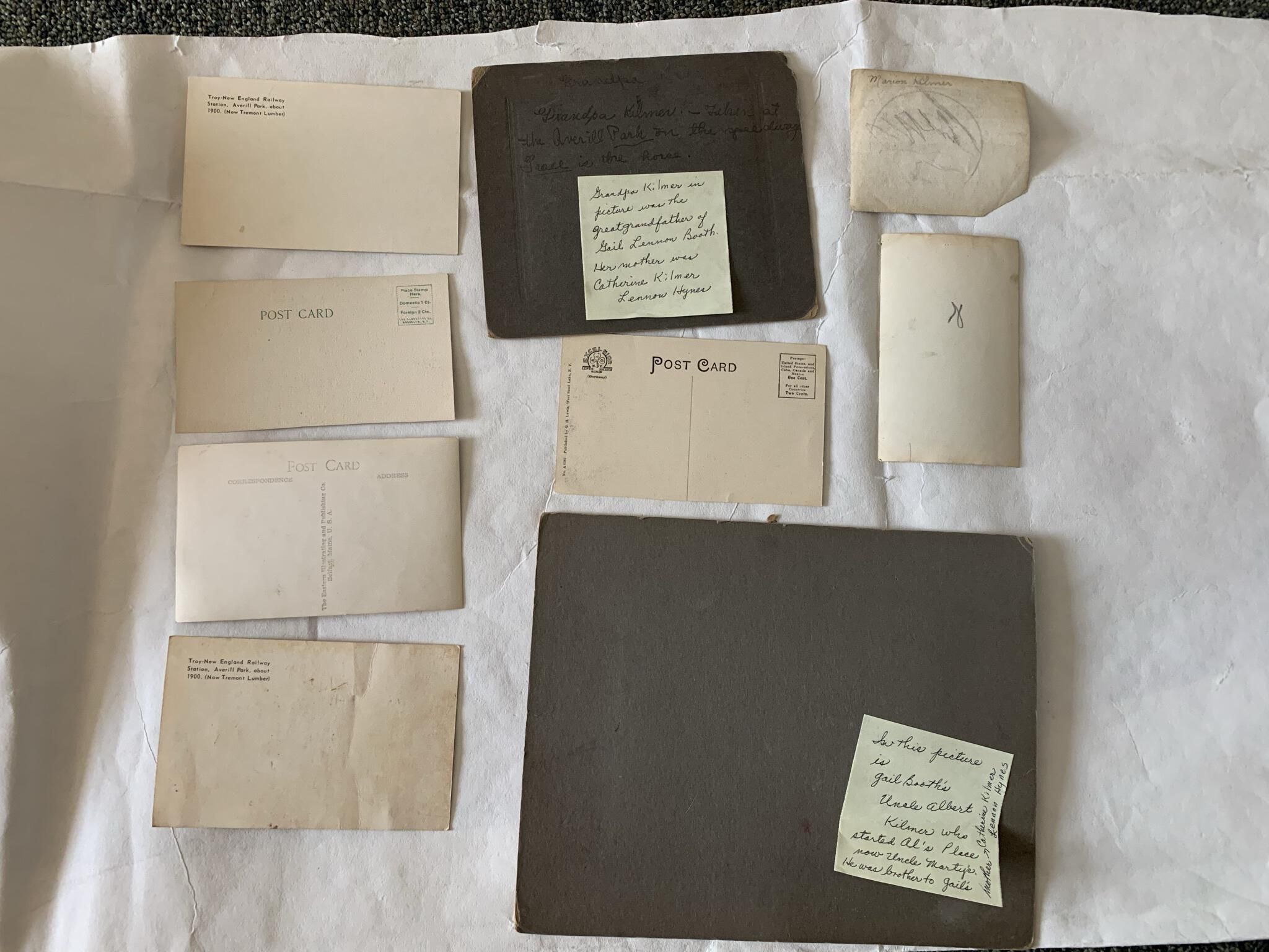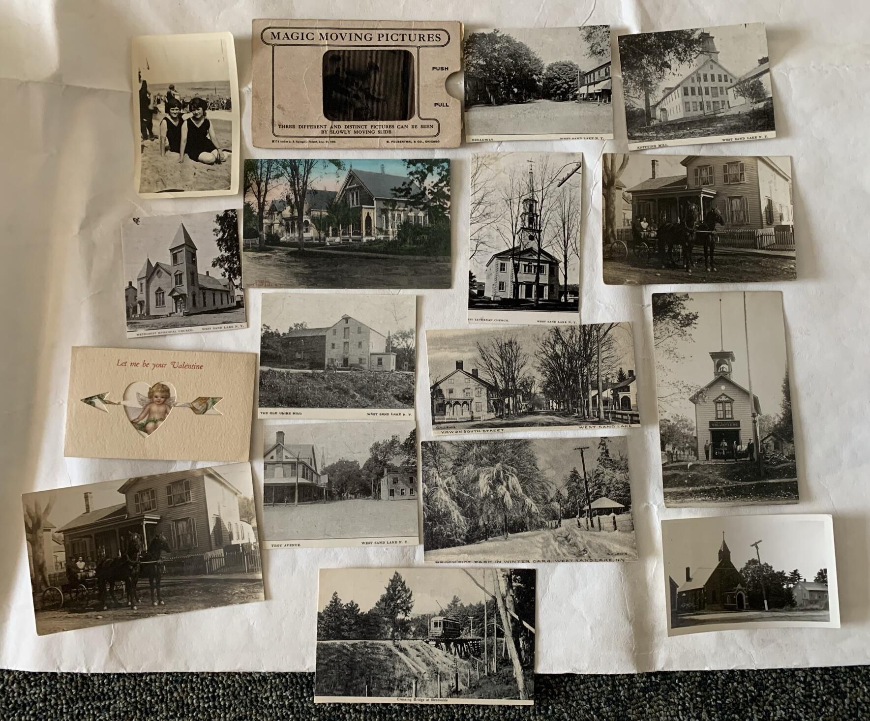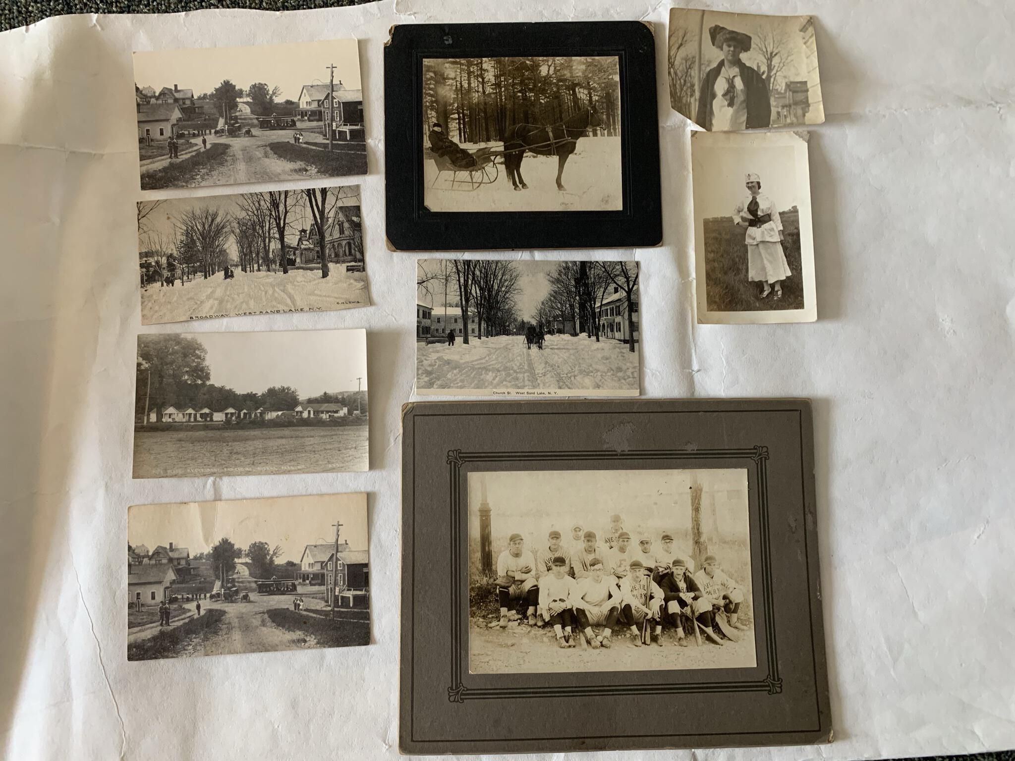 Includes homes . mills , firehouse , churches , trollies , carriages , a valentine and a magic moving pictures postcard , Fayette Thomas , Ida Hastings Thomas , Ruth Thomas, Miller , horse drawn sleigh , Broadway Street , Church Street , trolley station , Averill Park baseball team , Al's Place , blizzard , Gail Lennon Booth , Grandpa Kilmer , Albert Kilmer , Marion BoothCataloged By