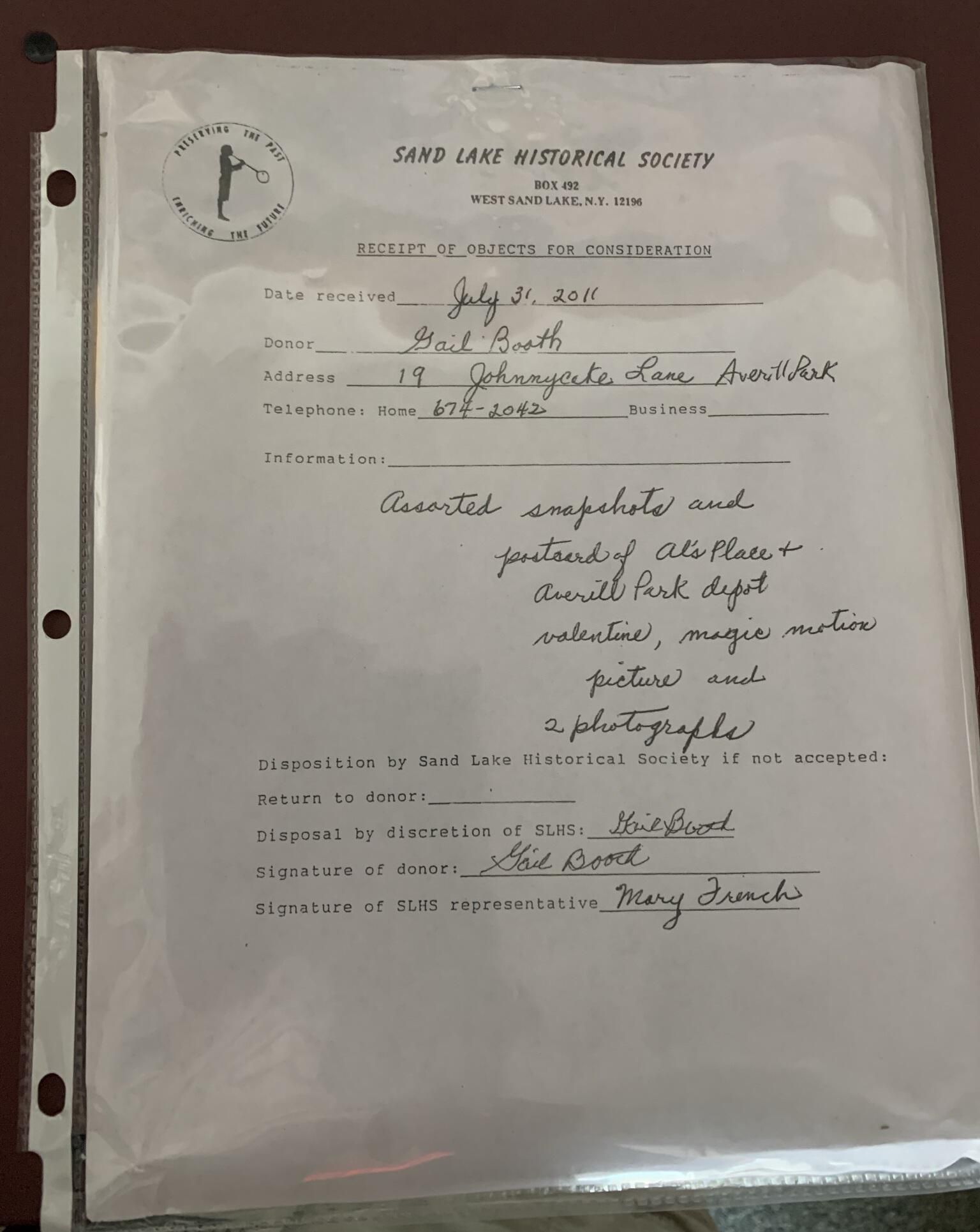 Collection of assorted postcards and photos donated to the Sand Lake Historical Society by Ms. Gail Booth in 2011. The page protector that stores the collection is stored inside the case in which SLHS Photos Binder 1 is located. Gail resided most of her life on Johnny Cake Lane in Averill Park and is pictured in this entry.Context