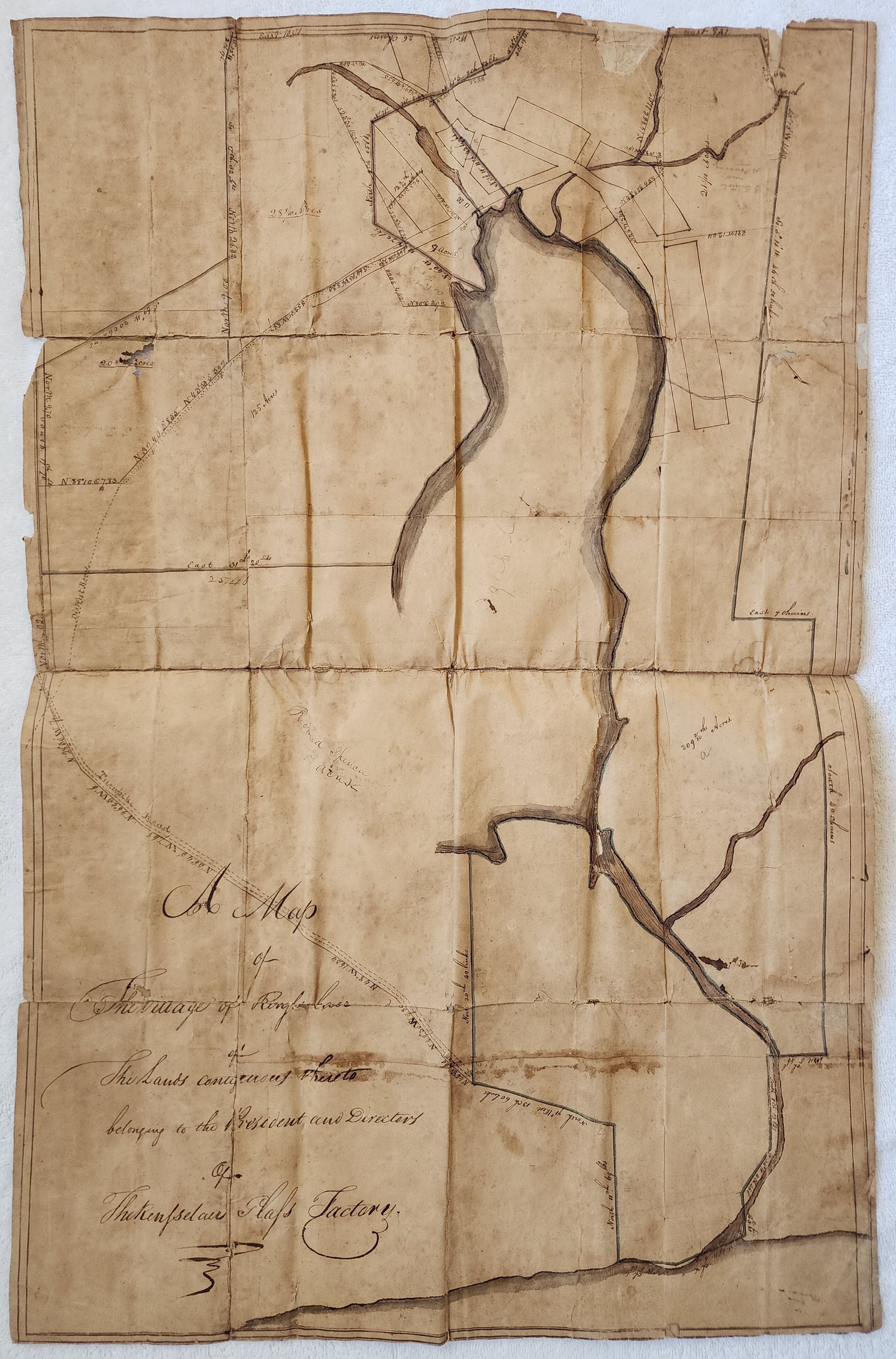 Original approximately 18" x 30" hand-drawn map on parchment of Glass Lake, the "Rensselaer Glass Factory," and its village apparently before it was called "Glass House" village. Entitled, "A Map of The Village of Rensselaer belonging to the President and Directors of the Rensselaer Glass Factory." Interestingly refers to Rensselaer Village before it became known as Glass House village which dates it to approximately 1804 to 1814. The map is part of and stored along with the "St Pierre & Shepard Faith Mills Document Collection," which additionally includes high-resolution photos of each quadrant of the map. Refer to that entry in the Faith Mills section of this system for more information.Cataloged By