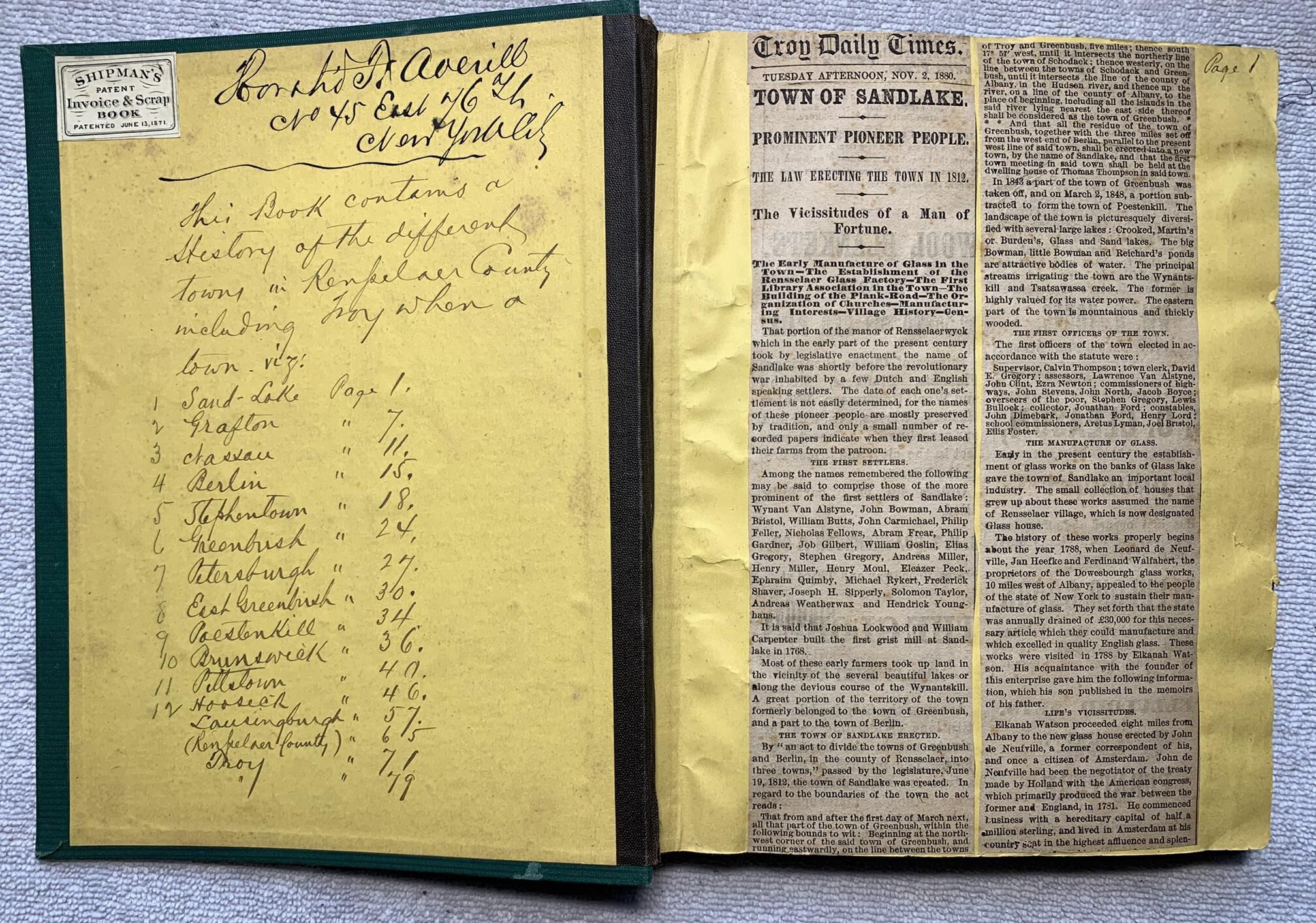 - A fifty-page PDF of a second scrapbook of newspaper articles that was similarly meticulously maintained by Horatio by his own hand spanning the period June 19, 1879, through April 19, 1881, to record a series of newspaper articles published by the Troy Daily News regarding the origin and history of the various Towns that comprise Rensselaer County and City of Troy, NY. The entries interestingly begin with a seven-page article regarding the origin and history of the Town of Sand Lake even though it was published well into the series, indicating Horatio's fondness for Sand Lake. Each article offers an excellent in-depth overview of the municipalities founding. The scrapbook was donated to the Town by Richard Seuffert in 1977 and the PDF is downloadable while fully logged into the system. Refer to the included example page for a preview of its content. A much higher resolution PDF is stored off-line and available upon request under the file name: